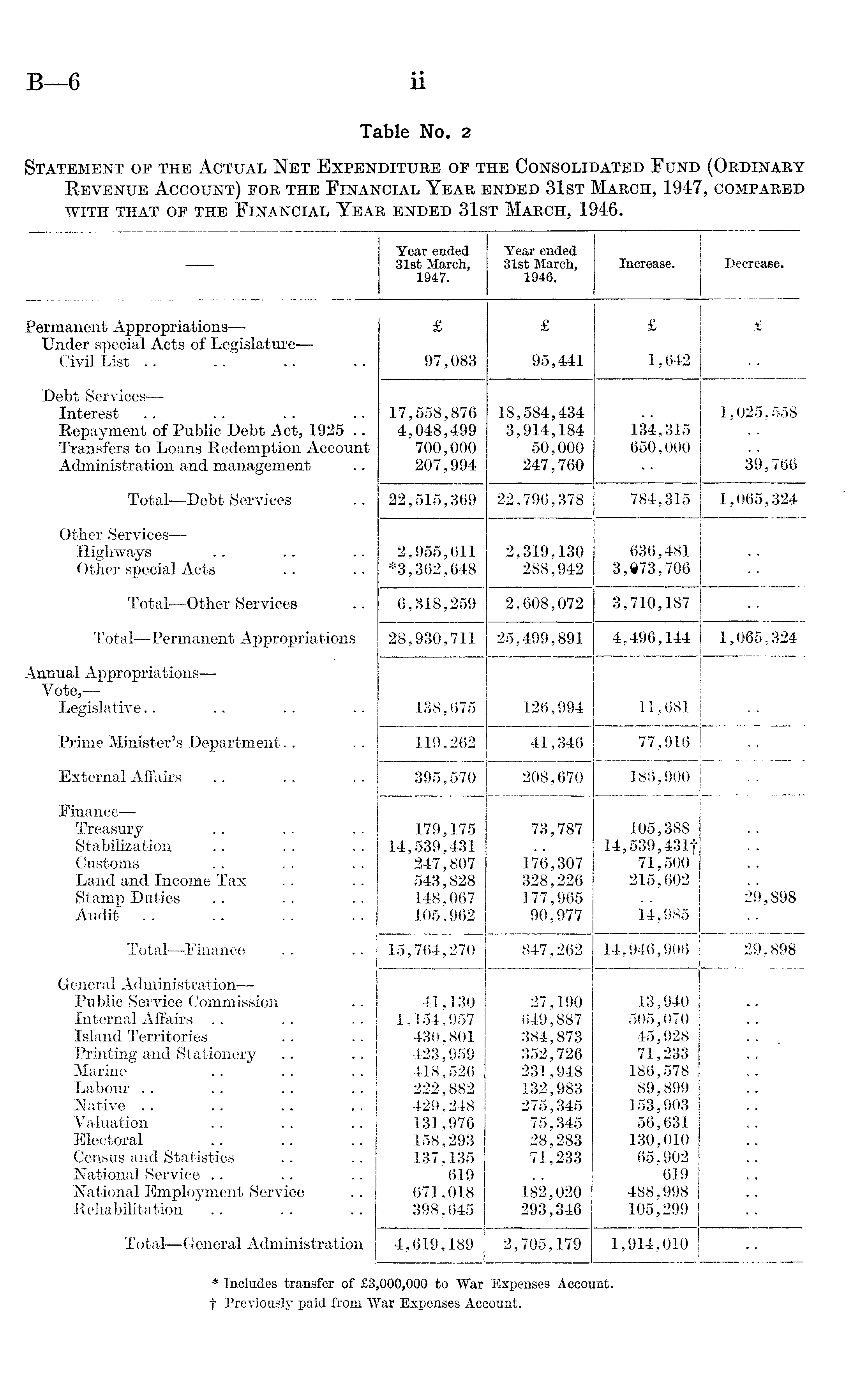 — Year ended 31st March, 1947. Tear ended 31st March, 1946. Increase. Decrease. Permanent Appropriations— Under special Acts of Legislature— Civil List £ 97,083 £ 95,441 £ 1,642 £ Debt Services — Interest Repayment of Public Debt Act, 1925 .. Transfers to Loans Redemption Account Administration and management 17,558,876 4,048,499 700,000 207,994 18,584,434 3,914,184 50,000 247,760 134,315 650,000 1,025,558 39,766 Total —Debt Services 22,515,369 22,796,378 784,315 1,065,324 Other Services — Highways Other special Acts 2,955,611 *3,362,648 2,319,130 288,942 636,481 3,973,706 Total—Other Services 6,818,259 2,608,072 3,710,187 Total—Permanent Appropriations 28,930,711 25,499,891 4,496,144 1,065,324 Annual Appropriations— Vote, — Legislative 138,675 126,994 11,681 Prime Minister's Department 119,262 41,346 77,916 External Affairs 395,570 208,670 186,900 Finance — Treasury Stabilization Customs Land and Income Tax Stamp Duties Audit 179,175 14,539,431 247,807 543,828 148,067 105,962 73,787 176,307 328,226 177,965 90,977 105,388 14,539,431f 71,500 215,602 14,985 29,898 Total —Finance 15,764,270 847,262 14,946,906 29,898 General Administration— Public Service Commission Internal Affairs Island Territories Printing and Stationery Marine Labour Native Valuation Electoral Census and Statistics National Service National Employment Service Rehabilitation 41,130 1,154,957 430,801 423,959 418,526 222,882 429,248 131,976 158,293 137,135 619 671,018 398,645 27,190 649,887 384,873 352,726 231,948 132,983 275.345 75,345 28,283 71,233 182,020 293.346 13,940 505,070 45,928 71,233 186,578 89,899 153,903 56,631 130,010 65,902 619 488,998 105,299 Total—General Administration 4,619,189 2,705,179 1,914,010 * Includes transfer of £3,000,000 to War Expenses Account, t Previously paid from War Expenses Account.