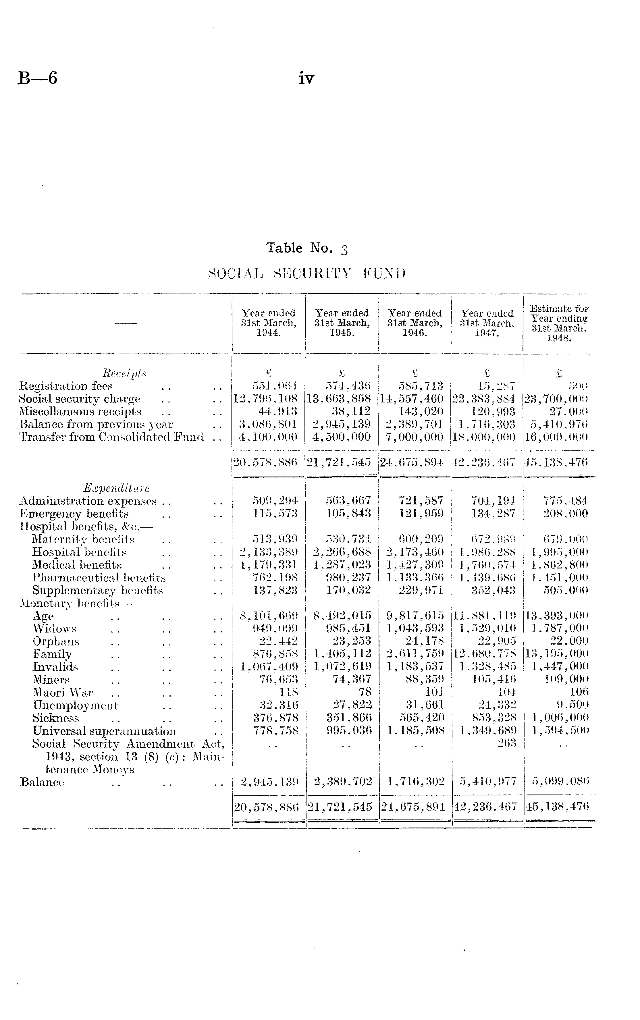 — Year ended 31st March, 1944. Year ended 31st March, 1945. Year ended 31st March, 1946. Year ended 31st March, 1947. Estimate for Year ending 31st March, 1948. Receipts Registration fees Social security charge Miscellaneous receipts Balance from previous year Transfer from Consolidated Fund .. Expenditure Administration expenses Emergency benefits Hospital benefits, &c.— Maternity benefits Hospital benefits Medical benefits Pharmaceutical benefits Supplementary benefits Monetary benefits — Age Widows Orphans Family Invalids Miners Maori War Unemployment Sickness Universal superannuation Social Security Amendment Act, 1943, section 13 (8) (c): Maintenance Moneys Balance £ 551,064 12,796,108 44,913 3,086,801 4,100,000 £ 574,436 13,663,858 38,112 2,945,139 4,500,000 £ 585,713 14,557,460 143,020 2,389,701 7,000,000 £ 15,287 22,383,884 120,993 1,716,303 18,000,000 £ 500 23,700,000 27,000 5,410,976 16,000,000 20,578,886 21,721,545 24,675,894 42,236,467 l 45,138,476 509,294 115,573 513,939 2,133,389 1,179,331 762,198 137,823 8,101,669 949,099 22,442 876,858 1,067,409 76,653 118 32,316 376,878 778,758 2,945,139 563,667 105,843 530,734 2,266,688 1,287,023 980,237 170,032 8,492,015 985,451 23,253 1,405,112 1,072,619 74,367 78 27,822 351,866 995,036 2,389,702 721,587 121,959 600,209 2,173,460 1,427,309 1.133,366 229,971 9,817,615 1,043,593 24,178 2,611,759 1,183,537 88,359 101 31,661 565,420 1,185,508 1,716,302 704,194 134,287 672,989 1,986,288 1,760,574 1,439,686 352,043 11,881,119 1,529,010 22,905 12,680,778 1,328,485 105,416 104 24,332 853,328 1,349,689 263 5,410,977 775,484 208,000 679,000 1,995,000 1,862,800 1,451,000 505,000 13,393,000 1,787,000 22,000 13,195,000 1,447,000 109,000 106 9,500 1,006,000 1,594,500 5,099,086 20,578,886 21,721,545 24,675,894 42,236,467 45,138,476
