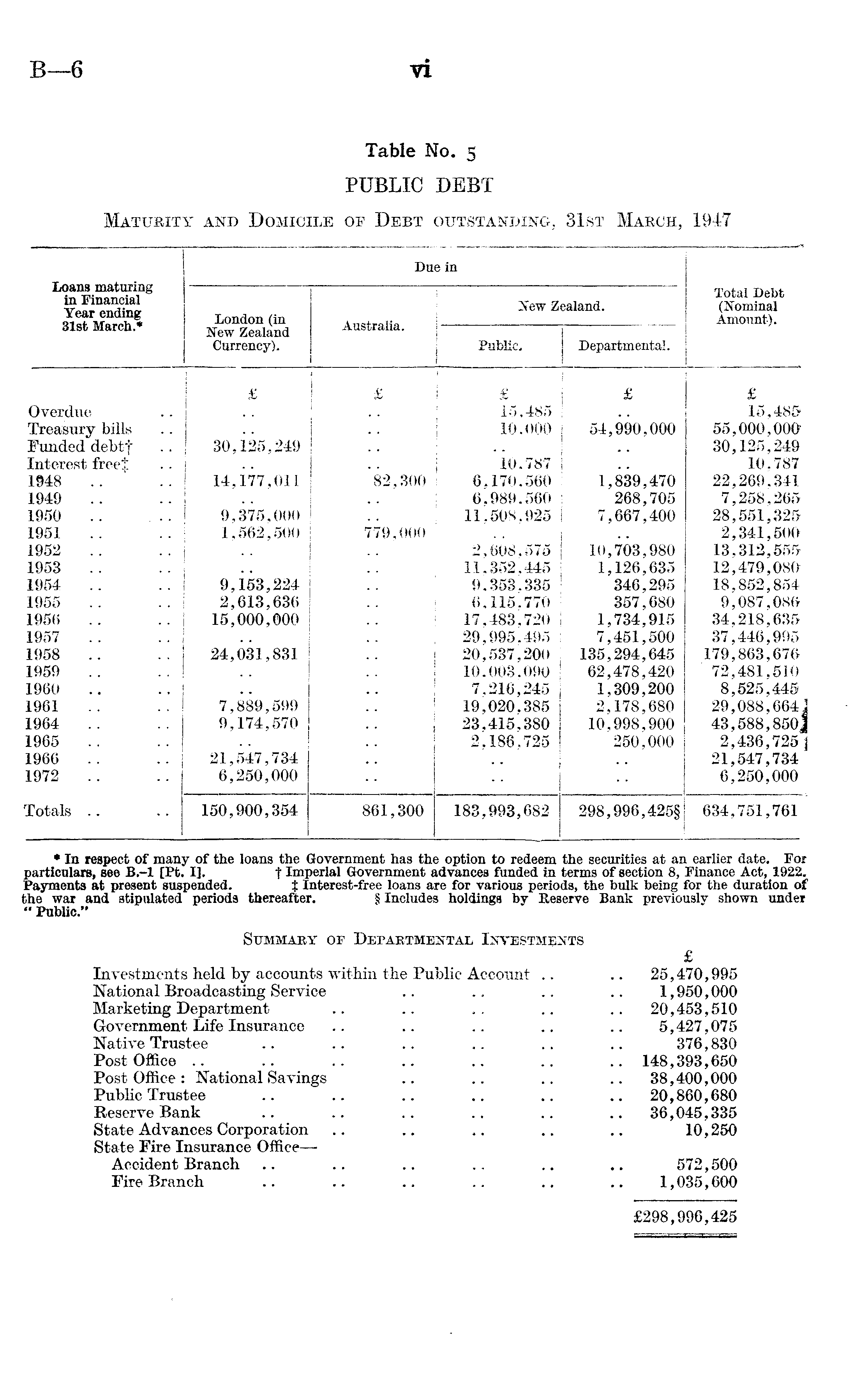 Due in Loans maturing in Financial Year ending 31sfc March * London (in Australia. New Zealand. Total Debt (Nominal Amount). Slew Zealand Currency). Public. Departmental. ; £ £ ! £ £ £ Overdue 15,485 15,485 Treasury bills 10,000 54,990,000 55,000,000 Funded debtf 30,125,249 30,125,249 Interest freet 10,787 10,787 1948 14,1.77,011 '82,300 6,170,560 1,839,470 22,269,341 1949 ! 6,989.560 268,705 7,258,265 1950 9,375,000 | 11,508,925 7,667,400 28,551,325 1951 1,562,500 779,000 2,341,500 1952 2,608,575 10,703,980 13,312,555 1953 1 11,352,445 1,126,635 12,479,080 1954 9,i53,224 9,353,335 346,295 18,852,854 1955 2,613,636 6,115,770 357,680 9,087,086 1956 15,000,000 17,483,720 1,734,915 34,218,635 1957 29,995,495 7,451,500 37,446,995 1958 24,031,831 20,537,200 135,294,645 179,863,676 1959 10,003,090 62,478,420 72,481,510 1960 7,216,245 1,309,200 8,525,445 1961 7,889,599 19,020,385 2,178,680 29,088,664j 1964 9,174,570 23,415,380 10,998,900 43,588,850J 1965 2,186,725 250,000 2,436,725| 1966 21,547,734 21,547,734 1972 6,250,000 6,250,000 Totals .. 150,900,354 861,300 183,993,682 298,996,425§ 634,751,761 ♦ In respect of many of the loans the Government has the option to redeem the securities at an earlier date. For particulars, see B.-l [Pt. I]. t Imperial Government advances funded in terms of section 8, Finance Act, 1922. Payments at present suspended. i Interest-free loans are for various periods, the bulk being for the duration of the war and stipulated periods thereafter. § Includes holdings by Reserve Bank previously shown under " Public."