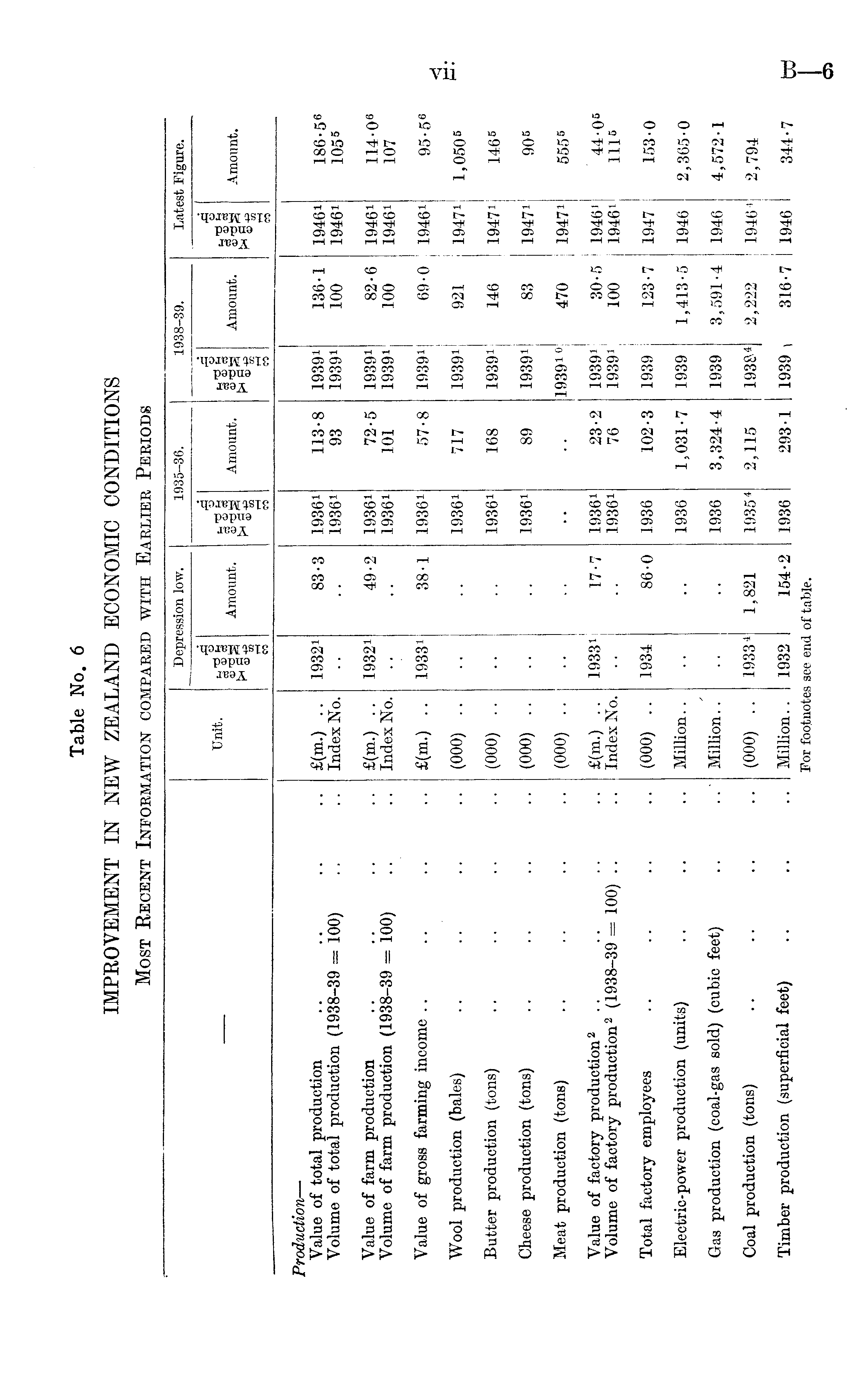 — Unit. Depression low. 1935-36. 1938-39. Latest Figure. Year ended 31st March. Amount. Year ended 31st March. Amount. Year ended 31st March. Amount. Year ended 31st March. Amount. Production — Value of total production £(m.) .. 19321 83-3 1936 1 113-8 19391 136-1 19461 186-5 6 Volume of total production (1938-39 = 100) Index No. 1936 1 93 19391 100 19461 105 s Value of farm production £(m.) .. 1932 1 49-2 1936 1 72-5 19391 82-6 19461 114-0 8 Volume of farm production (1938-39 = 100) Index No. 19361 101 19391 100 19461 107 Value of gross farming income £(m.) .. 1933 1 38-1 1936 1 57-8 19391 69-0 19461 95-5 6 Wool production (bales) (000) .. 1936 1 717 19391 921 19471 1,050 5 Butter production (tons) (000) .. 1936 1 168 19391 146 19471 146 6 Cheese production (tons) (000) .. 1936 1 89 19391 83 19471 90 s Meat production (tons) (000) .. 19391 0 470 19471 555 5 Value of factory production 2 £(m.) .. 1933 1 17-7 1936 1 23-2 19391 30-5 1946 1 44-05 Volume of factory production 2 (1938-39 = 100) Index No. 19361 76 19391 100 19461 His Total factory employees (000) .. 1934 86-0 1.936 102-3 1939 123-7 1947 153-0 Electric-power production (units) Million.. 1936 1,031-7 1939 1,413-5 1946 2,365-0 Gas production (coal-gas sold) (cubic feet) Million.. 1936 3,324-4 1939 3,591-4 1946 4,572-1 Coal production (tons) (000) .. 1933 4 1,821 1935 4 2,115 1938> 4 2,222 1946 4 2,794 Timber production (superficial feet) Million.. 1932 154-2 1936 293-1 1939 1 316-7 1946 344-7 For footnotes see end of table.