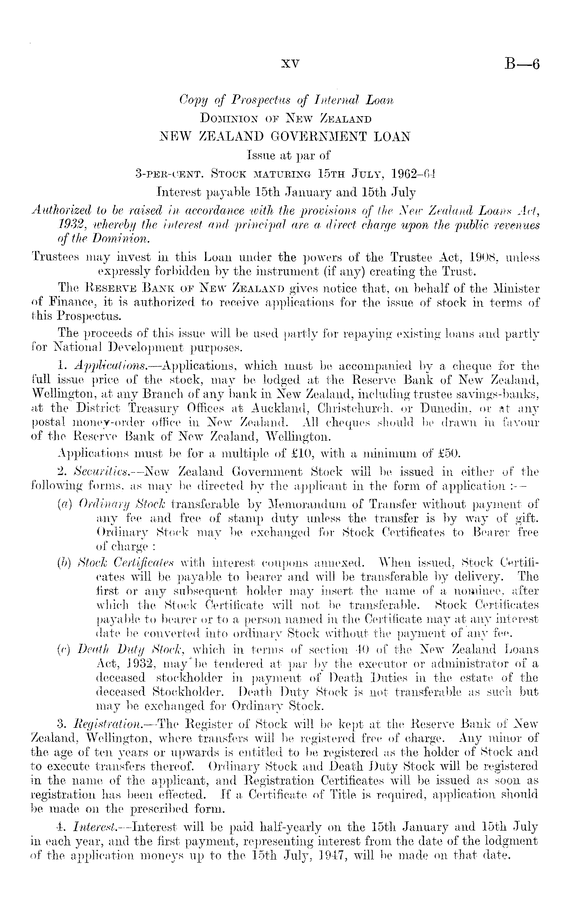 Copy of Prospectus of Internal Loan Dominion of New Zealand NEW ZEALAND GOVERNMENT LOAN Issue at par of 3-per-cent. Stock maturing 15th July, 1962-64 Interest payable 15th January and 15th July Authorized to be raised in accordance with the provisions of the New Zealand Loans Act, 1932, ivhereby the interest and principal are a direct charge upon the public revenues of the Dominion. Trustees may invest in this Loan under the powers of the Trustee Act, 1908, unless expressly forbidden by the instrument (if any) creating the Trust. The Reserve Bank op New Zealand gives notice that, on behalf of the Minister of Finance, it is authorized to receive applications for the issue of stock in terms of this Prospectus. The proceeds of this issue will be used partly for repaying existing loans and partly for National Development purposes. 1. Applications.—Applications, which must be accompanied by a cheque for the full issue price of the stock, may be lodged at the Reserve Bank of New Zealand, Wellington, at any Branch of any bank in New Zealand, including trustee savings-banks, a,t the District Treasury Offices at Auckland, Christchurch, or Dunedin, or at any postal money-order office in New Zealand. All cheques should be drawn in favour of the Reserve Bank of New Zealand, Wellington. Applications must be for a multiple of £lO, with a minimum of £5O. 2. Securities.—New Zealand Government Stock will be issued in either of the following forms, as may be directed by the applicant in the form of application : (a) Ordinary Stock transferable by Memorandum of Transfer without payment of any fee and free of stamp duty unless the transfer is by way of gift. Ordinary Stock may be exchanged for Stock Certificates to Bearer free of charge : (b) StocJc Certificates with interest coupons annexed. When issued, Stock Certificates will be payable to bearer and will be transferable by delivery. The first or any subsequent holder may insert the name of a .nominee, after which the Stock Certificate will not be transferable. Stock Certificates payable to bearer or to a person named in the Certificate may at any interest date be converted into ordinary Stock without the payment of any fee. (c) Death Duty Stock, which in terms of section 40 of the New Zealand Loans Act, 1932, may'be tendered at par by the executor or administrator of a deceased stockholder in payment of Death Duties in the estate of the deceased Stockholder. Death Duty Stock is not transferable as such but may be exchanged for Ordinary Stock. 3. Registration.—The Register of Stock will be kept at the Reserve Bank of New Zealand, Wellington, where transfers will be registered free of charge. Any minor of the age of ten years or upwards is entitled to be registered as the holder of Stock and to execute transfers thereof. Ordinary Stock and Death Duty Stock will be registered in the name of the applicant, and Registration Certificates will be issued as soon as registration has been effected. If a Certificate of Title is required, application should be made on the prescribed form. 4. Interest. —Interest will be paid half-yearly on the 15th January and 15th July in each year, and the first payment, representing interest from the date of the lodgment of the application moneys up to the 15th July, 1947, will be made on that date.