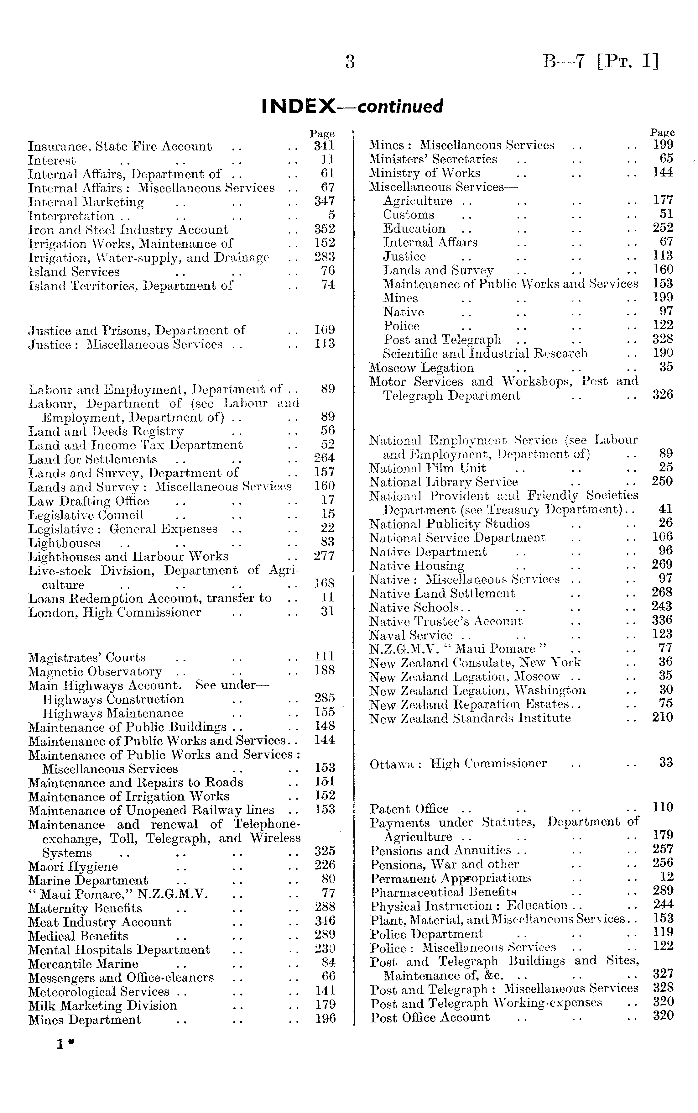 Page Mines: Miscellaneous Services .. .. 199 Ministers' Secretaries .. .. .. 65 Ministry of Works .. .. .. 144 Miscellaneous Services — Agriculture .. .. .. .. 177 Customs .. .. .. 51 Education .. .. .. .. 252 Internal Affairs .. .. .. 67 Justice .. .. .. .. 113 Lands and Survey .. .. .. 160 Maintenance of Public Works and Services 153 Mines .. .. .. .. 199 Native .. .. .. 97 Police .. .. .. .. 122 Post and Telegraph .. .. .. 328 Scientific and Industrial Research .. 190 Moscow Legation .. .. .. 35 Motor Services and Workshops, Post and Telegraph Department .. .. 326 National Employment Service (see Labour and Employment, Department of) .. 89 National Film Unit .. .. 25 National Library Service .. .. 250 National Provident and Friendly Societies Department (see Treasury Department).. 41 National Publicity Studios .. .. 26 National Service Department .. .. 106 Native Department .. .. 96 Native Housing .. •. - • 269 Native: Miscellaneous Services .. .. 97 Native Land Settlement .. .. 268 Native Schools.. .. .. .. 243 Native Trustee's Account .. .. 336 Naval Service .. .. - • • • 123 N.Z.G.M.V. " Maui Pomare" .. 77 New Zealand Consulate, New York .. 36 New Zealand Legation, Moscow .. .. 35 New Zealand Legation, Washington .. 30 New Zealand Reparation Estates.. .. 75 New Zealand Standards Institute .. 210 Ottawa: High Commissioner .. .. 33 Patent Office .. .. • • • • HO Payments under Statutes, Department of Agriculture .. .. • • • • 179 Pensions and Annuities .. .. . • 257 Pensions, War and other .. .. 256 Permanent Appropriations .. .. 12 Pharmaceutical Benefits .. . • 289 Physical Instruction : Education .. .. 244 Plant, Material, and Miscellaneous Services.. 153 Police Department .. .. .. 119 Police: Miscellaneous Services .. -. 122 Post and Telegraph Buildings and Sites, Maintenance of, &c. .. .. .. 327 Post and Telegraph : Miscellaneous Services 328 Post and Telegraph Working-expenses .. 320 Post Office Account .. .. .. 320