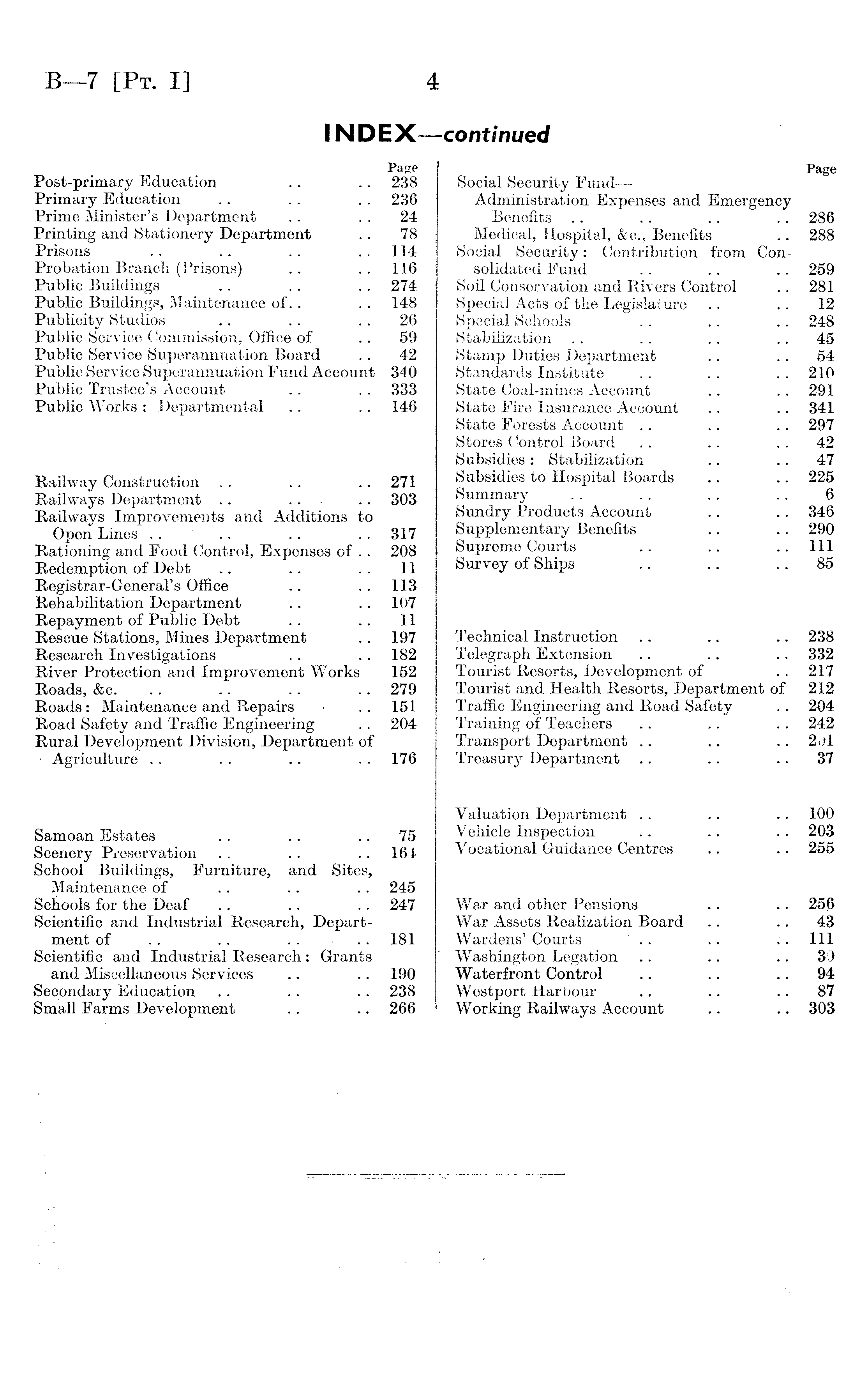 Page Post-primary Education .. .. 238 Primary Education .. .. .. 236 Prime Minister's Department .. .. 24 Printing and Stationery Department .. 78 Prisons .. .. .. 114 Probation Branch (Prisons) .. .. 116 Public Buildings .. .. .. 274 Public Buildings, Maintenance of.. .. 148 Publicity Studios .. .. .. 26 Public Service Commission, Office of .. 59 Public Service Superannuation Board .. 42 Public Service Superannuation Fund Account 340 Public Trustee's Account .. .. 333 Public Works: Departmental .. .. 146 Railway Construction .. .. ... 271 Railways Department .. .. .. 303 Railways Improvements and Additions to Open Lines .. .. .. .. 317 Rationing and Food Control, Expenses of .. 208 Redemption of Debt .. .. .. 11 Registrar-General's Office .. .. 113 Rehabilitation Department .. .. 107 Repayment of Public Debt .. .. 11 Rescue Stations, Mines Department .. 197 Research Investigations .. .. 182 River Protection and Improvement Works 152 Roads, &c. .. .. .. .. 279 Roads: Maintenance and Repairs • .. 151 Road Safety and Traffic Engineering .. 204 Rural Development Division, Department of • Agriculture .. .. .. .. 176 Samoan Estates .. .. .. 75 Scenery Preservation .. .. .. 164 School Buildings, Furniture, and Sites, Maintenance of .. .. .. 245 Schools for the Deaf .. .. .. 247 Scientific and Industrial Research, Department of .. .. 181 Scientific and Industrial Research: Grants and Miscellaneous Services .. .. 190 Secondary Education .. .. .. 238 Small Farms Development .. .. 266
