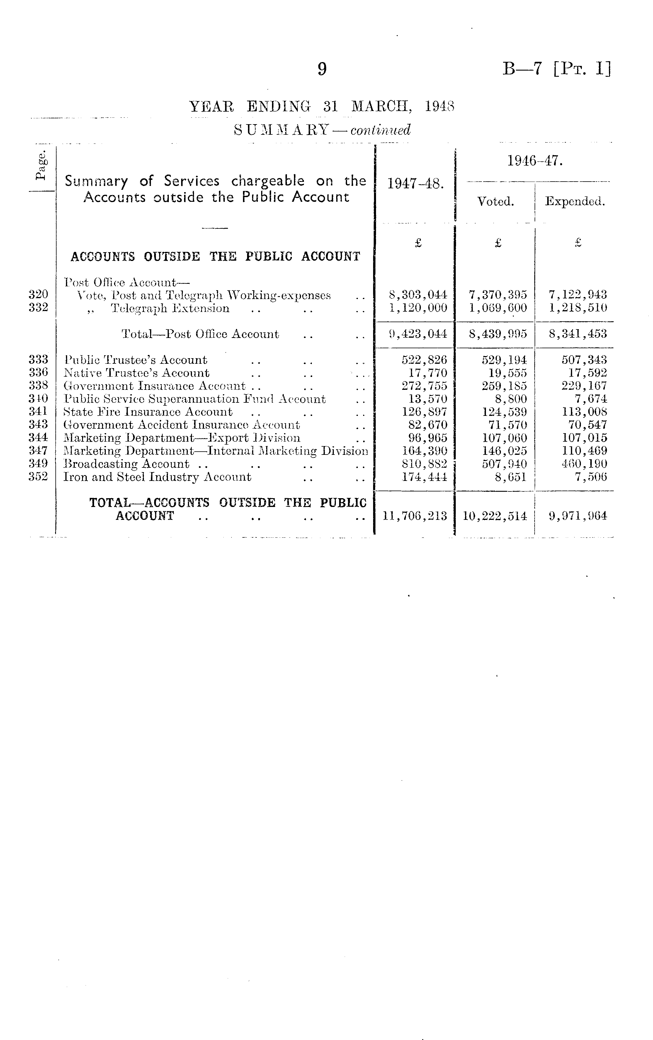 . bD tS Pw Summary of Services chargeable on the Accounts outside the Public Account 1947-48. 1946-47. Voted. Expended. ACCOUNTS OUTSIDE THE PUBLIC ACCOUNT £ £ £ 320 332 Post Office Account — Vote, Post and Telegraph Working-expenses „ Telegraph Extension 8,303,044 1,120,000 7,370,395 1,069,600 7,122,943 1,218,510 Total —Post Office Account 9,423,044 8,439,995 8,341,453 333 336 338 340 341 343 344 347 349 352 Public Trustee's Account Native Trustee's Account .. .. ... Government Insurance Account Public Service Superannuation Fund Account State Fire Insurance Account Government Accident Insurance Account Marketing Department—Export Division Marketing Department—Internal Marketing Division Broadcasting Account Iron and Steel Industry Account 522,826 17,770 272,755 13,570 126,897 82,670 96,965 164,390 810,882 174,444 529,194 19,555 259,185 8,800 124,539 71,570 107,060 146,025 507,940 8,651 507,343 17,592 229,167 7,674 113,008 70,547 107,015 110,469 460,190 7,506 TOTAL—ACCOUNTS OUTSIDE THE PUBLIC ACCOUNT 11,706,213 10,222,514 9,971,964