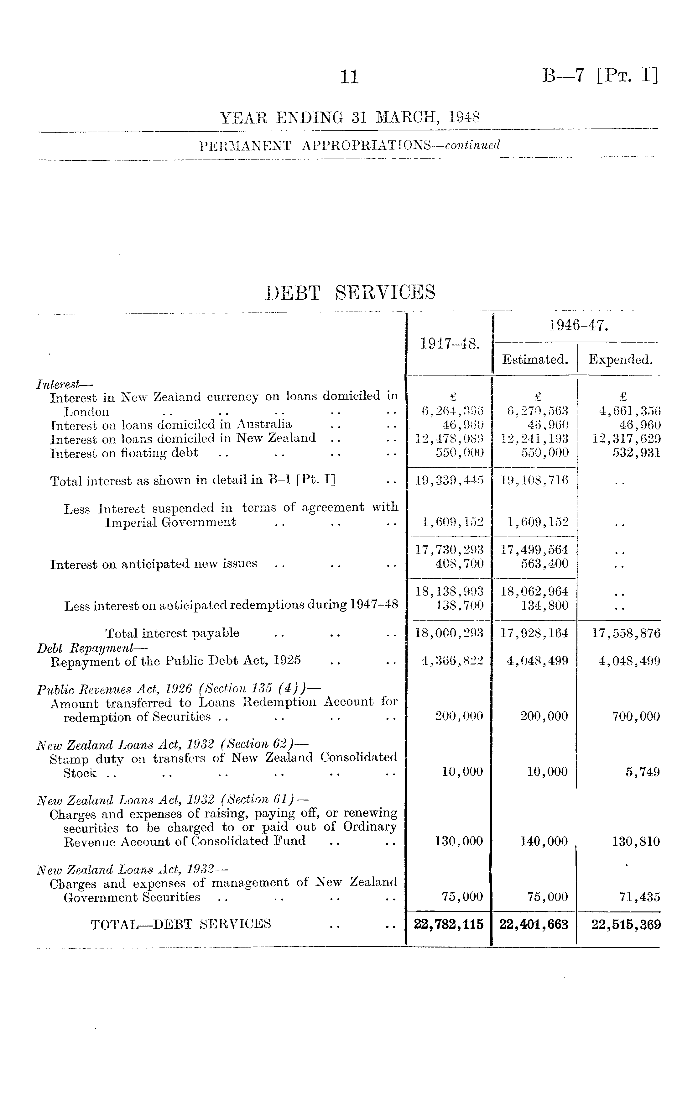 DEBT SERVICES 1947-48. 1946-47. Estimated. Expended. Interest— Interest in New Zealand currency on loans domiciled in London .. .. . • Interest on loans domiciled in Australia Interest on loans domiciled in New Zealand Interest on floating debt £ 6,264,396 46,960 12,478,089 550,000 £ 6,270,563 46,960 12,241,193 550,000 £ 4,661,356 46,960 12,317,629 532,931 Total interest as shown in detail in B-l [Pt. I] 19,339,445 19,108,716 Less Interest suspended in terms of agreement with Imperial Government 1,609,152 1,609,152 Interest on anticipated new issues 17,730,293 408,700 17,499,564 563,400 Less interest on anticipated redemptions during 1947-48 18,138,993 138,700 18,062,964 134,800 Total interest payable Debt Repayment— Repayment of the Public Debt Act, 1925 18,000,293 4,366,822 17,928,164 4,048,499 17,558,876 4,048,499 Public Revenues Act, 1926 (Section 135 (4) ) — Amount transferred to Loans Redemption Account for redemption of Securities 200,000 200,000 700,000 New Zealand Loans Act, 1932 ( Sectioyi 62) — Stamp duty on transfers of New Zealand Consolidated Stock 10,000 10,000 5,749 New Zealand Loans Act, 1932 (Section 61) — Charges and expenses of raising, paying off, or renewing securities to be charged to or paid out of Ordinary Revenue Account of Consolidated Fund 130,000 140,000 130,810 New Zealand Loans Act, 1932 — Charges and expenses of management of New Zealand Government Securities 75,000 75,000 71,435 TOTAL—DEBT SERVICES 22,782,115 22,401,663 22,515,369