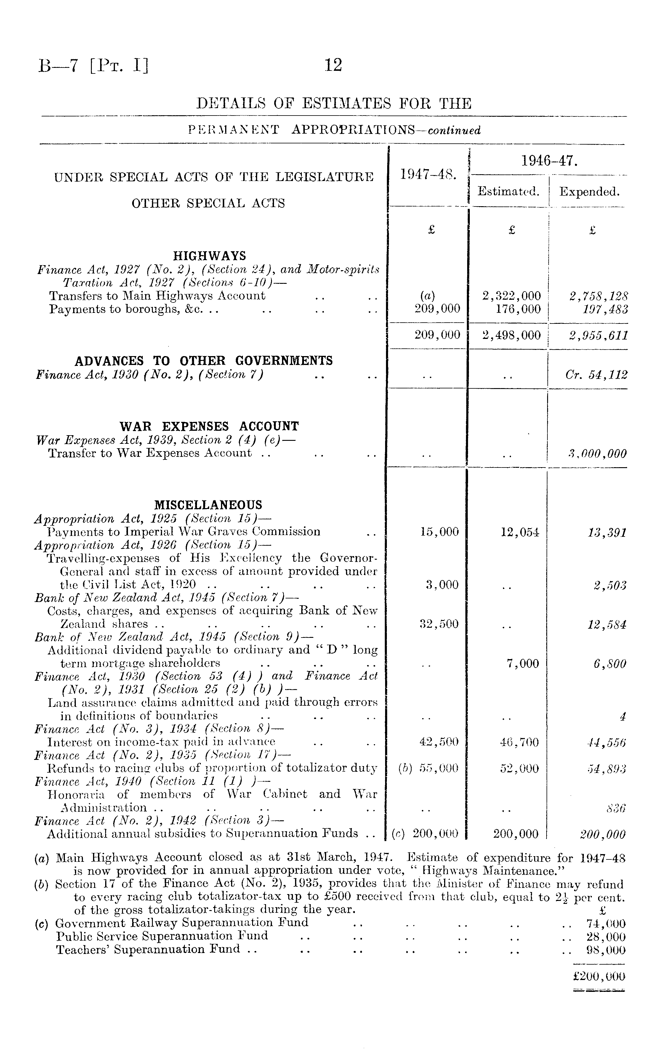 (а) Main Highways Account closed as at 31st March, 1947. Estimate of expenditure for 1947-48 is now provided for in annual appropriation under vote, " Highways Maintenance." (б) Section 17 of the Finance Act (No. 2), 1935, provides that the Minister of Finance may refund to every racing club totalizator-tax up to £5OO received from that club, equal to per cent, of the gross totalizator-takings during the year. £ (c) Government Railway Superannuation Fund .. .. .. .. .. 74,000 Public Service Superannuation Fund .. .. .. .. .. .. 28,000 Teachers' Superannuation Fund .. .. .. .. .. .. .. 98,000 £200,000