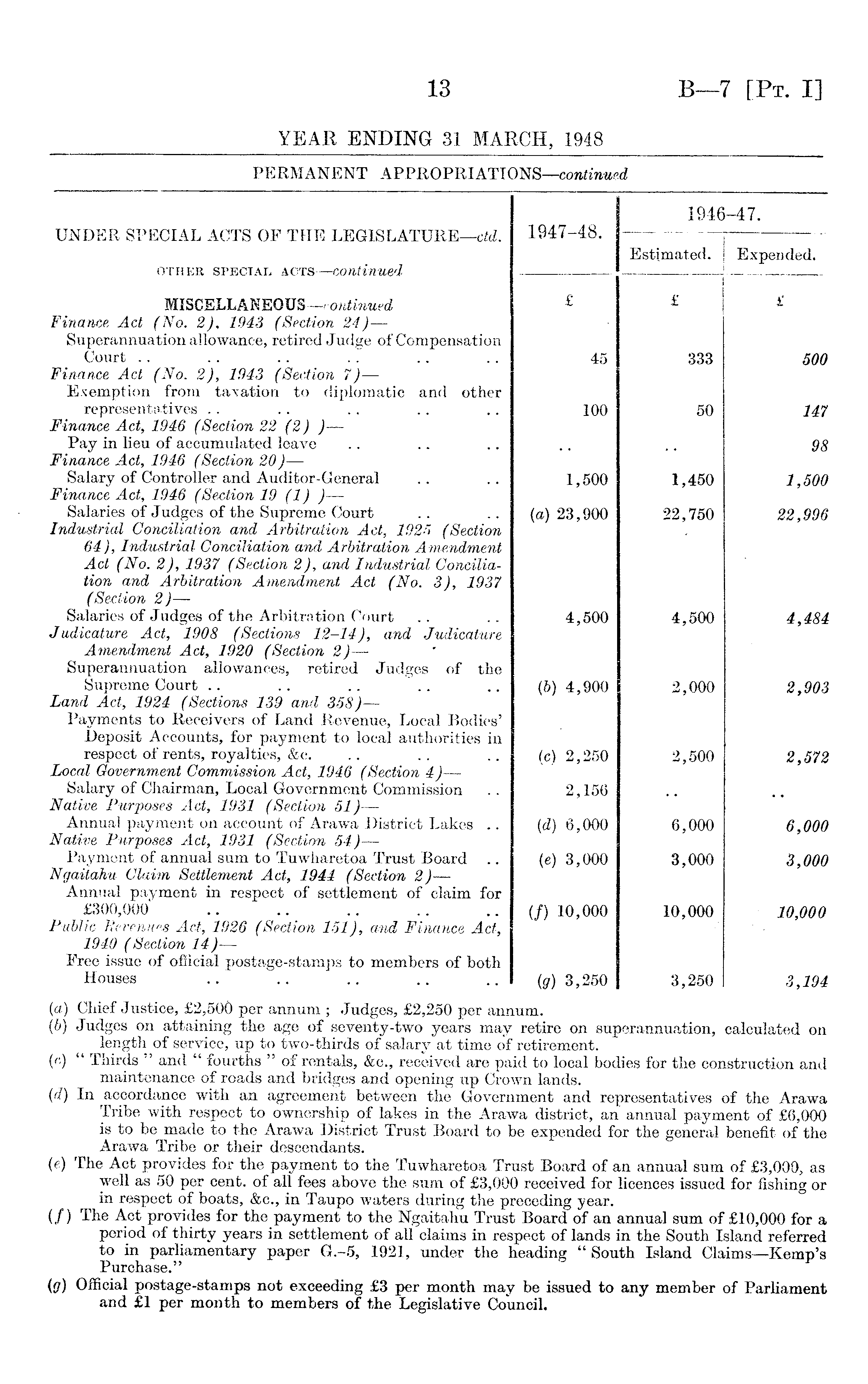 1946 i-47. UNDER SPECIAL ACTS OF THE LEGISLATURE—ctd. 1947-48. Estimated. Expended. other special acts —continued MISCELLANEOUS—continued f £ i Finance Act (No. 2), 1943 (Section 24) — Superannuation allowance, retired Judge of Compensation Court 45 333 500 Finance Act (No. 2), 1943 (Section 7) —- Exemption from taxation to diplomatic and other representatives 100 50 147 Finance Act, 1946 (Section 22 (2) ) — Pay in lieu of accumulated leave 98 Finance Act, 1946 (Section 20) — Salary of Controller and Auditor-General 1,500 1,450 1,500 Finance Act, 1946 (Section 19 (1) ) — Salaries of j udges of the Supreme Court (a) 23,900 22,750 22,996 Industrial Conciliation and Arbitration Act, 1925 (Section 64), Industrial Conciliation and Arbitration Amendment Act (No. 2), 1937 (Section 2), and Industrial Conciliation and Arbitration Amendment Act (No. 3), 1937 (Section 2) — Salaries of Judges of the Arbitration Court 4,500 4,500 4,484 Judicature Act, 1908 (Sections 12-14), and Judicature Amendment Act, 1920 (Section 2) — Superannuation allowances, retired Judges of the Supreme Court (6) 4,900 2,000 2,903 Land Act, 1924 (Sections 139 and 358) — Payments to Receivers of Land Revenue, Local Bodies' Deposit Accounts, for payment to local authorities in respect of rents, royalties, &c. (c) 2,250 2,500 2,572 Local Government Commission Act, 1946 (Section 4) — Salary of Chairman, Local Government Commission 2,156 Native Purposes Act, 1931 (Section 51) — Annual payment on account of Arawa District Lakes .. (d) 6,000 6,000 6,000 Native Purposes Act, 1931 (Section 54)— Payment of annual sum to Tuwharetoa Trust Board (e) 3,000 3,000 3,000 Ngaiiahu Claim Settlement Act, 1944 (Section 2) — Annual payment in respect of settlement of claim for £300,000 (/) 10,000 10,000 10,000 Public Revenues Act, 1926 (Section 151), and Finance Act, 1940 (Section 14) — Free issue of official postage-stamps to members of both Houses (?) 3,250 3,250 3,194