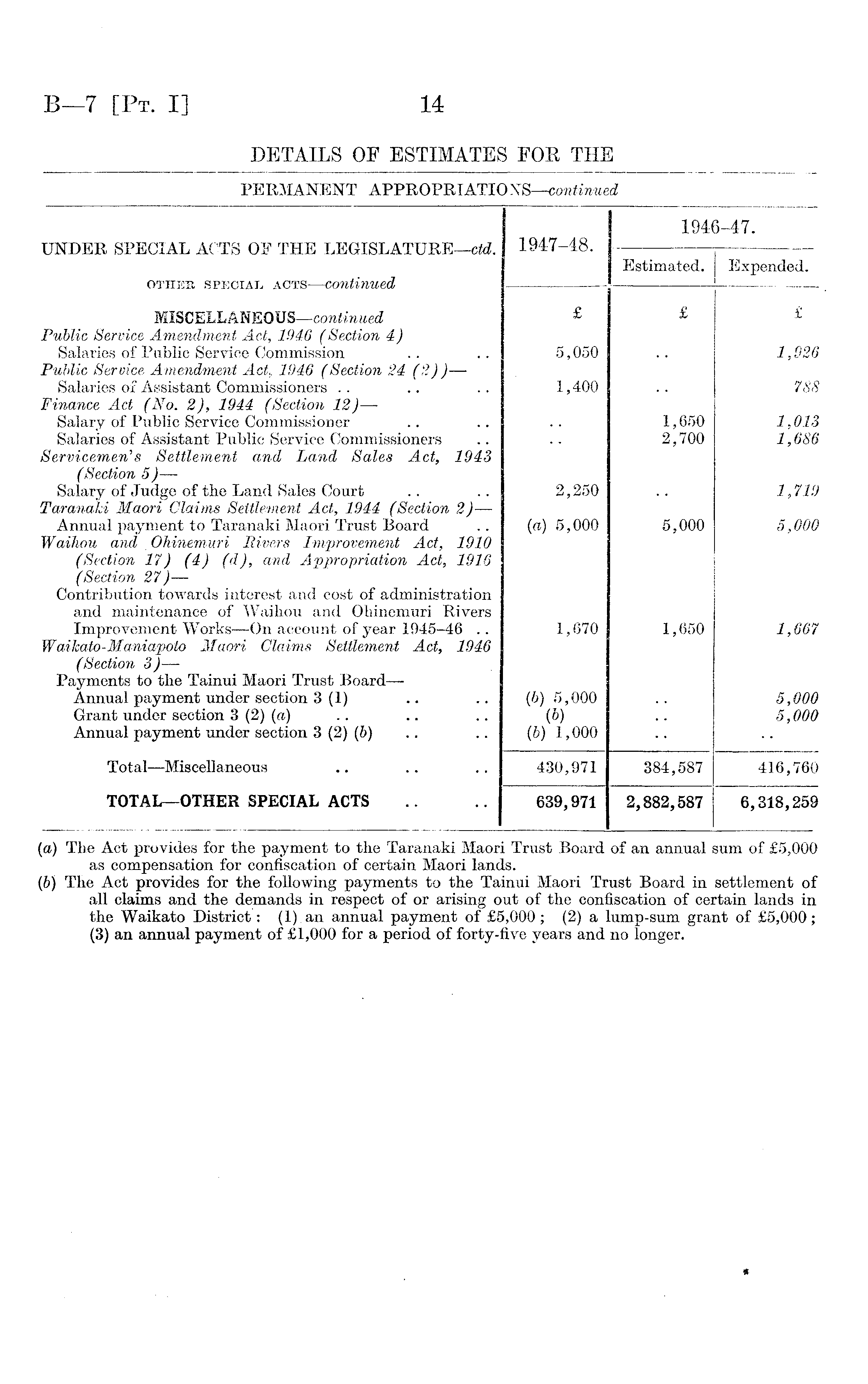 1946-47. UNDER SPECIAL ACTS OF THE LEGISLATURE—ctd. 1947-48. Estimated. Expended. OTHER SPECIAL ACTS COTltiTlUed MISCELLANEOUS—continued £ £ £ Public Service Amendment Act, 1946 (Section 4) Salaries of Public Service Commission 5,050 1,926 Public Service Amendment Act, 1946 (Section 24 (2) ) — Salaries of Assistant Commissioners 1,400 788 Finance Act (No. 2), 1944 (Section 12) — Salary of Public Service Commissioner 1,650 1,013 Salaries of Assistant Public Service Commissioners 2,700 1,686 Servicemen's Settlement and Land Sales Act, 1943 (Section 5) — Salary of Judge of the Land Sales Court 2,250 1,719 Taranalci Maori Claims Settlement Act, 1944 (Section 2) — Annual payment to Taranaki Maori Trust Board (a) 5,000 5,000 5,000 Waihou and . Ohiriemuri Rivers Improvement Act, 1910 (Section 17) (4) (d), and Appropriation Act, 1916 (Section 27) — Contribution towards interest and cost of administration and maintenance of Waihou and Ohinemuri Rivers Improvement Works—On account of year 1945-46 .. 1,670 1,650 1,667 Waikato-Maniapoto Maori Claims Settlement Act, 1946 (Section 3) — Payments to the Tainui Maori Trust Board — Annual payment under section 3(1) (b) 5,000 5,000 Grant under section 3 (2) (a) (6) 5,000 Annual payment under section 3 (2) (b) (6) 1,000 Total—Miscellaneous 430,971 384,587 416,760 TOTAL—OTHER SPECIAL ACTS 639,971 2,882,587 6,318,259