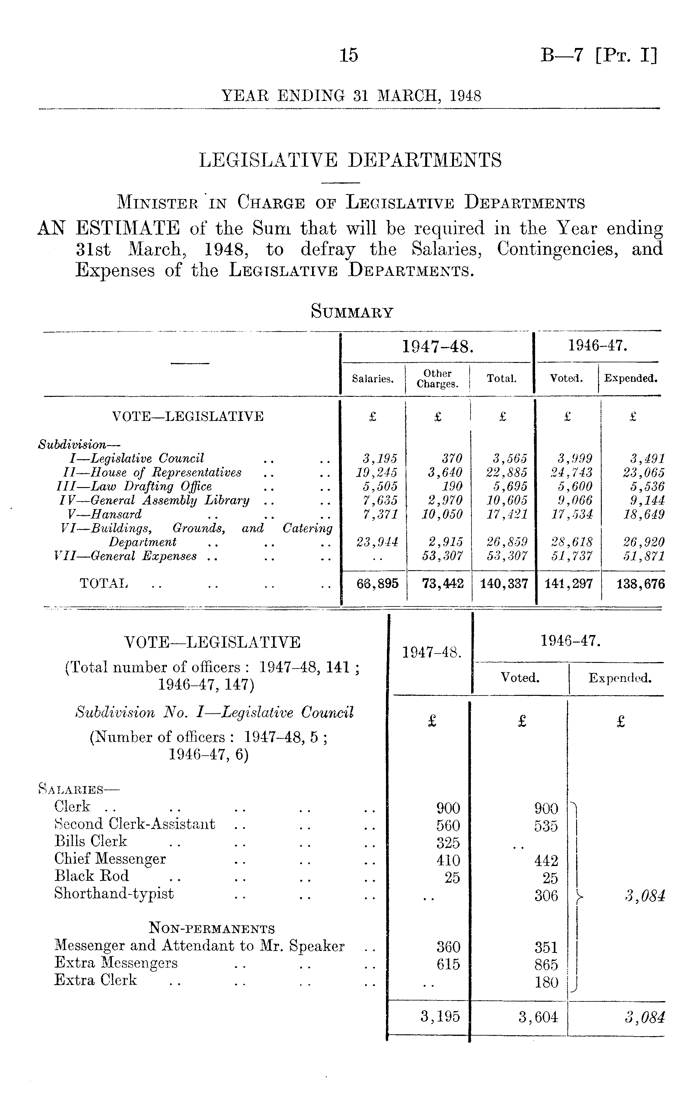 Minister in Charge of Legislative Departments AN ESTIMATE of the Sum that will be required in the Year ending 31st March, 1948, to defray the Salaries, Contingencies, and Expenses of the Legislative Departments. Summary