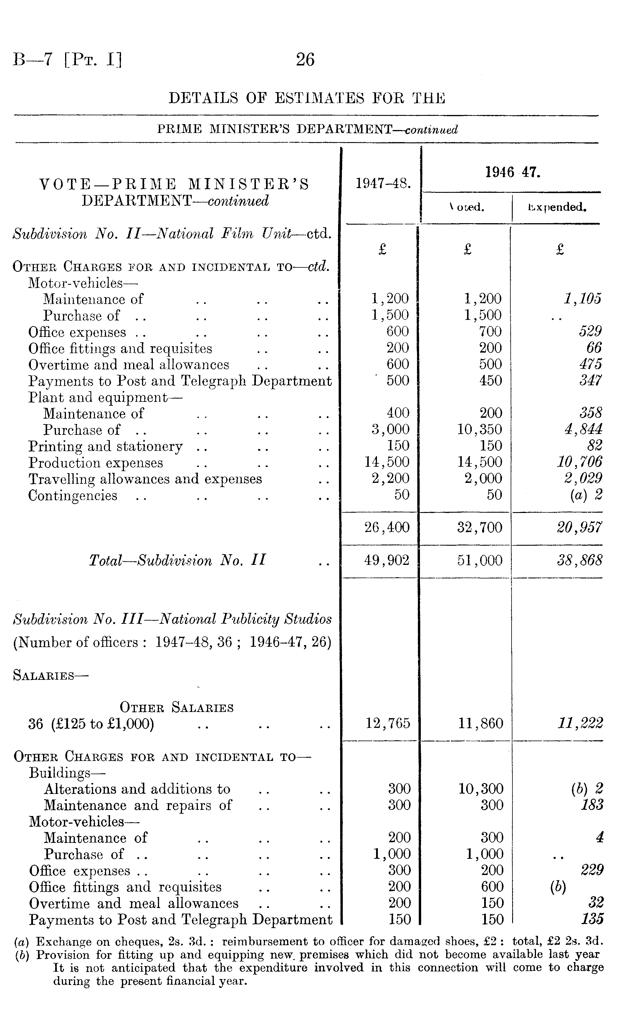 1946 47. VOTE—PRIME MINISTER'S 1947-48. DEPARTMENT—continued V ooed. Lxpended. Subdivision No. II —National Film Unit—ctd. £ £ £ Other Charges for and incidental to —ctd. Motor-vehicles — Maintenance of 1,200 1,200 1,105 Purchase of .. 1,500 1,500 Office expenses 600 700 529 Office fittings and requisites 200 200 66 Overtime and meal allowances 600 500 475 Payments to Post and Telegraph Department ' 500 450 347 Plant and equipment— Maintenance of 400 200 358 Purchase of .. 3,000 10,350 4,844 Printing and stationery 150 150 82 Production expenses 14,500 14,500 10,706 Travelling allowances and expenses 2,200 2,000 2,029 Contingencies 50 50 (a) 2 26,400 32,700 20,957 Total —Subdivision No. II 49,902 51,000 38,868 Subdivision No. Ill —National Publicity Studios (Number of officers : 1947-48, 36 ; 1946-47, 26) Salaries — Other Salaries 36 (£125 to £1,000) 12,765 11,860 11,222 Other Charges for and incidental to — Buildings— Alterations and additions to 300 10,300 (b) 2 Maintenance and repairs of .. 300 300 183 Motor-vehicles— Maintenance of 200 300 4 Purchase of .. .. .. 1,000 1,000 . . Office expenses 300 200 229 Office fittings and requisites 200 600 (6) Overtime and meal allowances 200 150 32 Payments to Post and Telegraph Department 150 150 135