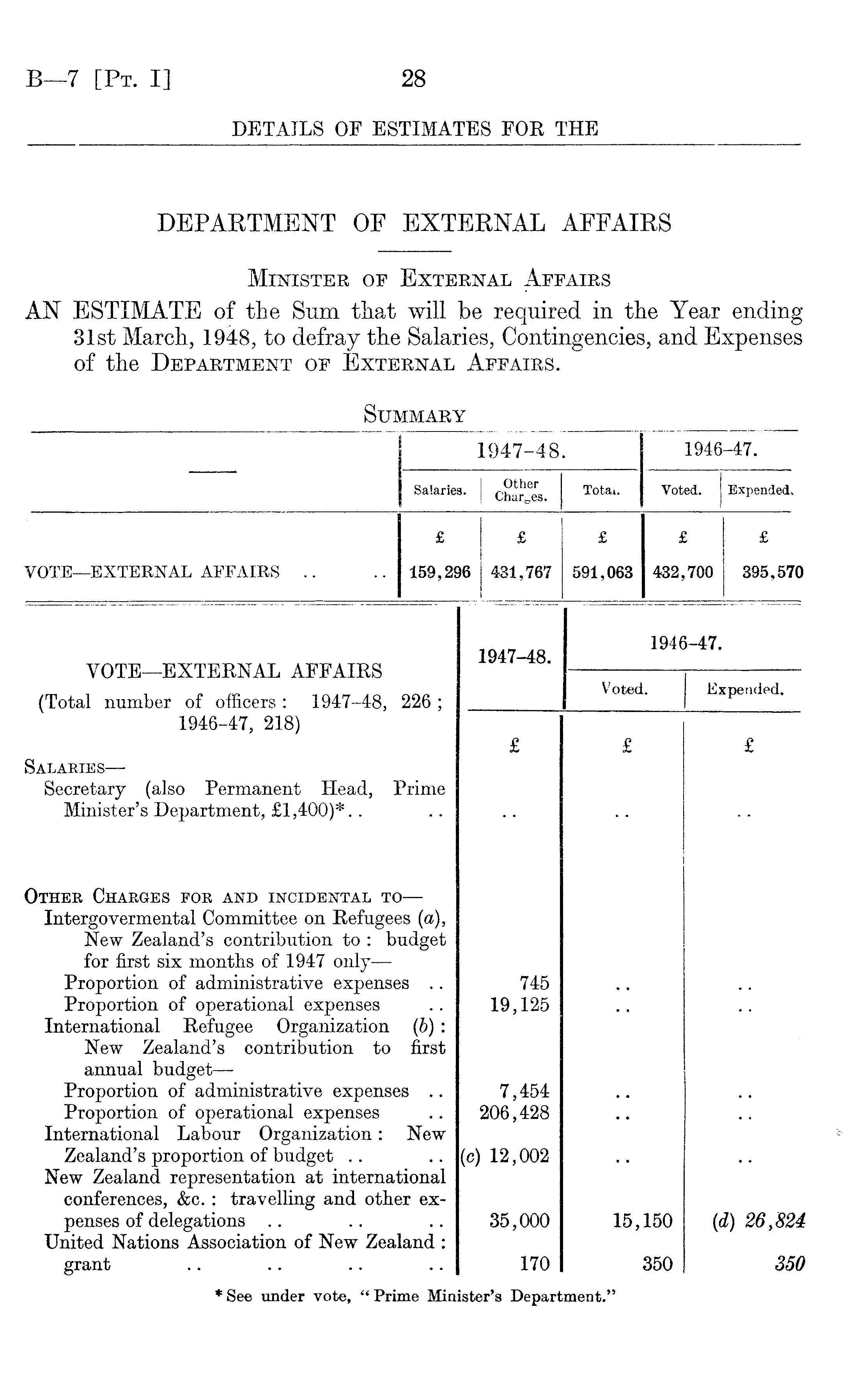 1947-48. 1946-47. Salaries. Other Charges. Totai. Voted. Expended, £ £ £ £ £ VOTE—EXTERNAL AFFAIRS 159,296 431,767 591,063 432,700 395,570 VOTE—EXTERNAL AFFAIRS (Total number of officers : 1947-48, 1947-48. 1946-47. 226 ; Voted. Expended. 1946-47, 218) Salaries — Secretary (also Permanent Head, Prime Minister's Department, £1,400)*.. £ £ £ Other Charges for and incidental to — Intergovermental Committee on Refugees (a), New Zealand's contribution to : budget for first six months of 1947 only— Proportion of administrative expenses .. Proportion of operational expenses International Refugee Organization (b): New Zealand's contribution to first annual budget— Proportion of administrative expenses .. Proportion of operational expenses International Labour Organization: New Zealand's proportion of budget New Zealand representation at international conferences, &c.: travelling and other expenses of delegations United Nations Association of New Zealand : grant 745 19,125 7,454 206,428 (c) 12,002 35,000 170 15,150 350 * (d) 26,824 350 * See under vote, "Prime Minister's Department."