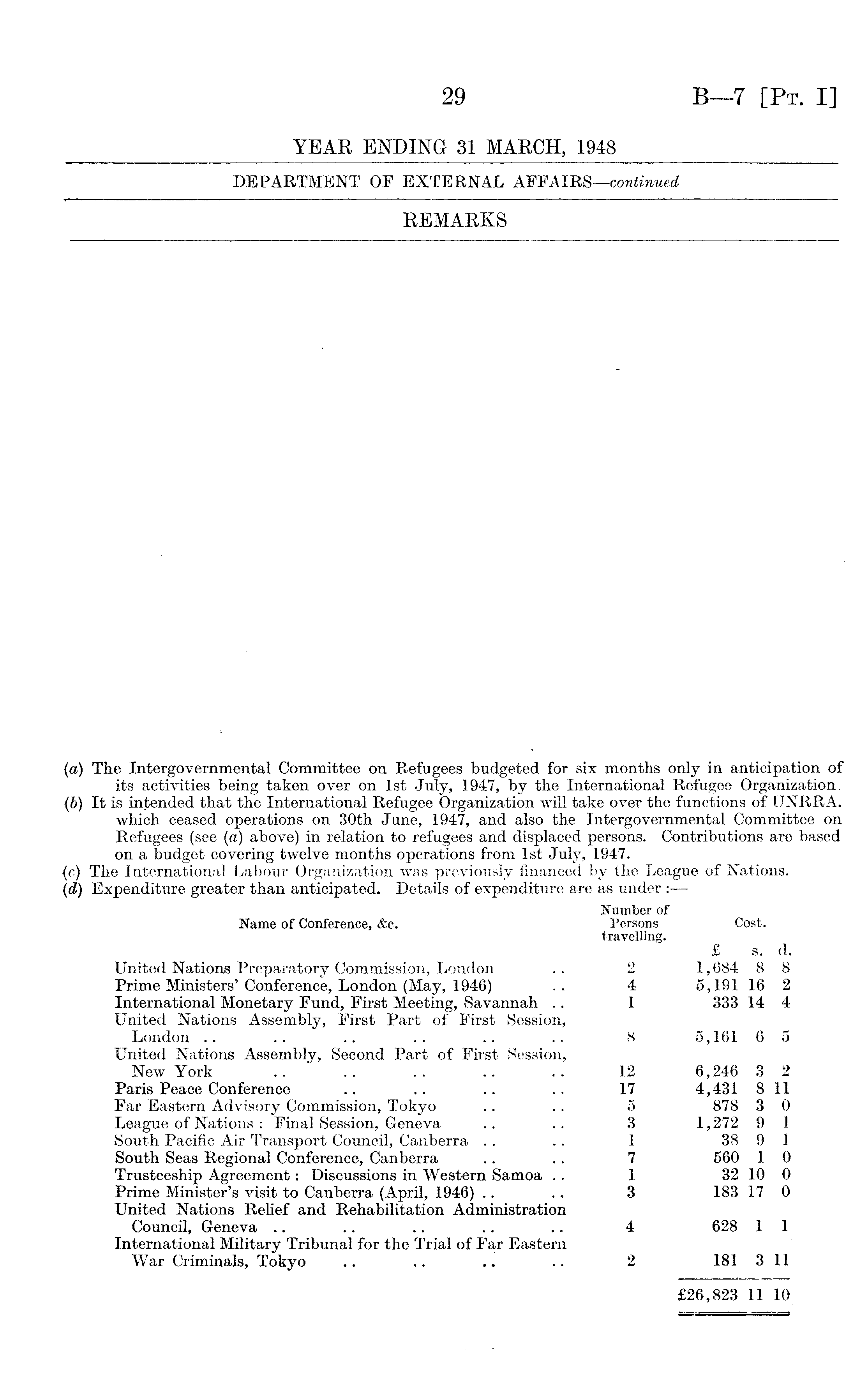 (a) The Intergovernmental Committee on Refugees budgeted for six months only in anticipation of its activities being taken over on Ist July, 1947, by the International Refugee Organization, (b) It is intended that the International Refugee Organization will take over the functions of UNRRA. which ceased operations on 30th June, 1947, and also the Intergovernmental Committee on Refugees (see (a) above) in relation to refugees and displaced persons. Contributions are based on a budget covering twelve months operations from Ist July, 1947. {c) The International Labour Organization was previously financed by the League of Nations. (d) Expenditure greater than anticipated. Details of expenditure are as under : Number of Name of Conference, &c. Persons Cost. travelling. £ s. d. United Nations Preparatory Commission, London .. 2 1,684 8 8 Prime Ministers' Conference, London (May, 1946) .. 4 5,191 16 2 International Monetary Fund, First Meeting, Savannah .. 1 333 14 4 United Nations Assembly, First Part of First Session, London .. .. .. .. .. .. 8 5,161 6 5 United Nations Assembly, Second Part of First Session, New York .. .. .. .. .. 12 6,246 3 2 Paris Peace Conference .. .. .. .. 17 4,431 8 11 Far Eastern Advisory Commission, Tokyo .. .. 5 878 3 0 League of Nations: Final Session, Geneva .. .. 3 1,272 9 1 South Pacific Air Transport Council, Canberra .. .. 1 38 9 1 South Seas Regional Conference, Canberra .. .. 7 560 1 0 Trusteeship Agreement: Discussions in Western Samoa .. 1 32 10 0 Prime Minister's visit to Canberra (April, 1946) .. .. 3 183 17 0 United Nations Relief and Rehabilitation Administration Council, Geneva .. .. .. .. .. 4 628 1 1 International Military Tribunal for the Trial of Far Eastern War Criminals, Tokyo .. .. .. .. 2 181 3 11 £26,823 11 10