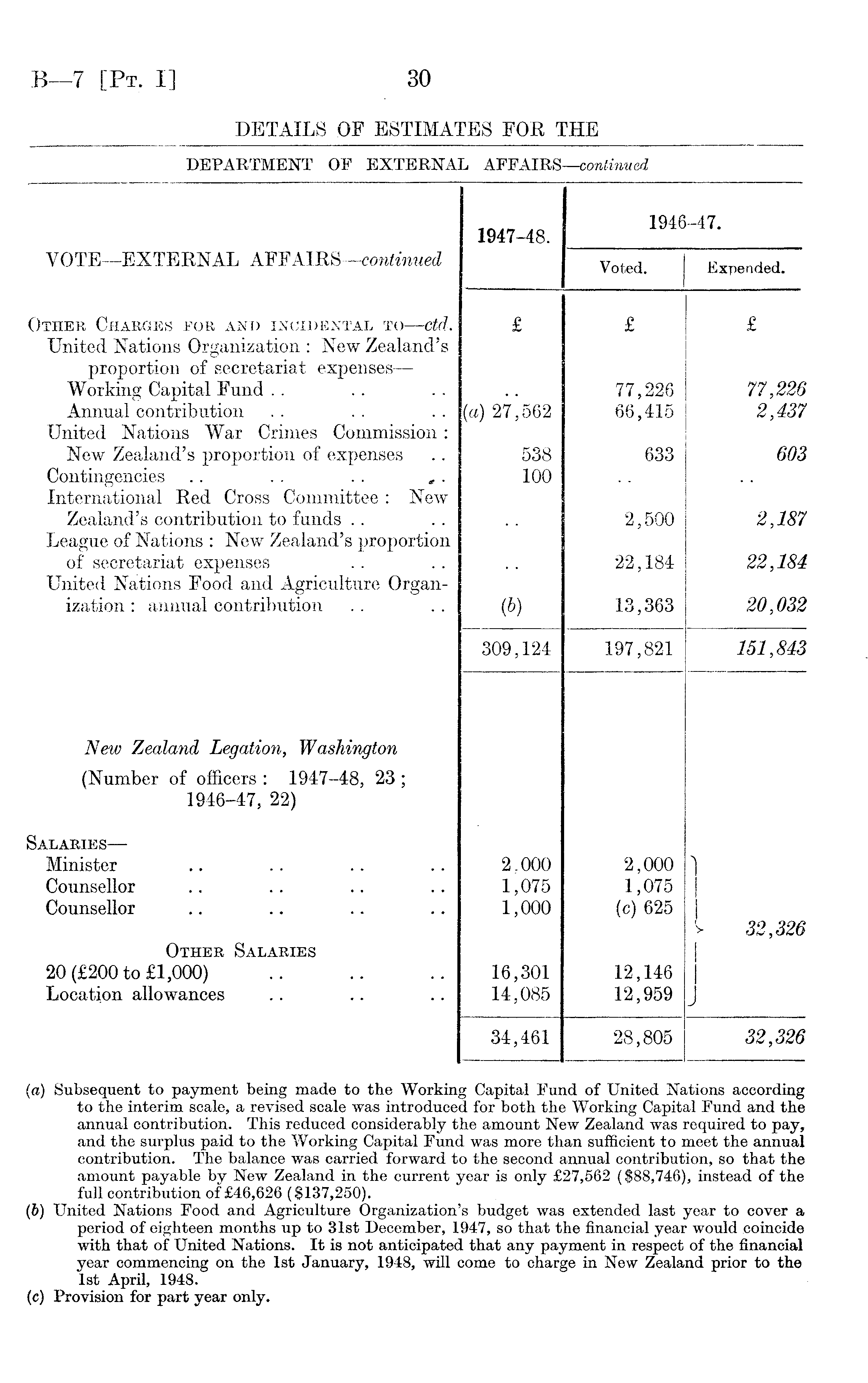 (а) Subsequent to payment being made to the Working Capital Fund of United Nations according to the interim scale, a revised scale was introduced for both the Working Capital Fund and the annual contribution. This reduced considerably the amount New Zealand was required to pay, and the surplus paid to the Working Capital Fund was more than sufficient to meet the annual contribution. The balance was carried forward to the second annual contribution, so that the amount payable by New Zealand in the current year is only £27,562 ($88,746), instead of the full contribution of £46,626 ($137,250). (б) United Nations Food and Agriculture Organization's budget was extended last year to cover a period of eighteen months up to 31st December, 1947, so that the financial year would coincide with that of United Nations. It is not anticipated that any payment in respect of the financial year commencing on the Ist January, 1948, will come to charge in New Zealand prior to the Ist April, 1948. (c) Provision for part year only.