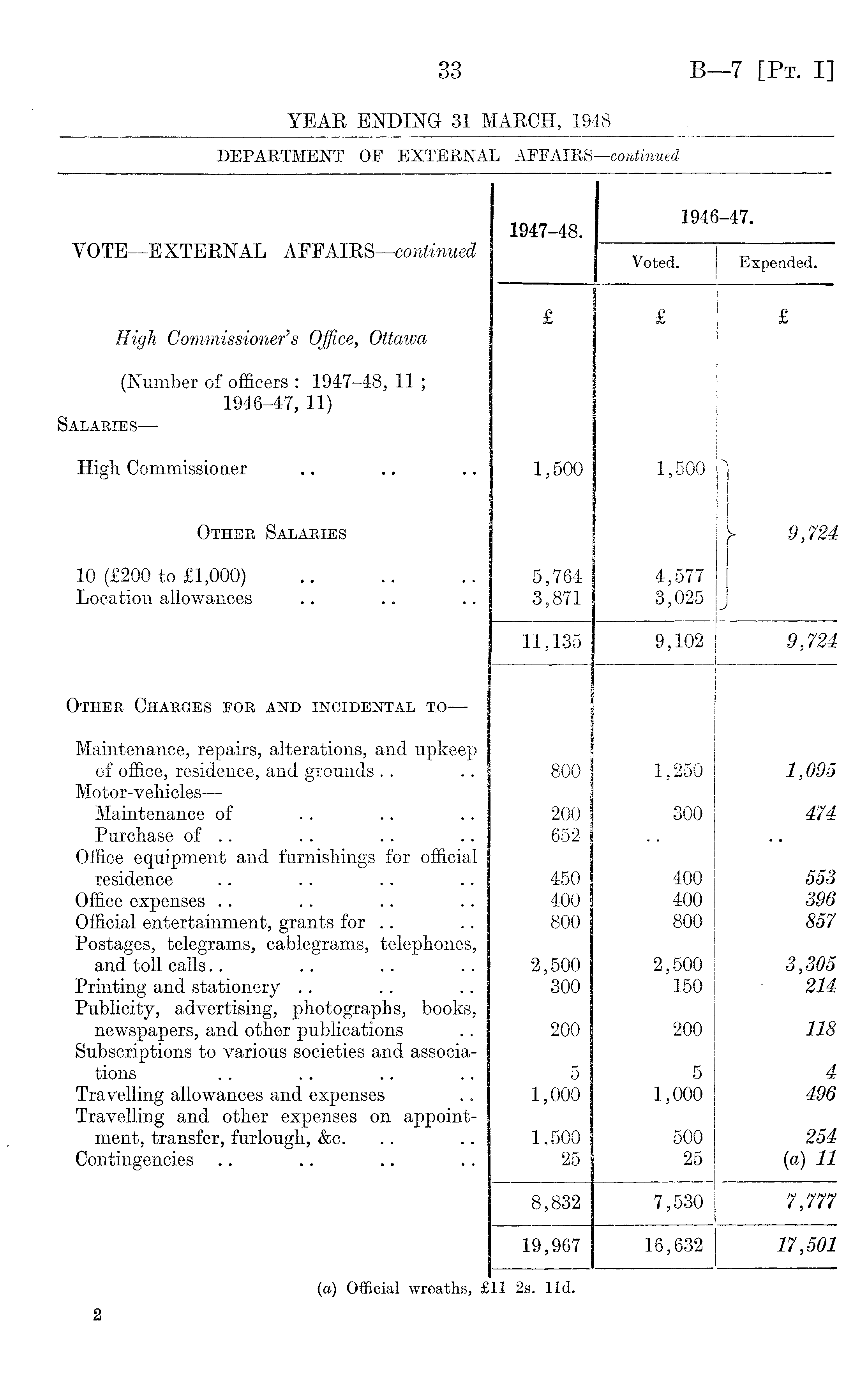 1947-48. 1946-47. VOTE—EXTERNAL AFFAIRS —continued Voted. Expended. £ £ £ High Commissioner's Office, Ottawa (Number of officers : 1947-48, 11 ; 1946-47, 11) Salaries — High Commissioner 1,500 1,500 Other Salaries 9,724 10 (£200 to £1,000) 5,764 4,577 Location allowances 3,871 3,025 11,135 9,102 9,724 Other Charges for and incidental t.o — Maintenance, repairs, alterations, and upkeep of office, residence, and grounds 800 1,250 1,095 Motor-vehi cles— Maintenance of .. .. 200 300 474 Purchase of .. 652 Office equipment and furnishings for official residence 450 400 553 Office expenses 400 400 396 Official entertainment, grants for .. 800 800 857 Postages, telegrams, cablegrams, telephones, and toll calls 2,500 2,500 3,305 Printing and stationery 300 150 214 Publicity, advertising, photographs, books, newspapers, and other publications 200 200 118 Subscriptions to various societies and associations 5 5 4 Travelling allowances and expenses 1,000 1,000 496 Travelling and other expenses on appoint254 ment, transfer, furlough, &c. 1.500 500 Contingencies 25 25 (a) 11 8,832 7,530 7,777 19,967 16,632 17,501 (a) Official wreaths, £ 11 2s. lid.