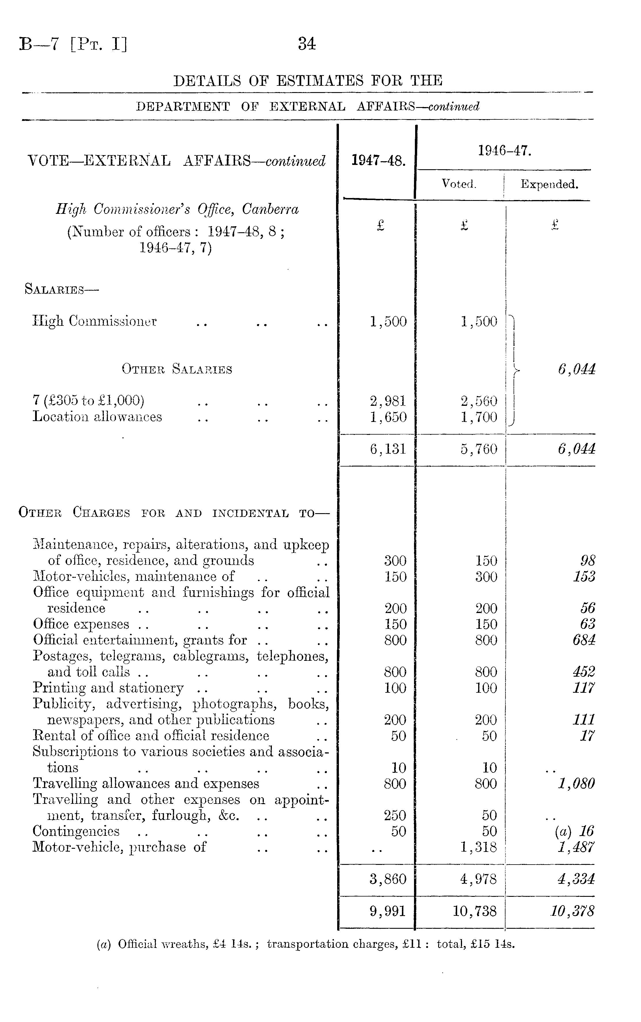 VOTE—EXTERNAL AFFAIRS —continued 1947-48. 1946-47. Voted. Expended. High Commissioner's Office, Canberra (Number of officers : 1947-48, 8 ; 1946-47, 7) £ £ £ Salaries— High Commissioner 1,500 1,500 ■> ; Other Salaries y 6,044 7 (£305 to £1,000) .. Location allowances 2,981 1,650 2,560 1,700 6,131 5,760 6,044 Other Charges for and incidental to — Maintenance, repairs, alterations, and upkeep of office, residence, and grounds Motor-vehicles, maintenance of Office equipment and furnishings for official residence Office expenses Official entertainment, grants for Postages, telegrams, cablegrams, telephones, and toll calls Printing and stationery Publicity, advertising, photographs, books, newspapers, and other publications Rental of office and official residence Subscriptions to various societies and associations Travelling allowances and expenses Travelling and other expenses on appointment, transfer, furlough, &c. Contingencies Motor-vehicle, purchase of 300 150 200 150 800 800 100 200 50 10 800 250 50 150 300 200 150 800 800 100 200 50 10 800 50 50 1,318 98 153 56 63 684 452 117 111 17 "1,080 \a) 16 1,487 3,860 4,978 4,334 9,991 10,738 10,378 (a) Official wreaths, £4 14s.; transportation charges, £11 : total, £15 14 :S.