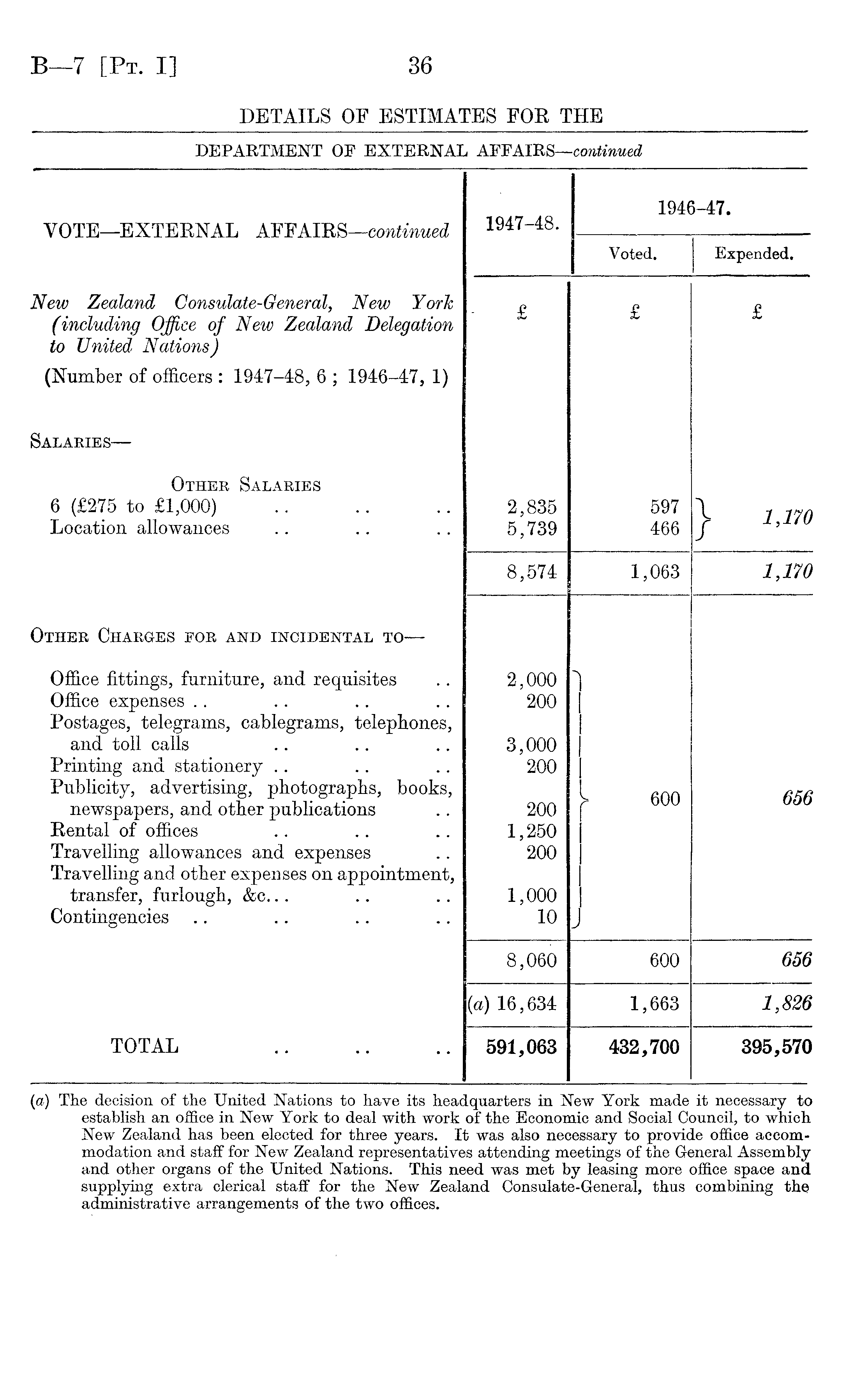 (a) The decision of the United Nations to have its headquarters in New York made it necessary to establish an office in New York to deal with work of the Economic and Social Council, to which New Zealand has been elected for three years. It was also necessary to provide office accommodation and staff for New Zealand representatives attending meetings of the General Assembly and other organs of the United Nations. This need was met by leasing more office space and supplying extra clerical staff for the New Zealand Consulate-General, thus combining the administrative arrangements of the two offices.