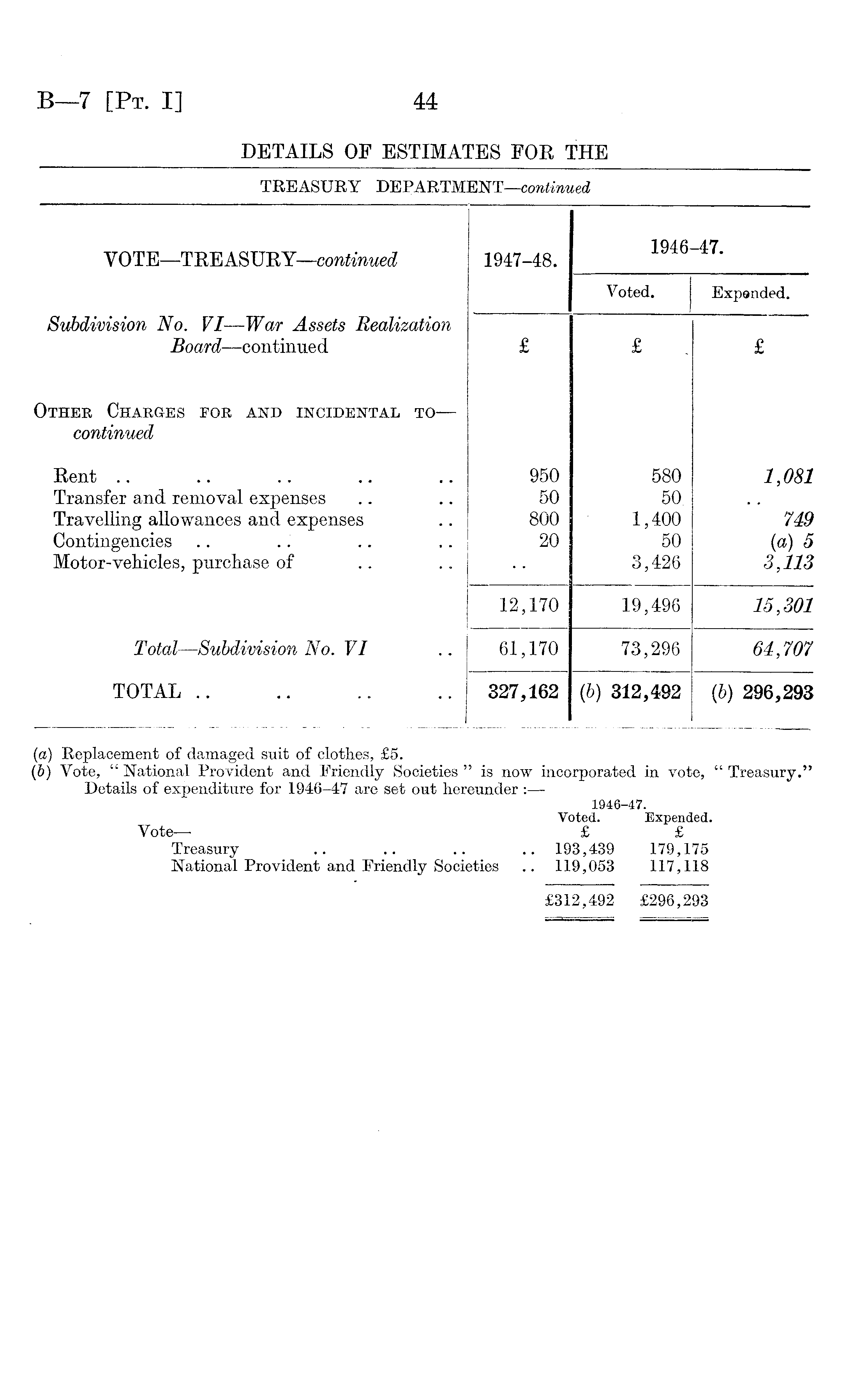 (a) Replacement of damaged suit of clothes, £5. (b) Vote, " National Provident and Friendly Societies " is now incorporated in vote, " Treasury." Details of expenditure for 1946-47 are set out hereunder : 1946-47. Voted. Expended. Vote— £ £ Treasury .. .. .. .. 193,439 179,175 National Provident and Friendly Societies .. 119,053 117,118 £312,492 £296,293