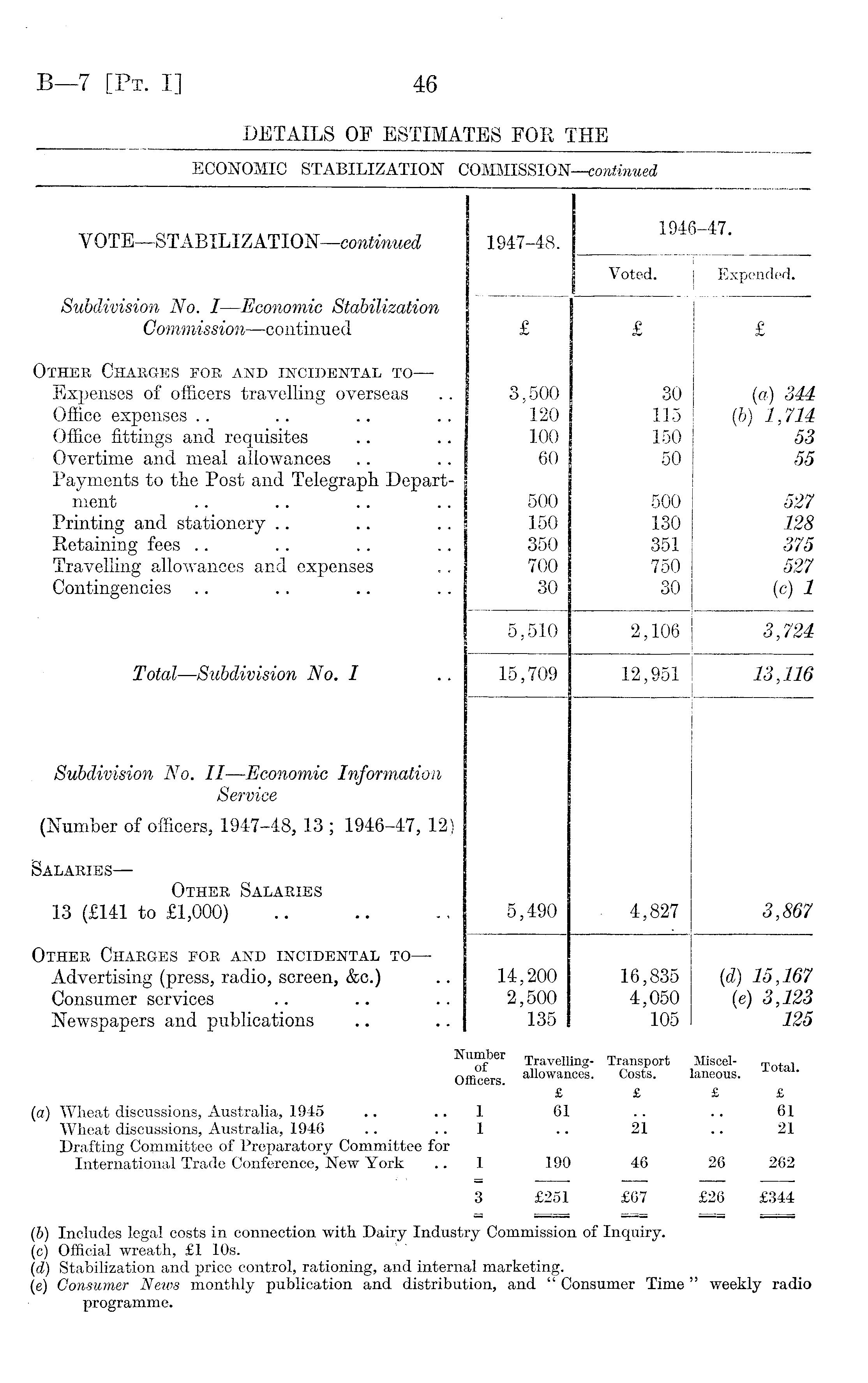 Y OTE—STABILIZATION—continued 1947-48. 1946-47. Voted. Expended. Subdivision No. I—Economic Stabilization Commission—continued £ £ £ Other Charges for and incidental to — Expenses of officers travelling overseas Office expenses Office fittings and requisites ■ Overtime and meal allowances Payments to the Post and Telegraph Department Printing and stationery Retaining fees Travelling allowances and expenses Contingencies 3,500 120 100 60 500 150 350 700 30 30 115 150 50 500 130 351 750 30 (a) 344 (b) 1,714 53 55 527 128 375 527 (c) 1 5,510 2,106 3,724 Total—Subdivision No. I 15,709 12,951 13,116 Subdivision No. II —Economic Information Service (Number of officers, 1947-48, 13 ; 1946-47, 12) Salaries— Other Salaries 13 (£141 to £1,000) 5,490 - 4,827 3,867 Other Charges for and incidental to — Advertising (press, radio, screen, &c.) Consumer services Newspapers and publications 14,200 2,500 135 16,835 4,050 105 (d) 15,167 (e) 3,123 125