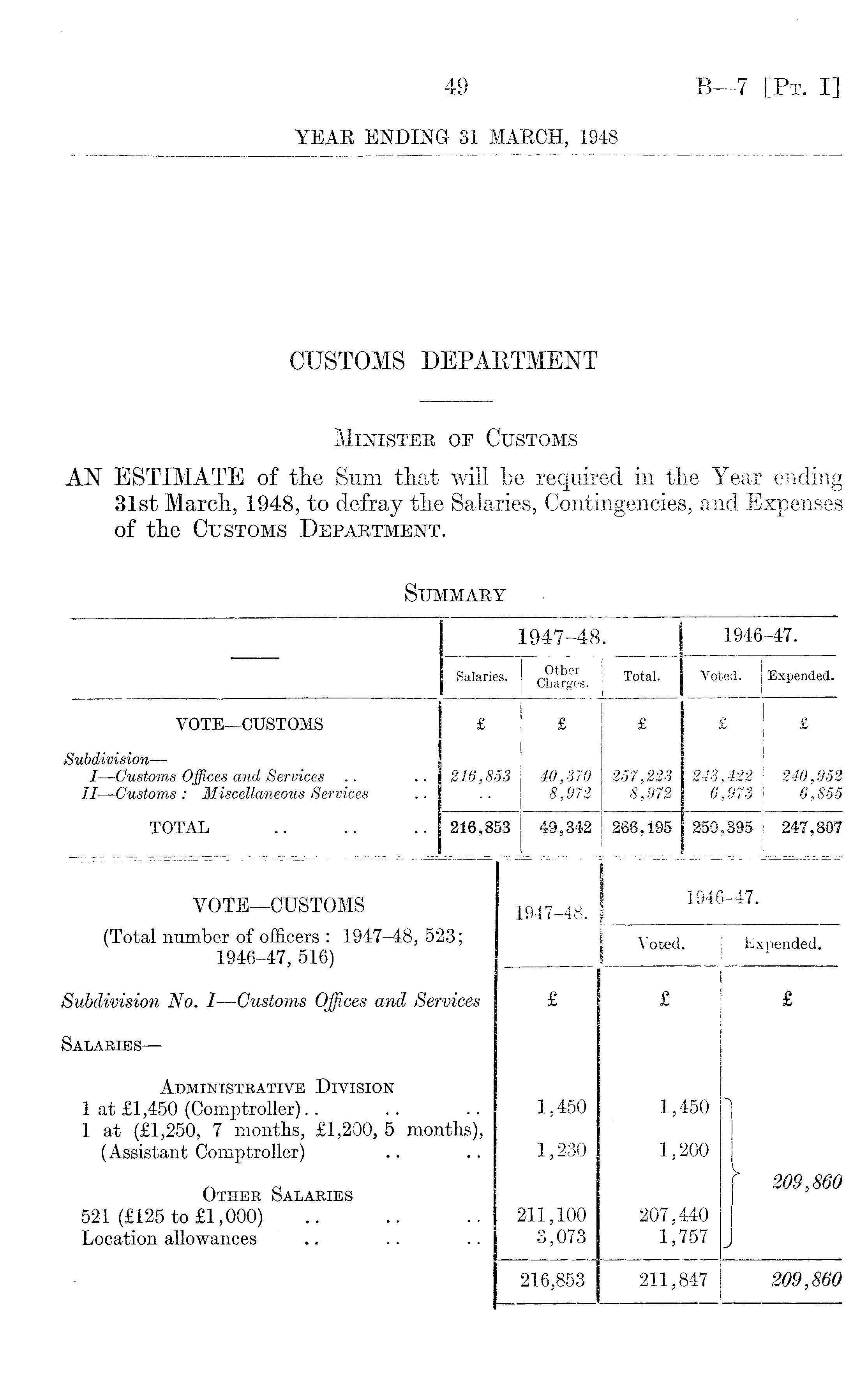 Minister of Customs AN ESTIMATE of the Sum that will be required in the Year ending 31st March, 1948, to defray the Salaries, Contingencies, and Expenses of the Customs Department. Summary