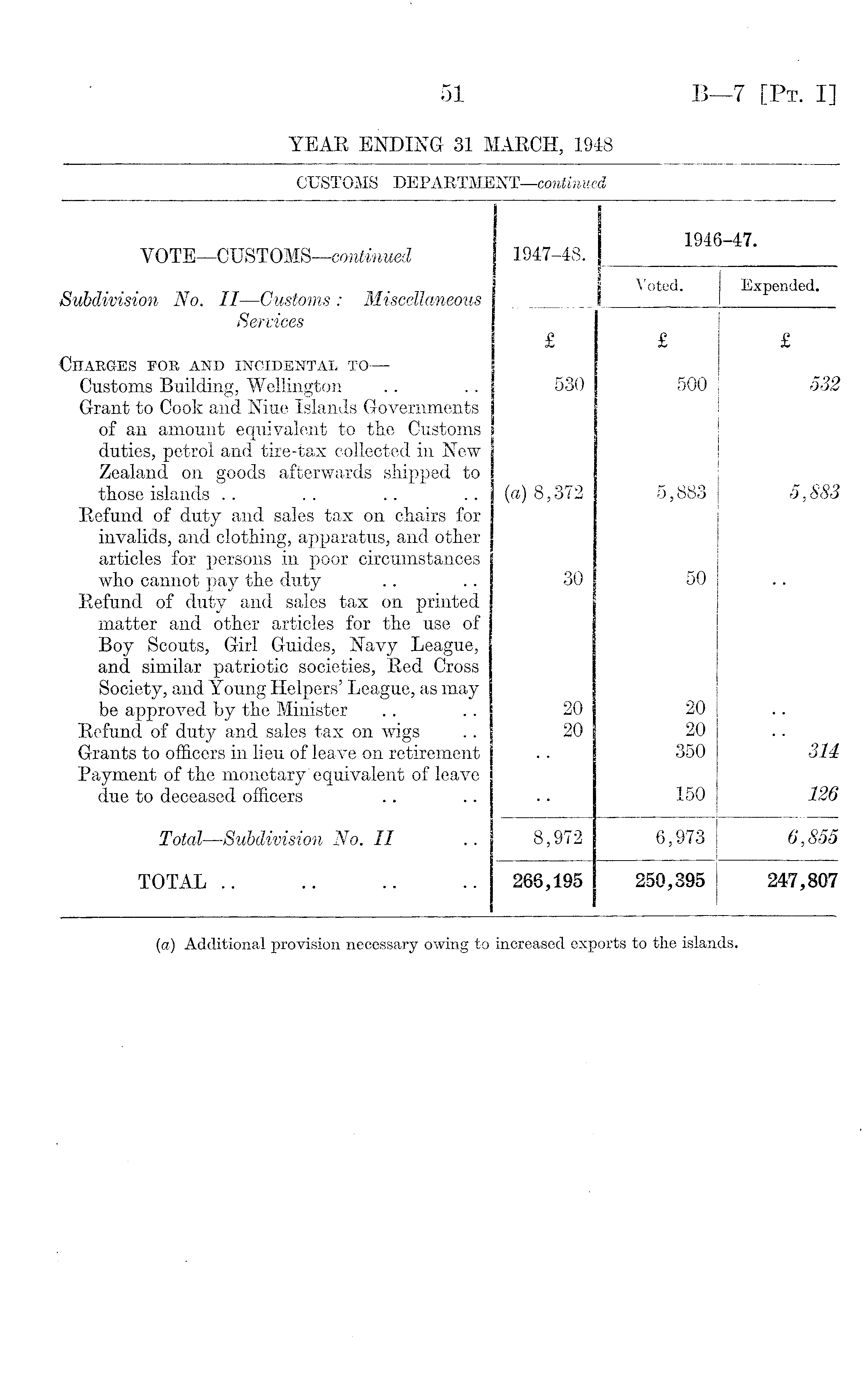 1947-48. 1946-47. VOTE —CUSTOMS—continued Subdivision No. II—Customs : Miscellaneous Voted. Expended. Services £ £ £ Charges for and incidental to — Customs Building, Wellington 530 500 532 Grant to Cook and Niue Islands Governments of an amount equivalent to the Customs duties, petrol and tire-tax collected in New Zealand on goods afterwards shipped to those islands (a) 8,372 5,883 5,883 Refund of duty and sales tax on chairs for invalids, and clothing, apparatus, and other articles for persons in poor circumstances who cannot pay the duty 30 50 Refund of duty and sales tax on printed matter and other articles for the use of Boy Scouts, Girl Guides, Navy League, and similar patriotic societies, Red Cross Society, and Young Helpers' League, as may 20 be approved by the Minister 20 Refund of duty and sales tax on wigs 20 20 Grants to officers in lieu of leave on retirement 350 314 Payment of the monetary equivalent of leave due to deceased officers 150 126 Total—Subdivision No. 11 8,972 6,973 6,855 TOTAL .. 268,195 250,395 247,807 (a) Additional provision necessary owing to increased exports to the islands.