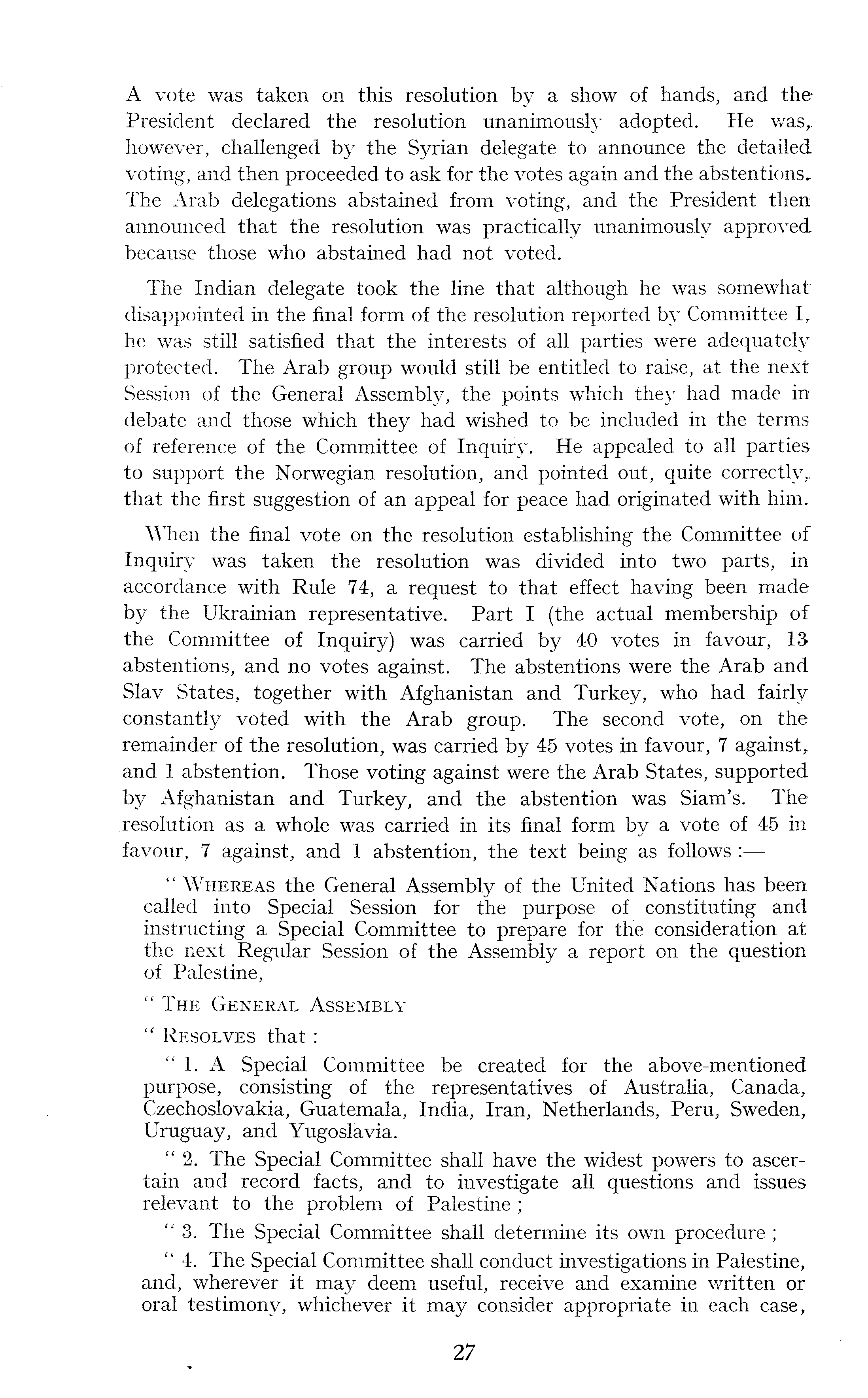 / A vote was taken on this resolution by a show of hands,. and the President declared the resolution unanimously adopted. He was,, however, challenged by the Syrian delegate to announce the detailed voting, and then proceeded to ask for the votes again and the abstentions. The Arab delegations abstained from voting, and the President then announced that the resolution was practically unanimously approved because those who abstained had not voted. The Indian delegate took the line that although he was somewhat disappointed in the final form of the resolution reported by Committee I, he was still satisfied that the interests of all parties were adequately protected. The Arab group would still be entitled to raise, at the next Session of the General Assembly, the points which they had made in debate and those which they had wished to be included in the terms of reference of the Committee of Inquiry. He appealed to all parties to support the Norwegian resolution, and pointed out, quite correctly, that the first suggestion of an appeal for peace had originated with him. When the final vote on the resolution establishing the Committee of Inquiry was taken the resolution was divided into two parts, in accordance with Rule 74, a request to that effect having been made by the Ukrainian representative. Part I (the actual membership of the Committee of Inquiry) was carried by 40 votes in favour, 13 abstentions, and no votes against. The abstentions were the Arab and Slav States, together with Afghanistan and Turkey, who had fairly constantly voted with the Arab group. The second vote, on the remainder of the resolution, was carried by 45 votes in favour, 7 against, and 1 abstention. Those voting against were the Arab States, supported by Afghanistan and Turkey, and the abstention was Siam's. The resolution as a whole was carried in its final form by a vote of 45 in favour, 7 against, and 1 abstention, the text being as follows : —■ " Whereas the General Assembly of the United Nations has been called into Special Session for the purpose of constituting and instructing a Special Committee to prepare for the consideration at the next Regular Session of the Assembly a report on the question of Palestine, "The General Assembly " Resolves that: "I.A Special Committee be created for the above-mentioned purpose, consisting of the representatives of Australia, Canada, Czechoslovakia, Guatemala, India, Iran, Netherlands, Peru, Sweden, Uruguay, and Yugoslavia. "2. The Special Committee shall have the widest powers to ascertain and record facts, and to investigate all questions and issues relevant to the problem of Palestine; "3. The Special Committee shall determine its own procedure ; " 4. The Special Committee shall conduct investigations in Palestine, and, wherever it may deem useful, receive and examine written or oral testimony, whichever it may consider appropriate in each case,