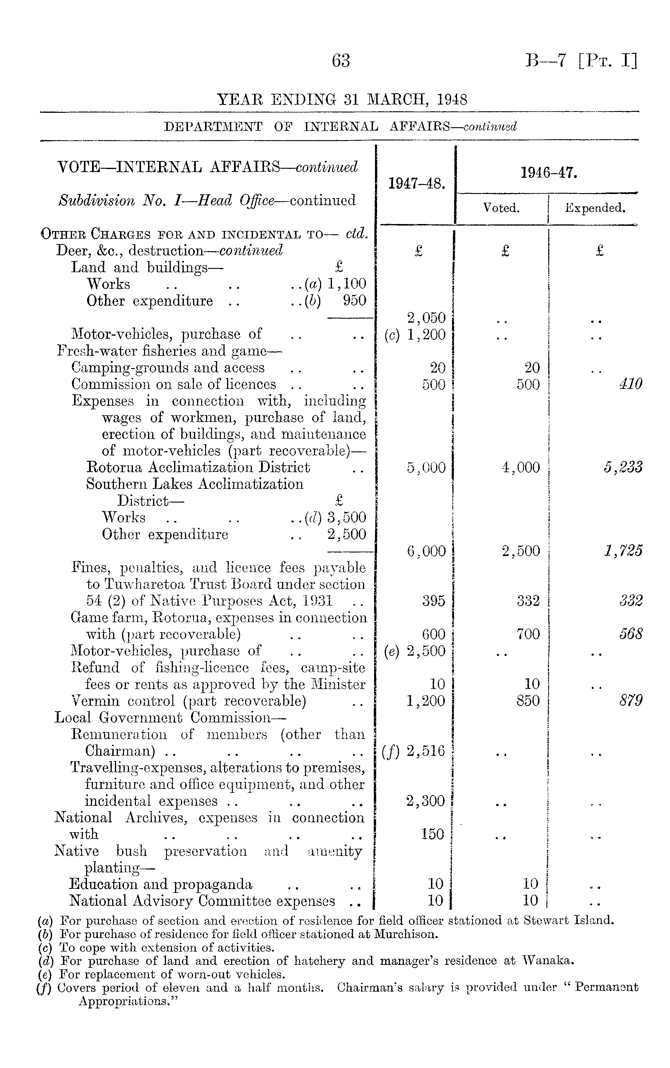 VOTE—INTERNAL AFFAIRS—continued 1Q4fi-4.7. 1947-48. Subdivision No. I —Head Office —continued Voted. Expended. Other Charges for and incidental to — ctd. Deer, &c., destruction —continued £ £ £ Land and buildings — £ Works .. .. ..{a) 1,100 Other expenditure .. .. (6) 950 2,050 • • Motor-veMcles, purchase of (c) 1,200 , , Fresh-water fisheries and game— Camping-grounds and access 20 20 Commission on sale of licences 500 500 410 Expenses in connection with, including wages of workmen, purchase of land, erection of buildings, and maintenance of motor-vehicles (part recoverable) — Rotorua Acclimatization District 5,000 4,000 5,233 Southern Lakes Acclimatization District — £ Works .. .. ..(d) 3,500 Other expenditure .. 2,500 6,000 2,500 1,725 Fines, penalties, and licence fees payable to Tuwharetoa Trust Board under section 54 (2) of Native Purposes Act, 1931 395 332 332 Game farm, Rotorua, expenses in connection with (part recoverable) 600 700 568 Motor-vehicles, purchase of (e) 2,500 Refund of fishing-licence fees, camp-site fees or rents as approved by the Minister 10 10 Vermin control (part recoverable) 1,200 850 879 Local Government Commission — Remuneration of members (other than Chairman) (/) 2,516 Travelling-expenses, alterations to premises, furniture and office equipment, and other incidental expenses 2,300 . . National Archives, expenses in connection with 150 . • , . Native bush preservation and amenity planting— Education and propaganda 10 10 National Advisory Committee expenses .. 10 10