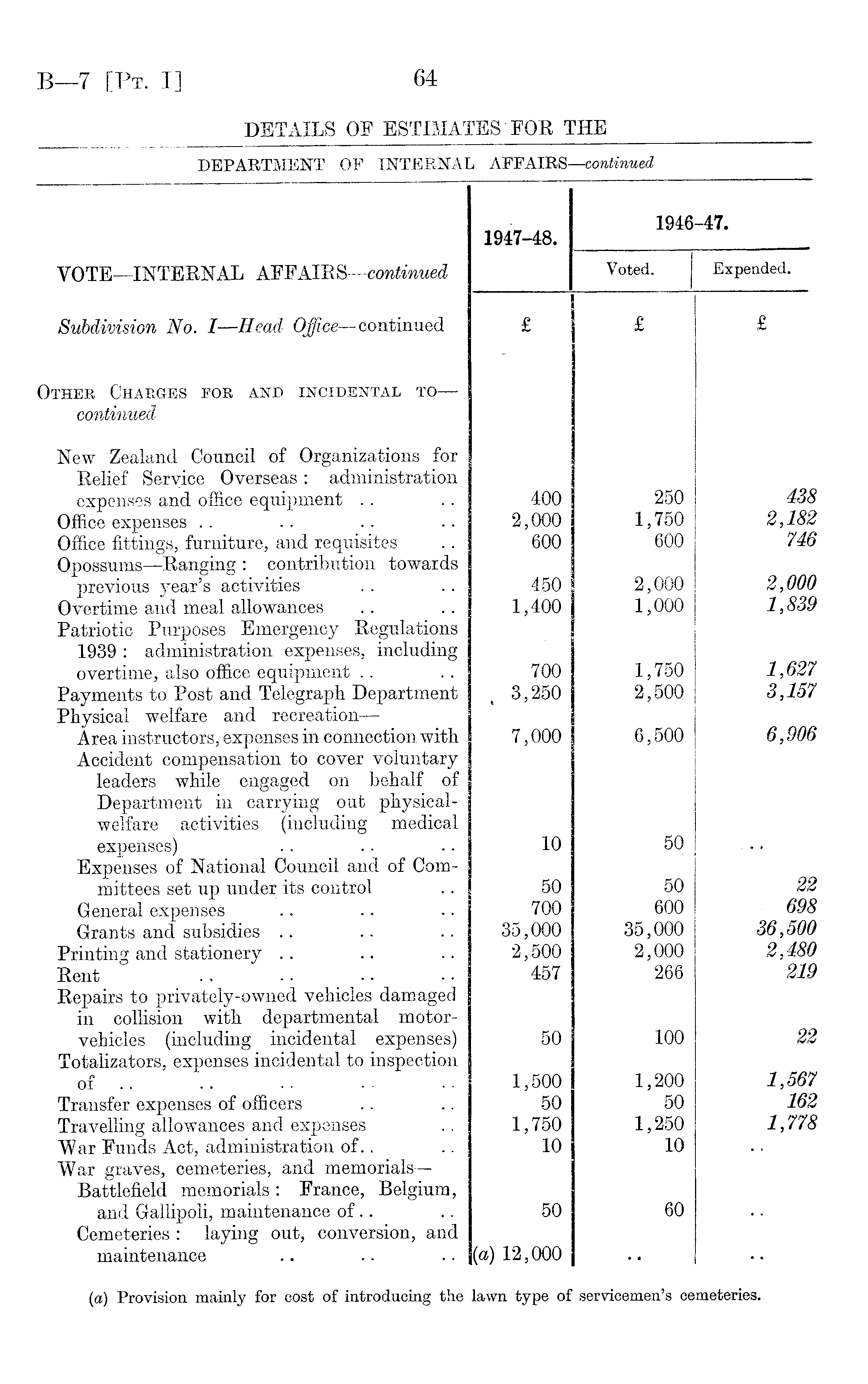 1946-47. 1947-48. YOTE—INTERNAL AFFAIRS —continued Voted. Expended. Subdivision No. I —Head Office— continued £ £ £ Other Charges for and incidental to — continued New Zealand Council of Organizations for Relief Service Overseas: administration expenses and office equipment 400 250 438 Office expenses 2,000 1,750 2,182 Office fittings, furniture, and requisites 600 600 746 Opossums —Ranging : contribution towards 2,000 previous year's activities 450 2,000 Overtime and meal allowances 1,400 1,000 1,839 Patriotic Purposes Emergency Regulations 1939 : administration expenses, including 1,627 overtime, also office equipment 700 1,750 Payments to Post and Telegraph Department 3,250 2,500 3,157 Physical welfare and recreation — Area instructors, expenses in connection with 7,000 6,500 6,906 Accident compensation to cover voluntary leaders while engaged on behalf of Department in carrying out physicalwelfare activities (including medical expenses) 10 50 Expenses of National Council and of Com22 mittees set up under its control 50 50 General expenses 700 600 698 Grants and subsidies 35,000 35,000 36,500 Printing and stationery 2,500 2,000 2,480 Rent 457 266 219 Repairs to privately-owned vehicles damaged in collision with departmental motorvehicles (including incidental expenses) 50 100 22 Totalizators, expenses incidental to inspection 1,567 of 1,500 1,200 Transfer expenses of officers 50 50 162 Travelling allowances and expenses 1,750 1,250 1,778 "War Funds Act, administration of.. 10 10 War graves, cemeteries, and memorials— Battlefield memorials: France, Belgium, and Gallipoli, maintenance of.. 50 60 Cemeteries : laying out, conversion, and maintenance {a) 12,000 (a) Provision mainly for cost of introducing the lawn type of servicemen's cemeteries.