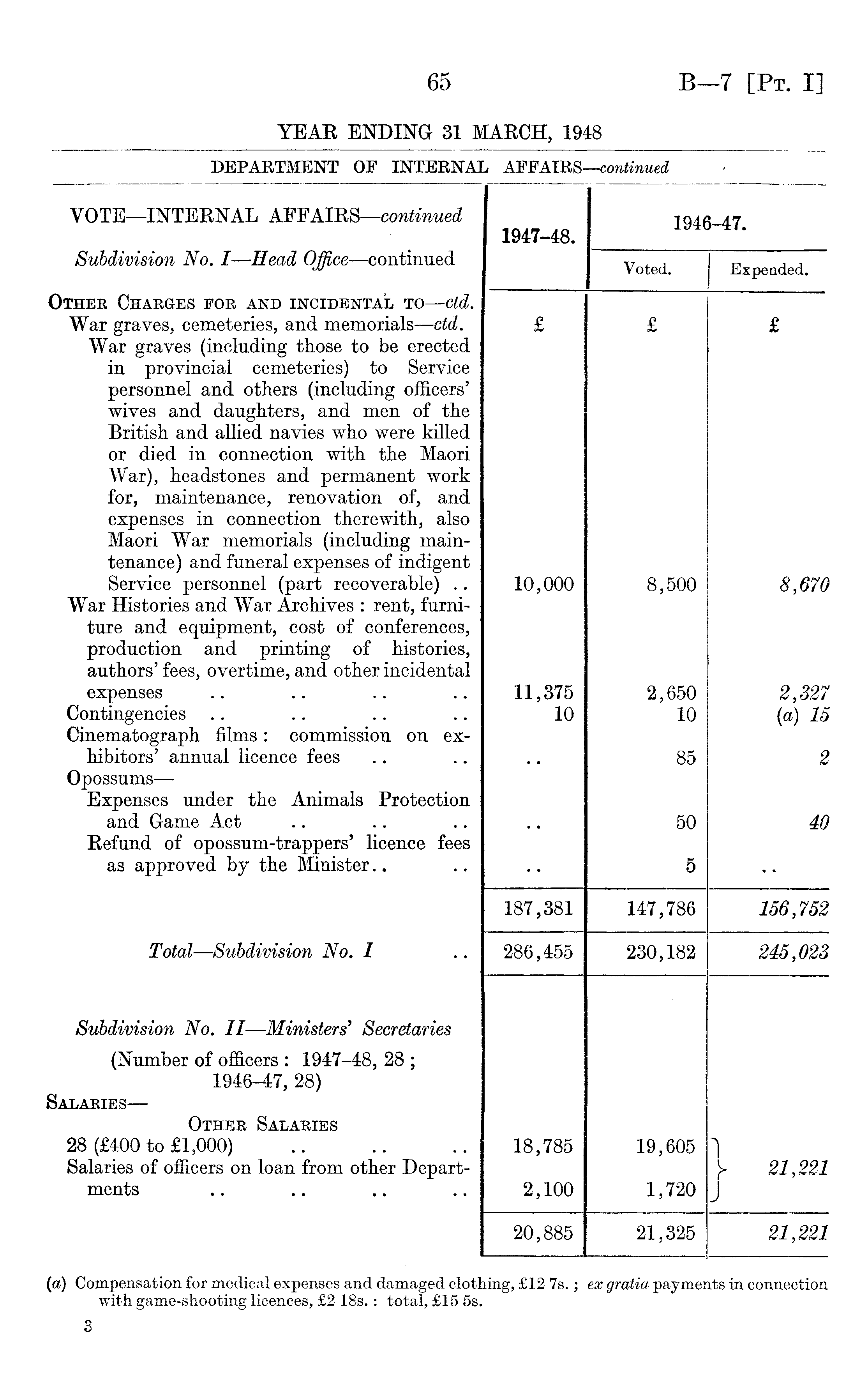VOTE—INTERNAL AFFAIRS —continued 1947-48. 1946-47. Subdivision No. I —Head Office —continued Voted. Expended. Other Charges for and incidental to —ctd. War graves, cemeteries, and memorials —ctd. War graves (including those to be erected in provincial cemeteries) to Service personnel and others (including officers' wives and daughters, and men of the British and allied navies who were killed or died in connection with the Maori War), headstones and permanent work for, maintenance, renovation of, and expenses in connection therewith, also Maori War memorials (including maintenance) and funeral expenses of indigent Service personnel (part recoverable) .. War Histories and War Archives : rent, furniture and equipment, cost of conferences, production and printing of histories, authors' fees, overtime, and other incidental expenses Contingencies Cinematograph films: commission on exhibitors' annual licence fees Opossums— Expenses under the Animals Protection and Game Act Refund of opossum-trappers' licence fees as approved by the Minister.. £ 10,000 11,375 10 £ 8,500 2,650 10 85 50 5 £ 8,670 2,327 (a) 15 2 40 187,381 147,786 156,752 Total —Subdivision No. I 286,455 230,182 245,023 Subdivision No. II—Ministers' Secretaries (Number of officers : 1947-48, 28 ; 1946-47, 28) Salaries— Other Salaries 28 (£400 to £1,000) Salaries of officers on loan from other Departments 18,785 2,100 19,605 1,720 1 y 21,221 20,885 21,325 21,221 (a) Compensation for medical expenses and damaged clothing, £12 7s.; with game-shooting licences, £2 18s. : total, £15 5s. ex gratia payments in connection
