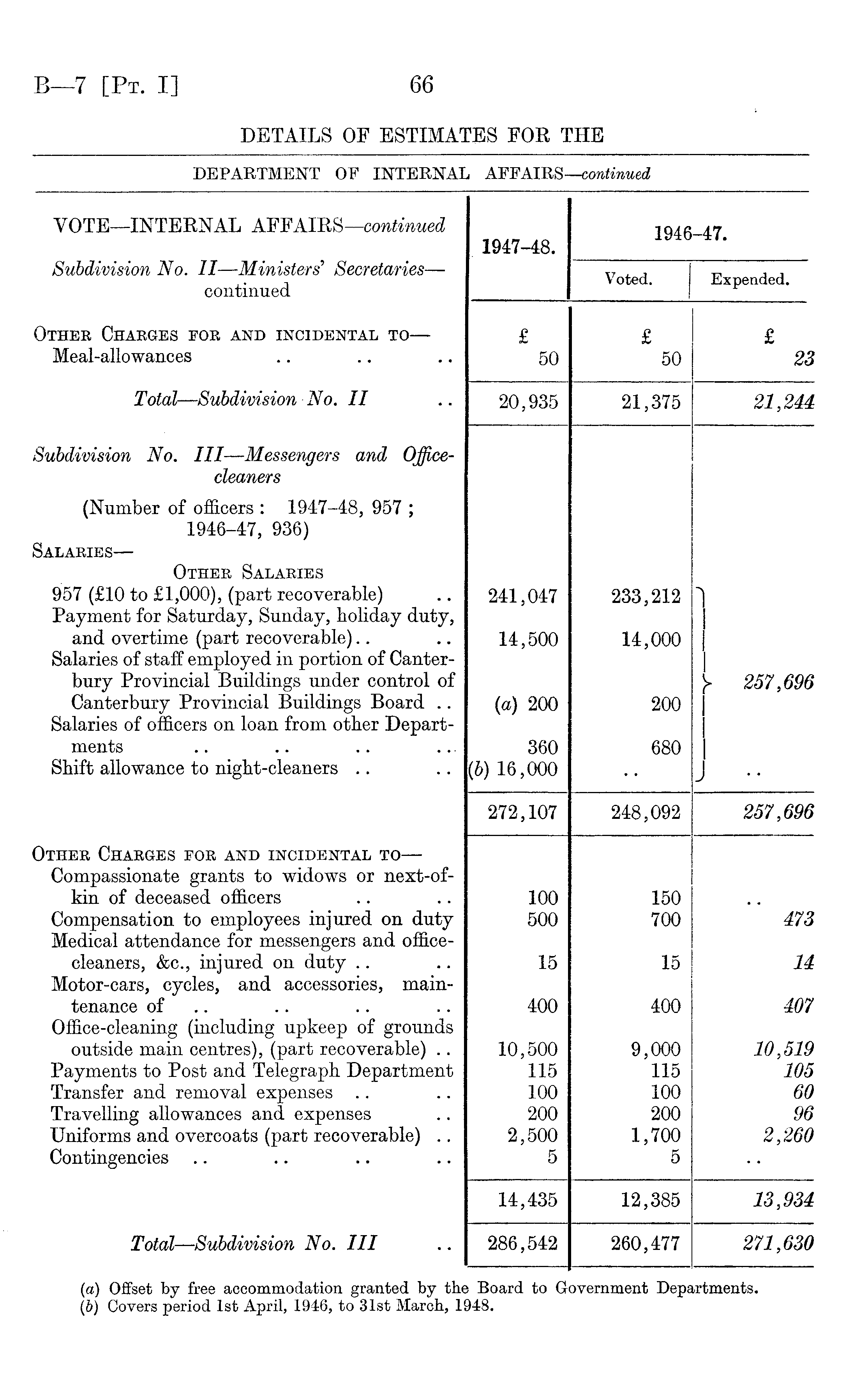 VOTE—INTERNAL AFFAIRS—continued 1947-48. 1946-47. Subdivision No. 11 —Ministers' Secretaries — continued Voted. Expended. Other Charges for and incidental to — Meal-allowances '£ 50 £ 50 £ 23 Total —Subdivision No. II 20,935 21,375 21,244 Subdivision No. Ill —Messengers and Officecleaners (Number of officers : 1947-48, 957 ; 1946-47, 936) Salaries— Other Salaries 957 (£10 to £1,000), (part recoverable) Payment for Saturday, Sunday, holiday duty, and overtime (part recoverable) Salaries of staff employed in portion of Canterbury Provincial Buildings under control of Canterbury Provincial Buildings Board .. Salaries of officers on loan from other Departments Shift allowance to night-cleaners 241,047 14,500 (a) 200 360 (b) 16,000 233,212 14,000 200 680 \ > 257,696 272,107 248,092 257,696 Other Charges for and incidental to — Compassionate grants to widows or next-of-kin of deceased officers Compensation to employees injured on duty Medical attendance for messengers and officecleaners, &c., injured on duty Motor-cars, cycles, and accessories, maintenance of Office-cleaning (including upkeep of grounds outside main centres), (part recoverable) .. Payments to Post and Telegraph Department Transfer and removal expenses Travelling allowances and expenses Uniforms and overcoats (part recoverable) .. Contingencies 100 500 15 400 10,500 115 100 200 2,500 5 150 700 15 400 9,000 115 100 200 1,700 5 473 14 407 10,519 105 60 96 2,260 14,435 12,385 13,934 Total —Subdivision No. Ill 286,542 260,477 271,630