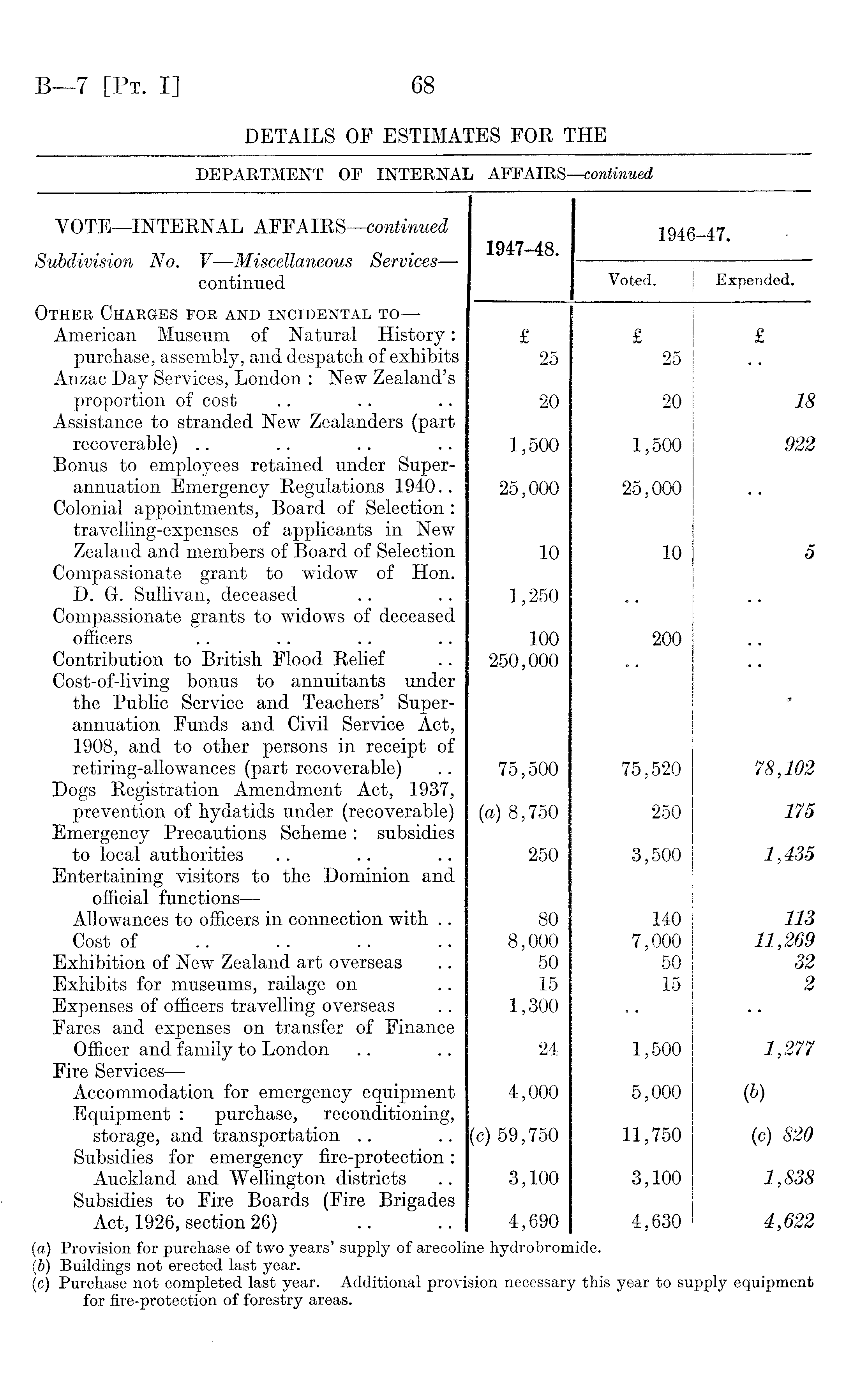 VOTE—INTERNAL AFFAIRS—continued 104fi—47. Subdivision No. V —Miscellaneous Services — 1947-48. continued Voted. Expended. Other Charges for and incidental to — American Museum of Natural History: £ £ £ purchase, assembly, and despatch of exhibits 25 25 Anzac Day Services, London : New Zealand's proportion of cost 20 20 18 Assistance to stranded New Zealanders (part recoverable) 1,500 1,500 922 Bonus to employees retained under Superannuation Emergency Regulations 1940.. 25,000 25,000 Colonial appointments, Board of Selection: travelling-expenses of applicants in New Zealand and members of Board of Selection 10 10 5 Compassionate grant to widow of Hon. D. Gr. Sullivan, deceased 1,250 Compassionate grants to widows of deceased officers .. .. 100 200 Contribution to British Flood Relief 250,000 Cost-of-living bonus to annuitants under the Public Service and Teachers' Super- !*■ annuation Funds and Civil Service Act, 1908, and to other persons in receipt of retiring-allowances (part recoverable) 75,500 75,520 78,102 Dogs Registration Amendment Act, 1937, prevention of hydatids under (recoverable) {a) 8,750 250 175 Emergency Precautions Scheme: subsidies to local authorities 250 3,500 1,435 Entertaining visitors to the Dominion and official functions — Allowances to officers in connection with .. 80 140 113 Cost of 8,000 7,000 11,269 Exhibition of New Zealand art overseas 50 50 32 Exhibits for museums, railage on Expenses of officers travelling overseas 15 15 2 1,300 . , Fares and expenses on transfer of Finance Officer and family to London 24 1,500 1,277 Fire Services — Accommodation for emergency equipment 4,000 5,000 (&) Equipment : purchase, reconditioning, storage, and transportation (c) 59,750 11,750 (c) 820 Subsidies for emergency fire-protection: Auckland and Wellington districts 3,100 3,100 1,838 Subsidies to Fire Boards (Fire Brigades Act, 1926, section 26) 4,690 4,630 4,622