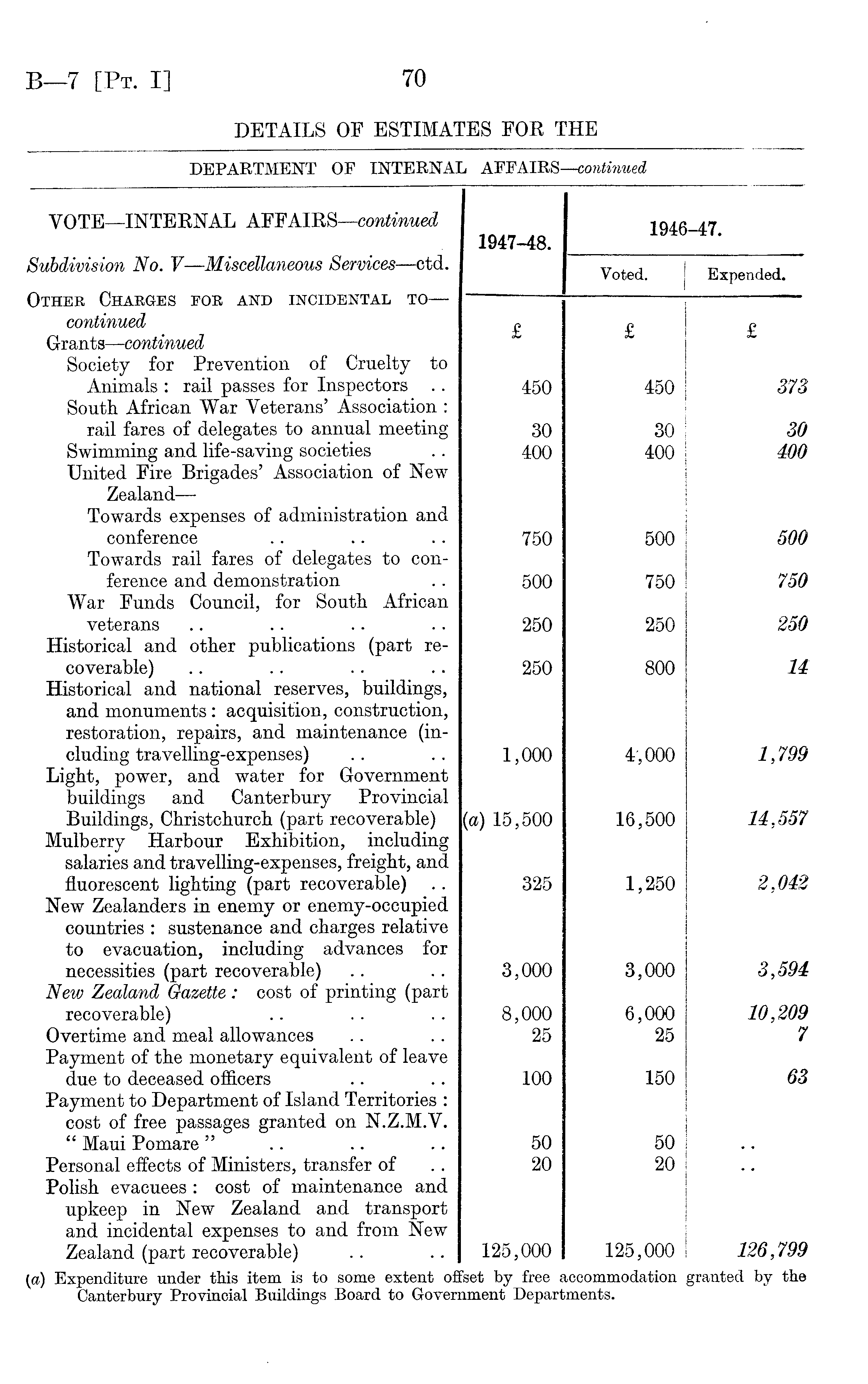 VOTE—INTERNAL AFFAIRS —continued lQ4-fi-4.7 1947-48. Subdivision No. V —Miscellaneous Services —ctd. Other Charges for and incidental to — Voted. Expended. continued p p £ Grants —continued J* X X. Society for Prevention of Cruelty to Animals : rail passes for Inspectors .. South African War Veterans' Association: 450 450 373 rail fares of delegates to annual meeting 30 30 30 Swimming and life-saving societies United Fire Brigades' Association of New 400 400 400 Zealand — Towards expenses of administration and conference 750 500 500 Towards rail fares of delegates to conference and demonstration 500 750 750 War Funds Council, for South African veterans 250 250 250 Historical and other publications (part recoverable) 250 800 14 Historical and national reserves, buildings, and monuments: acquisition, construction, restoration, repairs, and maintenance (including travelling-expenses) 1,000 4,000 1,799 Light, power, and water for Government buildings and Canterbury Provincial Buildings, Christchurch (part recoverable) {a) 15,500 16,500 14,557 Mulberry Harbour Exhibition, including salaries and travelling-expenses, freight, and fluorescent lighting (part recoverable) .. 325 1,250 2,042 New Zealanders in enemy or enemy-occupied countries : sustenance and charges relative to evacuation, including advances for necessities (part recoverable) 3,000 3,000 3,594 New Zealand Gazette : cost of printing (part recoverable) 8,000 6,000 10,209 Overtime and meal allowances 25 25 7 Payment of the monetary equivalent of leave 63 due to deceased officers 100 150 Payment to Department of Island Territories : cost of free passages granted on N.Z.M.Y. " Maui Pomare " 50 50 , . Personal effects of Ministers, transfer of 20 20 . # Polish evacuees : cost of maintenance and upkeep in New Zealand and transport and incidental expenses to and from New Zealand (part recoverable) 125,000 125,000 126,799 la) Expenditure under this item is to some extent offset by free accommodation granted by the Canterbury Provincial Buildings Board to Government Departments.