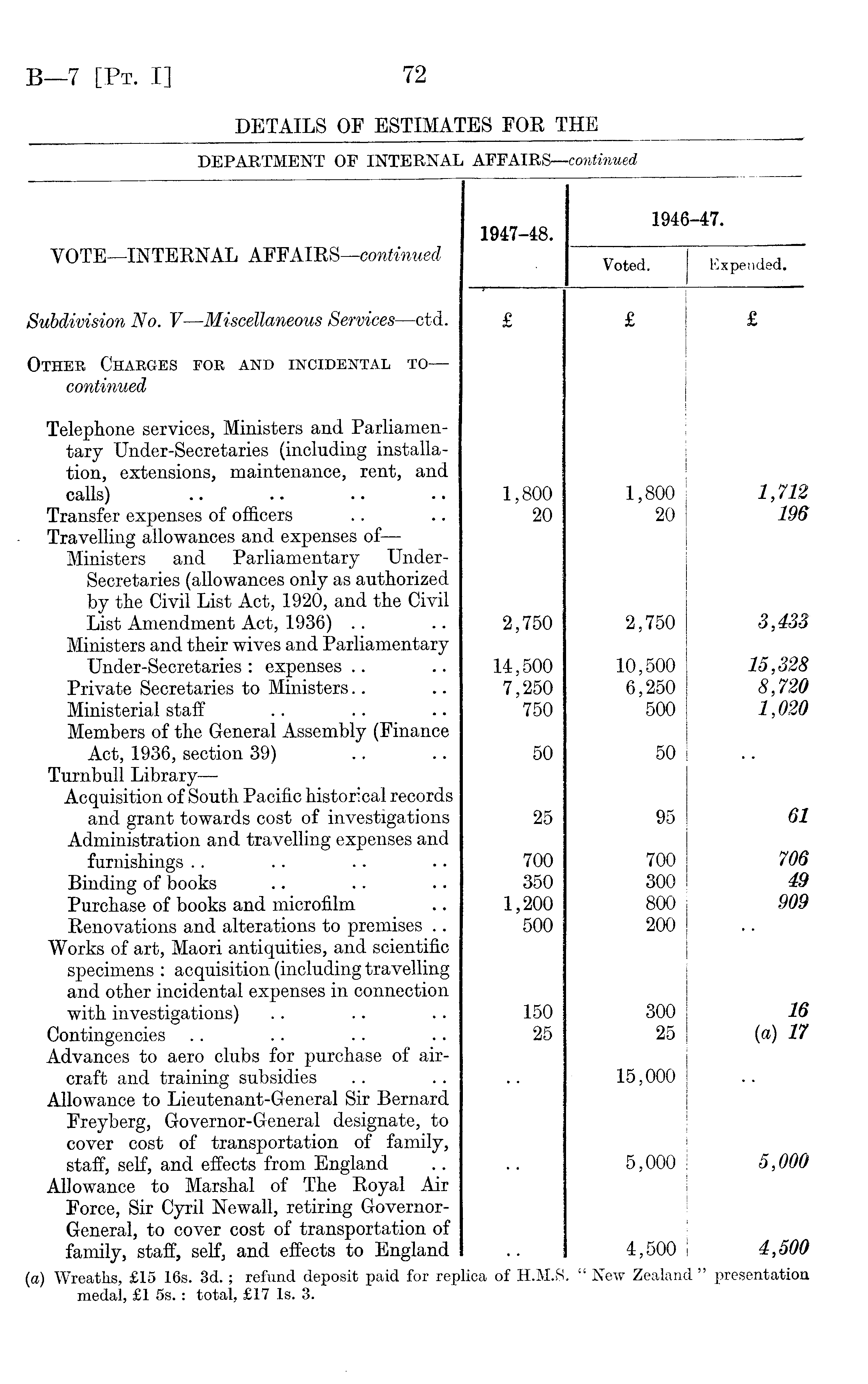 1946-47. 1947-48. VOTE —INTERNAL AFFAIRS —continued Voted. Expended. Subdivision No. V —Miscellaneous Services —ctd. £ £ £ Other Charges for and incidental to — continued Telephone services, Ministers and Parliamentary Under-Secretaries (including installation, extensions, maintenance, rent, and calls) 1,800 1,800 1,712 Transfer expenses of officers 20 20 196 Travelling allowances and expenses of — Ministers and Parliamentary UnderSecretaries (allowances only as authorized by the Civil List Act, 1920, and the Civil List Amendment Act, 1936) 2,750 2,750 3,433 Ministers and their wives and Parliamentary Under-Secretaries : expenses 14,500 10,500 15,328 Private Secretaries to Ministers 7,250 6,250 8,720 Ministerial staff 750 500 1,020 Members of the General Assembly (Finance Act, 1936, section 39) 50 50 Turnbull Library— Acquisition of South Pacific historical records 61 and grant towards cost of investigations 25 95 Administration and travelling expenses and 706 furnishings 700 700 Binding of books 350 300 49 Purchase of books and microfilm 1,200 800 909 Renovations and alterations to premises .. 500 200 Works of art, Maori antiquities, and scientific specimens : acquisition (including travelling and other incidental expenses in connection with investigations) 150 300 16 Contingencies 25 25 (a) 17 Advances to aero clubs for purchase of aircraft and training subsidies 15,000 Allowance to Lieutenant-General Sir Bernard Freyberg, Governor-General designate, to cover cost of transportation of family, 5,000 staff, self, and effects from England 5,000 Allowance to Marshal of The Royal Air Force, Sir Cyril Newall, retiring GovernorGeneral, to cover cost of transportation of 4,500 family, staff, self, and effects to England 4,500 (a) Wreaths, £15 16s. 3d.; refund deposit paid for replica of H.M.S. " New Zealand " presentation medal, £1 5s.: total, £17 Is. 3.