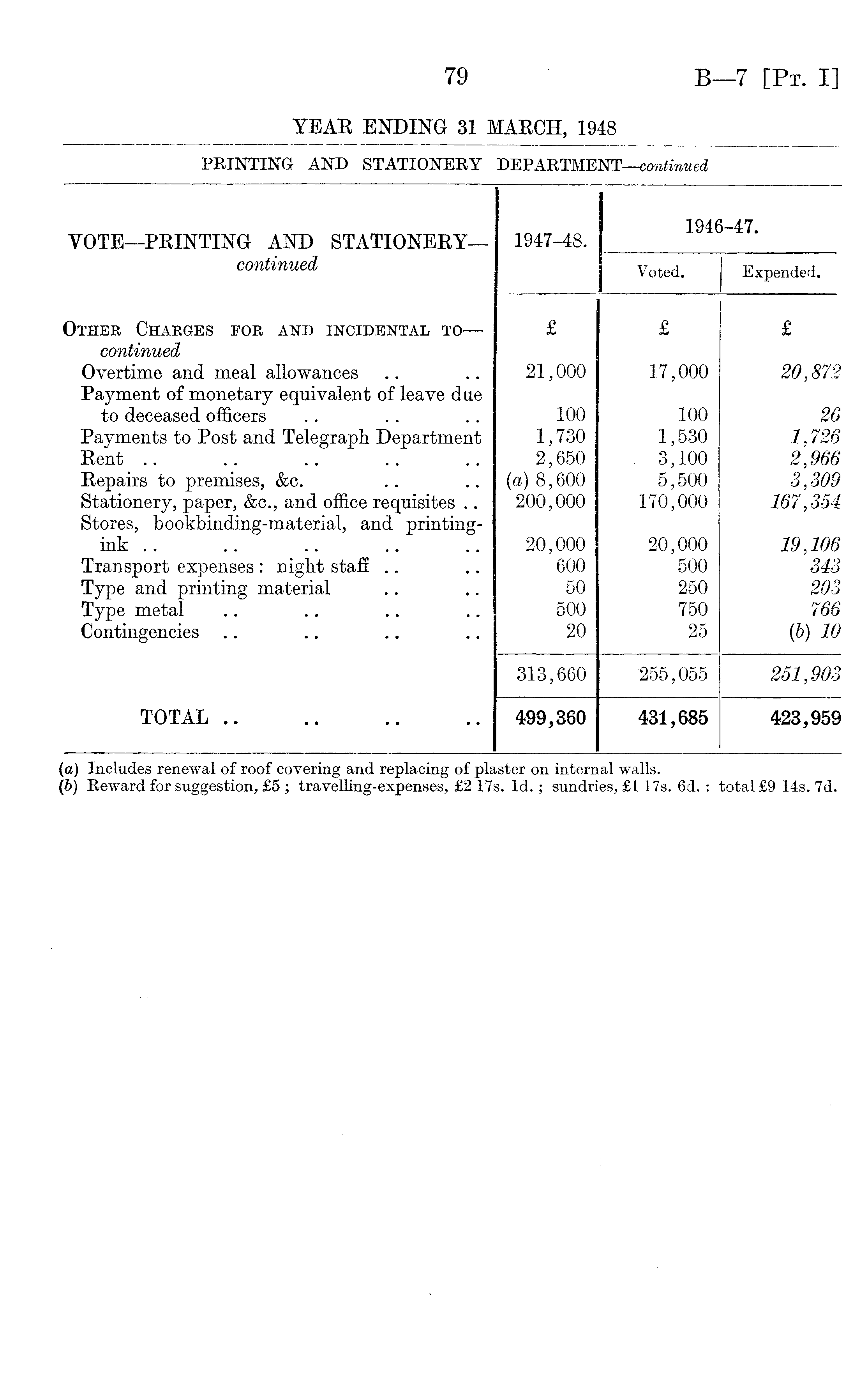 VOTE—PRINTING AND STATIONERY— 1947-48. 1946-47. continued Voted. Expended. Other Charges for and incidental to — continued Overtime and meal allowances Payment of monetary equivalent of leave due to deceased officers Payments to Post and Telegraph Department Rent Repairs to premises, &c. Stationery, paper, &c., and office requisites .. Stores, bookbinding-material, and printingink Transport expenses: night stafi Type and printing material Type metal Contingencies £ 21,000 100 1,730 2,650 (a) 8,600 200,000 20,000 600 50 500 20 £ 17,000 100 1,530 . 3,100 5,500 170,000 20,000 500 250 750 25 £ 20,872 26 1,726 2,966 3,309 167,354 19,106 343 203 766 (b) 10 313,660 '255,055 251,903 TOTAL .. 499,360 431,685 423,959