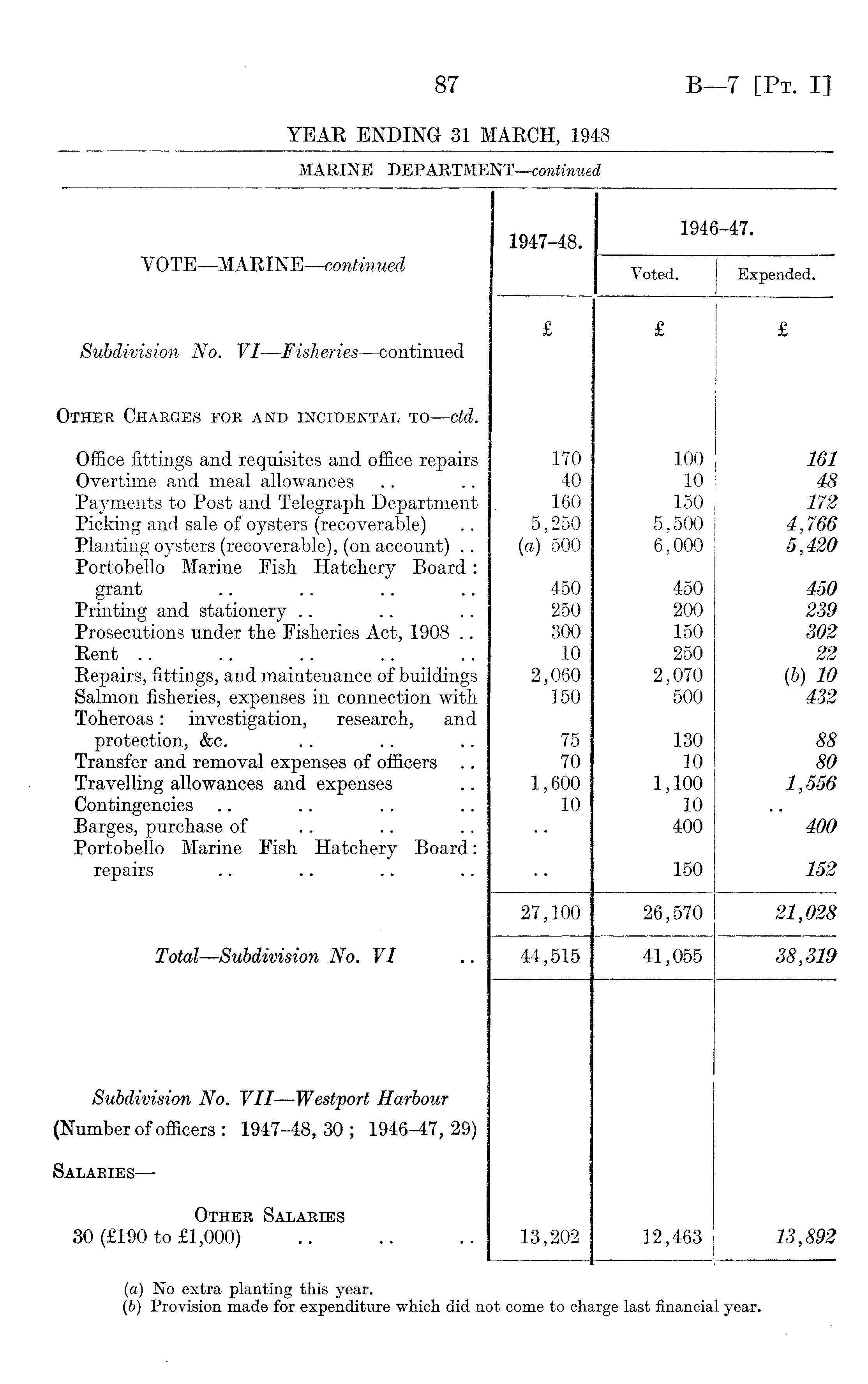 1947-48. 1946-47. Y OTE—MARINE—continued Voted. Expended. £ £ £ Subdivision No. VI—Fisheries —continued Other Charges for and incidental to —ctd. Office fittings and requisites and office repairs 170 100 161 Overtime and meal allowances 40 10 48 Payments to Post and Telegraph Department 160 150 172 Picking and sale of oysters (recoverable) 5,250 5,500 4,766 Planting oysters (recoverable), (on account) .. (a) 500 6,000 5,420 Portobello Marine Fish Hatchery Board: grant 450 450 450 Printing and stationery 250 200 239 Prosecutions under the Fisheries Act, 1908 .. 300 150 302 Rent .. .. .. 10 250 22 Repairs, fittings, and maintenance of buildings 2,060 2,070 (b) 10 Salmon fisheries, expenses in connection with 150 500 432 Toheroas: investigation, research, and protection, &c. 75 130 88 Transfer and removal expenses of officers .. 70 10 80 Travelling allowances and expenses 1,600 1,100 1,556 Contingencies 10 10 Barges, purchase of 400 400 Portobello Marine Fish Hatchery Board: repairs 150 152 27,100 26,570 21,028 Total—Subdivision No. VI 44,515 41,055 38,319 Subdivision No. VII—Westport Harbour (Number of officers : 1947-48, 30 ; 1946-47, 29) Salaries— Other Salaries 30 (£190 to £1,000) 13,202 12,463 13,892
