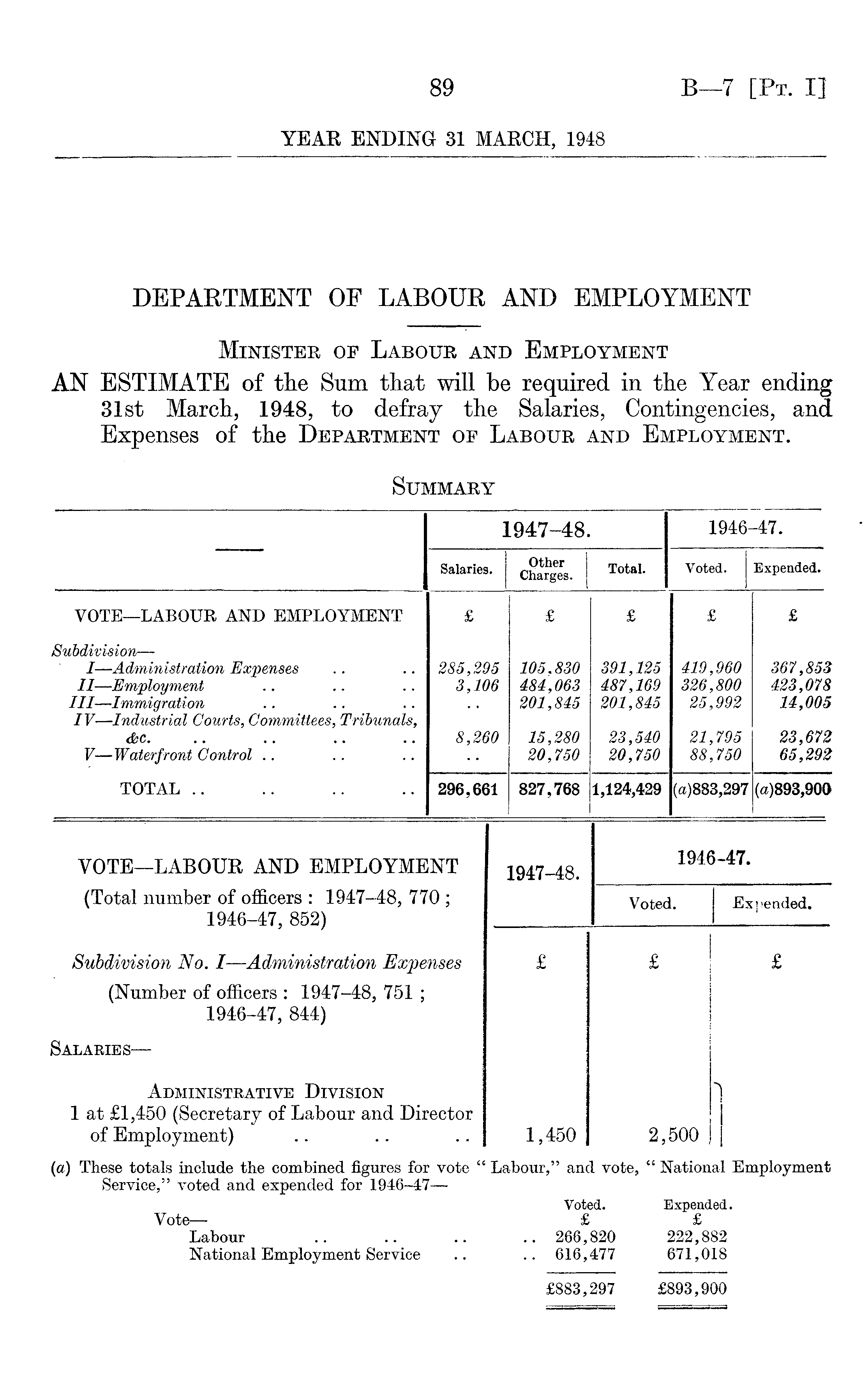 1947-48. 1946-47. Salaries. Other Charges. Total. Voted. Expended. VOTE—LABOUR AND EMPLOYMENT £ £ £ £ £ Subdivision— I—Administration Expenses II—Employment III—Immigration IV—Industrial Courts, Committees, Tribunals, &C. V—Waterfront Control 285,295 3,106 8,260 105.830 484,063 201,845 15,280 20,750 391,125 487,169 201,845 23,540 20,750 419,960 326,800 25,992 21,795 88,750 367,853 423,078 14,005 23,672 65,292 TOTAL .. 296,661 827,768 1,124,429 (a)883,297 (a)893,900 VOTE—LABOUR AND EMPLOYMENT 1947-48. 1946-47. (Total number of officers : 1947-48, 770 ; 1946-47, 852) Subdivision No. I —Administration Expenses Voted. Expended. £ £ £ (Number of officers : 1947-48, 751 ; 1946-47, 844) Salaries — Administrative Division 1 at £1,450 (Secretary of Labour and Director of Employment) .. 1,450 2,500
