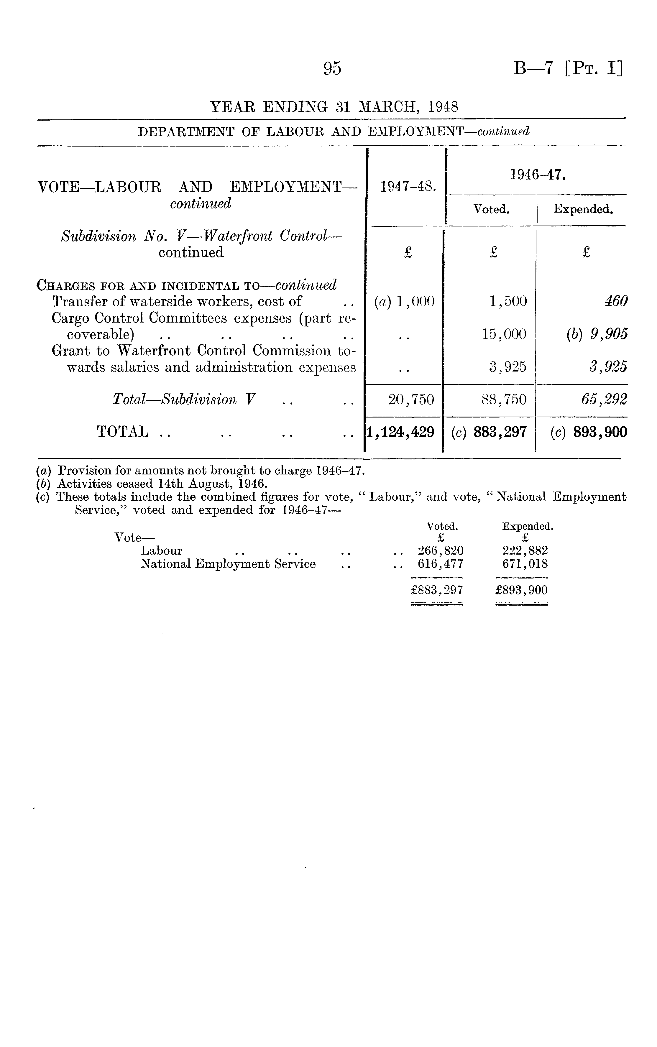 (а) Provision for amounts not brought to charge 1946-47. (б) Activities ceased 14th August, 1946. (c) These totals include the combined figures for vote, " Labour," and vote, " National Employment Service," voted and expended for 1946-47 Voted. Expended. Vote— £ £ Labour .. .. .. .. 266,820 222,882 National Employment Service .. .. 616,477 671,018 £883,297 £893,900
