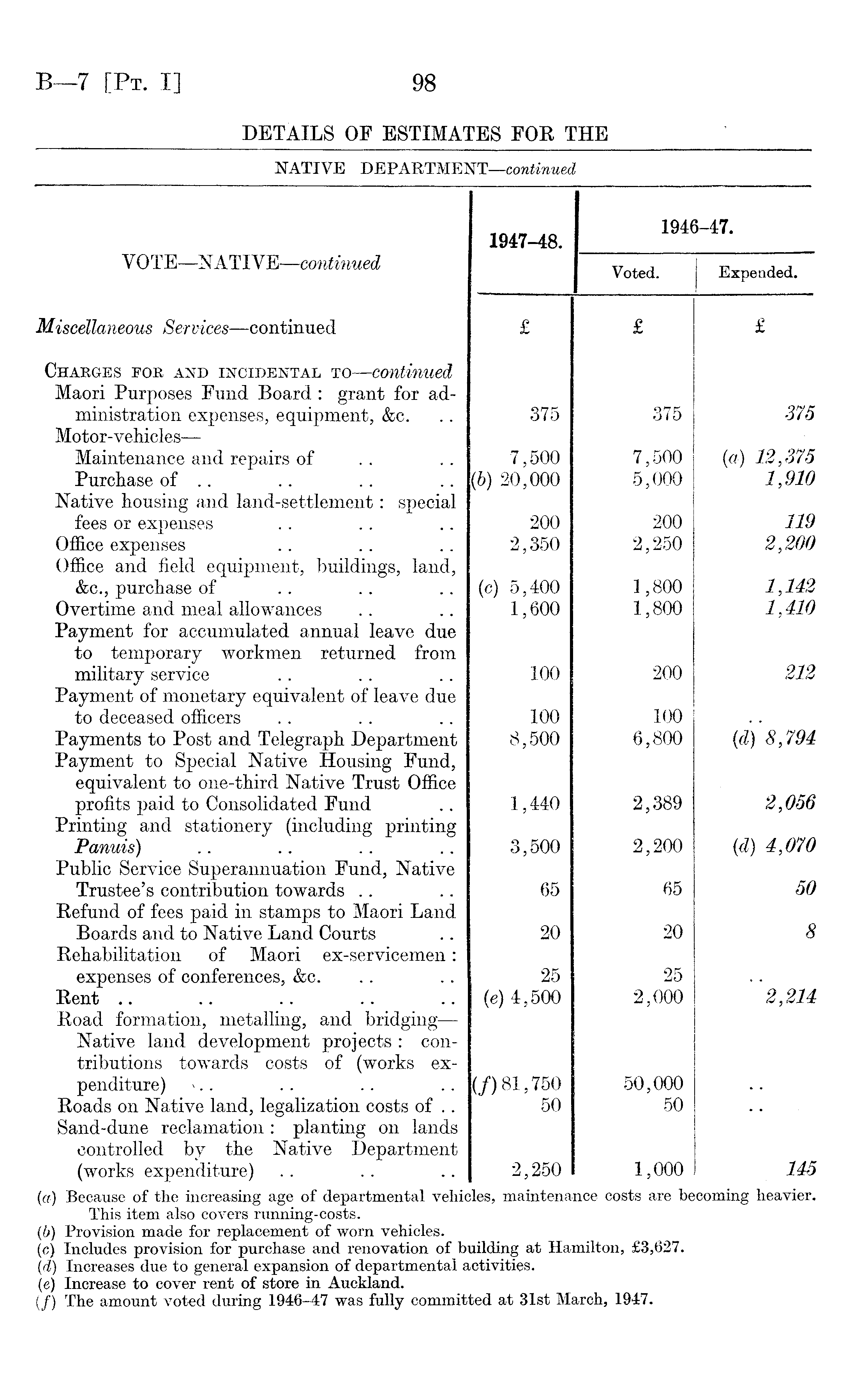 (a) Because of the increasing age of departmental vehicles, maintenance costs are becoming heavier. This item also covers running-costs. (b) Provision made for replacement of worn vehicles. (c) Includes provision for purchase and renovation of building at Hamilton, £3,627. (d) Increases due to general expansion of departmental activities. (e) Increase to cover rent of store in Auckland. (/) The amount voted during 1946-47 was fully committed at 31st March, 1947.