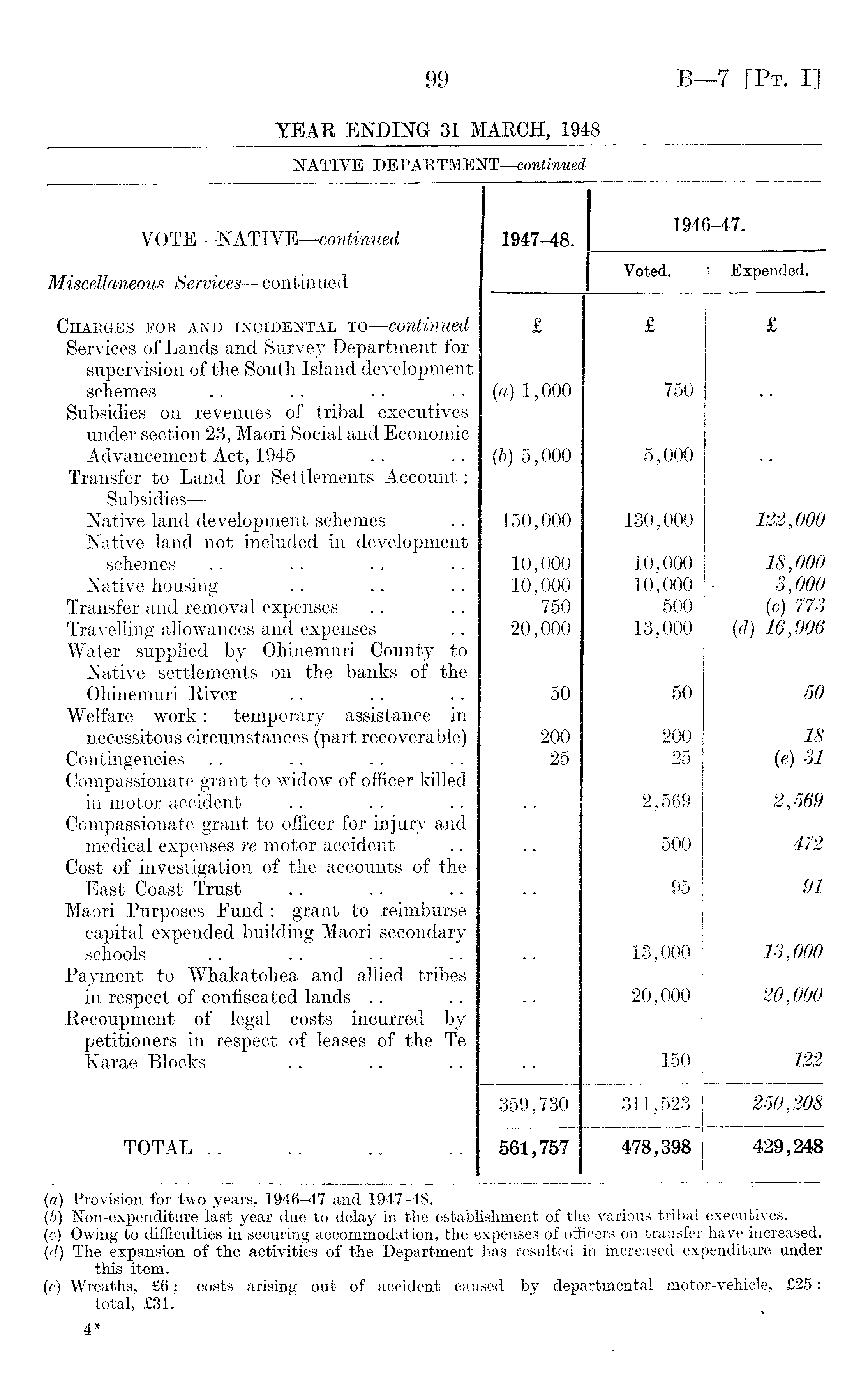 (a) Provision for two years, 1946-47 and 1947-48. (b) Non-expenditure last year due to delay in the establishment of the various tribal executives. (c) Owing to difficulties in securing accommodation, the expenses of officers on transfer have increased. (d) The expansion of the activities of the Department has resulted in increased expenditure under this item. (e) Wreaths, £6; costs arising out of accident caused by departmental motor-vehicle, £25: total, £3l.