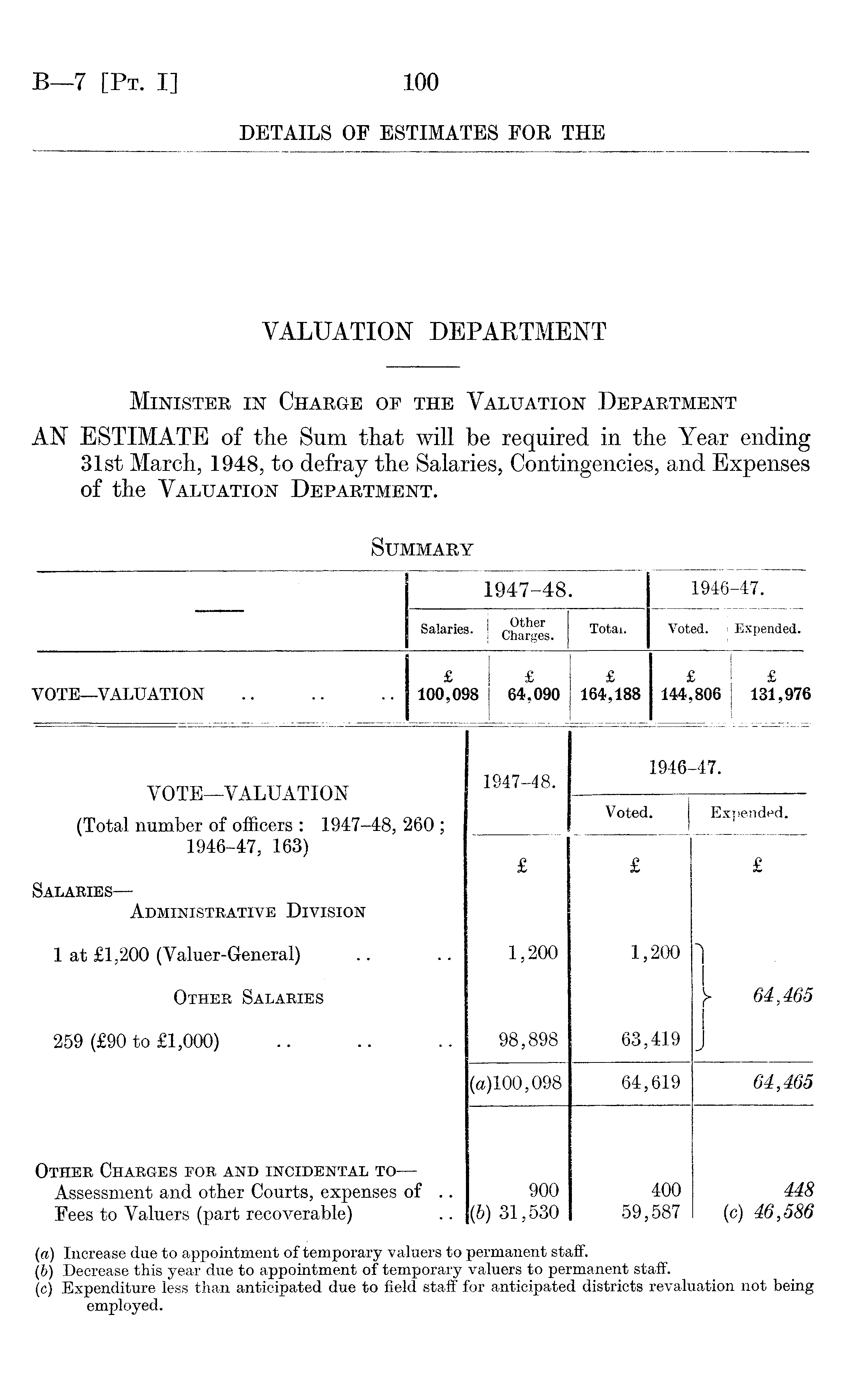 (a) Increase due to appointment of temporary valuers to permanent staff. (6) Decrease this year due to appointment of temporary valuers to permanent staff, (c) Expenditure less than anticipated due to field staff for anticipated districts revaluation not being employed.