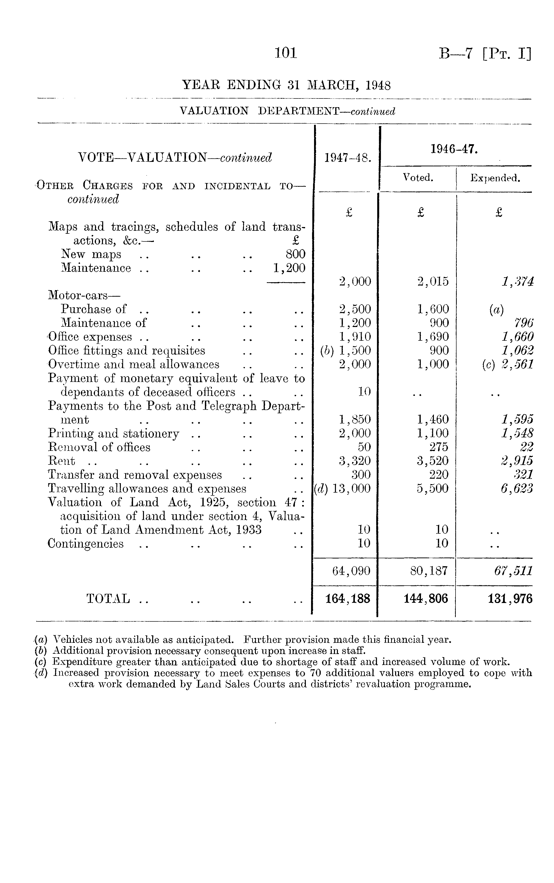 •(a) Vehicles not available as anticipated. Further provision made this financial year. (b) Additional provision necessary consequent upon increase in staff. (c) Expenditure greater than anticipated due to shortage of staff and increased volume of work. {d) Increased provision necessary to meet expenses to 70 additional valuers employed to cope with extra work demanded by Land Sales Courts and districts' revaluation programme.
