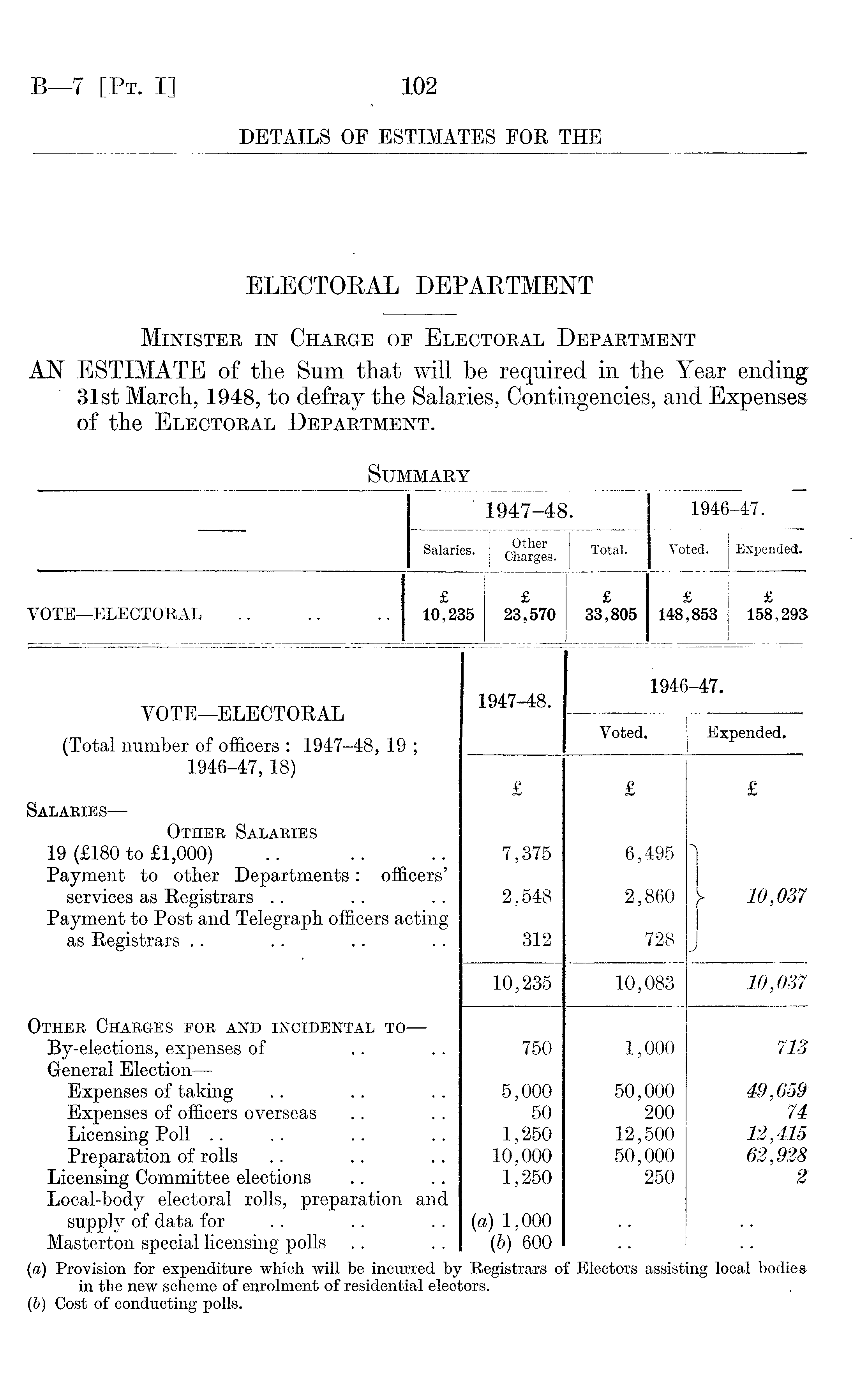 1947-48. 1946-47. Salaries. Other Charges. Total. Voted. Expended. VOTE—ELECTORAL £ 10,235 £ 23,570 £ 33,805 £ 148,853 £ 158,293 VOTE—ELECTORAL (Total number of officers : 1947-48, 19 ; 1946-47,18) Salaries — Other Salaries 19 (£180 to £1,000) Payment to other Departments: officers' services as Registrars Payment to Post and Telegraph officers acting as Registrars Other Charges for and incidental to — By-elections, expenses of General Election — Expenses of taking Expenses of officers overseas Licensing Poll Preparation of rolls Licensing Committee elections Local-body electoral rolls, preparation and supply of data for Masterton special licensing polls 1947-48. 1946-47. Voted. Expended. £ 7,375 2,548 312 £ 6,495 2,860 728 £ \ y 10,037 J 10,235 10,083 10,037 750 5,000 50 1,250 10,000. 1,250 (a) 1,000 (b) 600 1,000 50,000 200 12,500 50,000 250 713 49,659 74 12,415 62,928 2