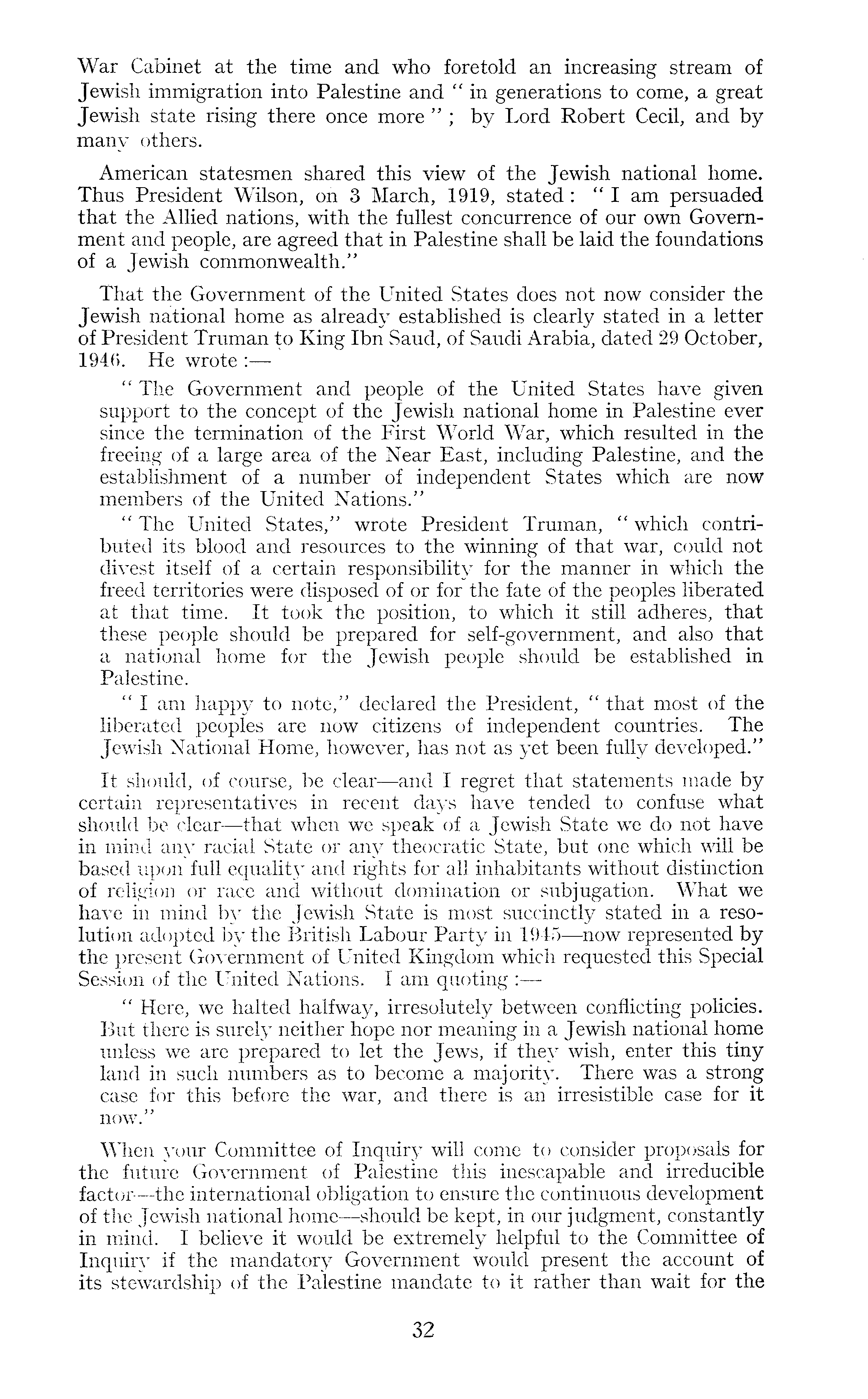 War Cabinet at the time and who foretold an increasing stream of Jewish immigration into Palestine and " in generations to come, a great Jewish state rising there once mote " ; by Lord Robert Cecil, and bymany others. American statesmen shared this view of the Jewish national home. Thus President Wilson, on 3 March, 1919, stated: "I am persuaded that the Allied nations, with the fullest concurrence of our own Government and people, are agreed that in Palestine shall be laid the foundations of a Jewish commonwealth." That the Government of the United States does not now consider the Jewish national home as already established is clearly stated in a letter of President Truman to King Ibn Saud, of Saudi Arabia, dated 29 October, 1946. He wrote : " The Government and people of the United States have given support to the concept of the Jewish national home in Palestine ever since the termination of the First World War, which resulted in the freeing of a large area of the Near East, including Palestine, and the establishment of a number of independent States which are now members of the United Nations." " The United States," wrote President Truman, " which contributed its blood and resources to the winning of that war, could not divest itself of a certain responsibility for the manner in which the freed territories were disposed of or for the fate of the peoples liberated at that time. It took the position, to which it still adheres, that these people should be prepared for self-government, and also that a national home for the Jewish people should be established in Palestine. " I am happy to note," declared the President, " that most of the liberated peoples are now citizens of independent countries. The Jewish National Home, however, has not as yet been fully developed." It should, of course, be clear —and I regret that statements made by certain representatives in recent days have tended to confuse what should be clear—that when we speak of a Jewish State we do not have in mind any racial State or any theocratic State, but one which will be based upon full equality and rights for all inhabitants without distinction of religion or race and without domination or subjugation. What we have in mind by the Jewish State is most succinctly stated in a resolution adopted by the British Labour Party in 1945—n0w represented by the present Government of United Kingdom which requested this Special Session of the United Nations. lam quoting : " Here, we halted halfway, irresolutely between conflicting policies. But there is surely neither hope nor meaning in a Jewish national home unless we are prepared to let the Jews, if they wish, enter this tiny land in such numbers as to become a majority. There was a strong case for this before the war, and there is an irresistible case for it now." When your Committee of Inquiry will come to consider proposals for the future Government of Palestine this inescapable and irreducible factor —the international obligation to ensure the continuous development of the Jewish national home —should be kept, in our judgment, constantly in mind. I believe it would be extremely helpful to the Committee of Inquiry if the mandatory Government would present the account of its stewardship of the Palestine mandate to it rather than wait for the