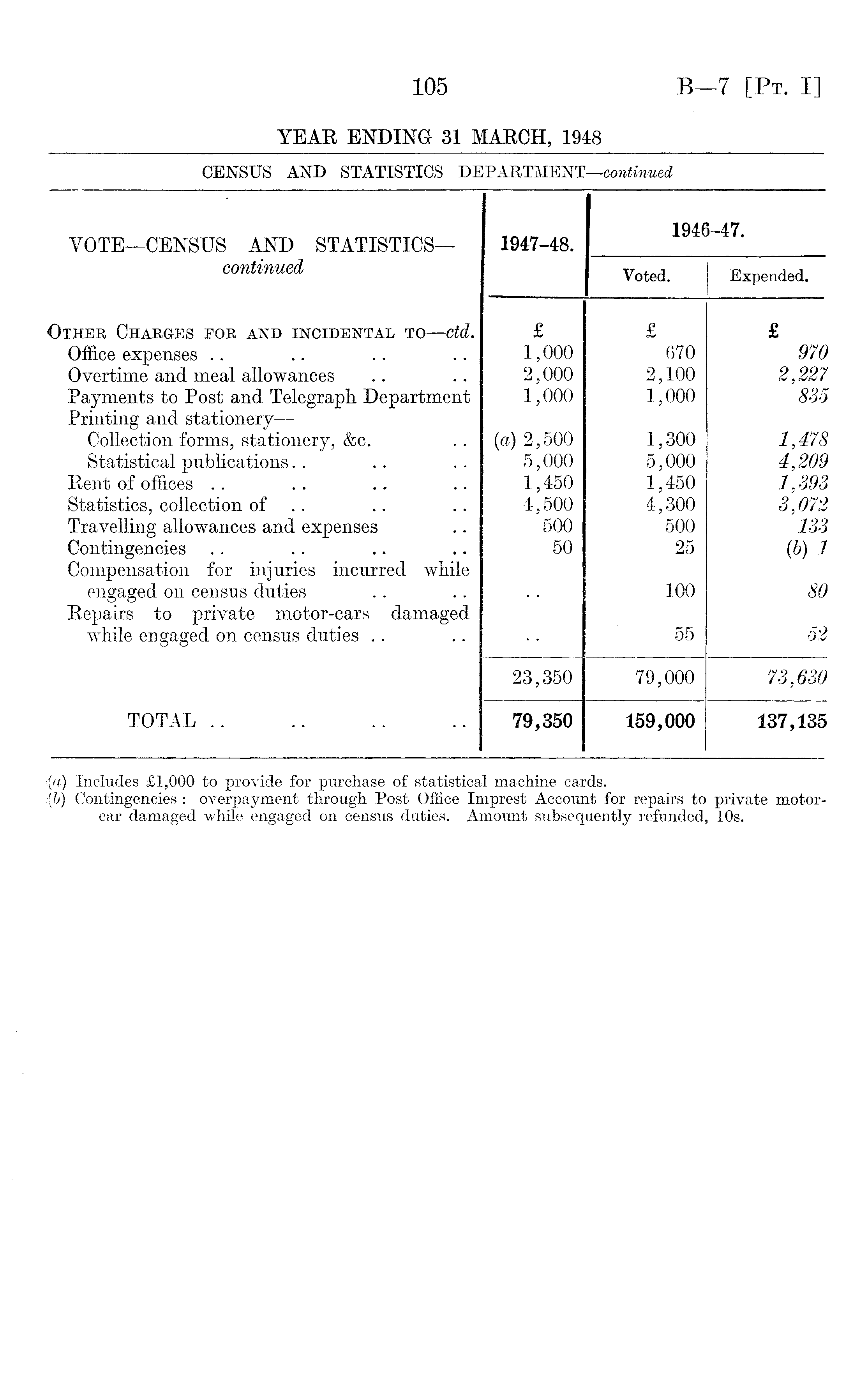 V (a) Includes £l,OOO to provide for purchase of statistical machine cards. (b) Contingencies : overpayment through Post Office Imprest Account for repairs to private motorcar damaged while engaged on census duties. Amount subsequently refunded, 10s.