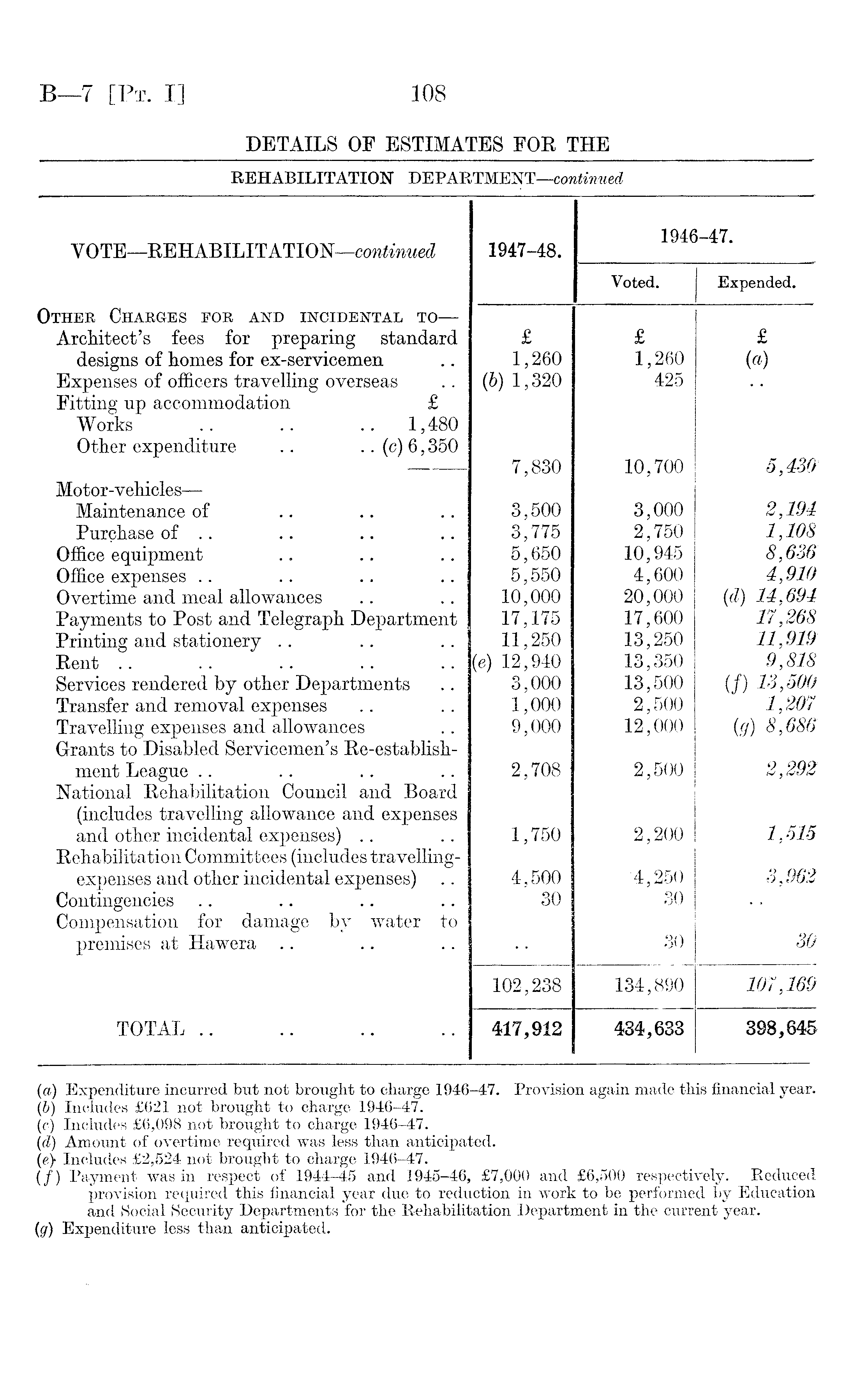 (a) Expenditure incurred but not brought to charge 1946-47. Provision again made this financial year. (6) Includes £621 not brought to charge 1946-47. (c) Includes £6,098 not brought to charge 1946-47. (d) Amount of overtime required was less than anticipated. (e) Includes £2,524 not brought to charge 1946-47. (/) Payment was in respect of 1944-45 and 1945-46, £7,000 and £6,500 respectively. Reduced provision required this financial year due to reduction in work to be performed by Education and Social Security Departments for the Rehabilitation Department in the current year. (g) Expenditure less than anticipated.