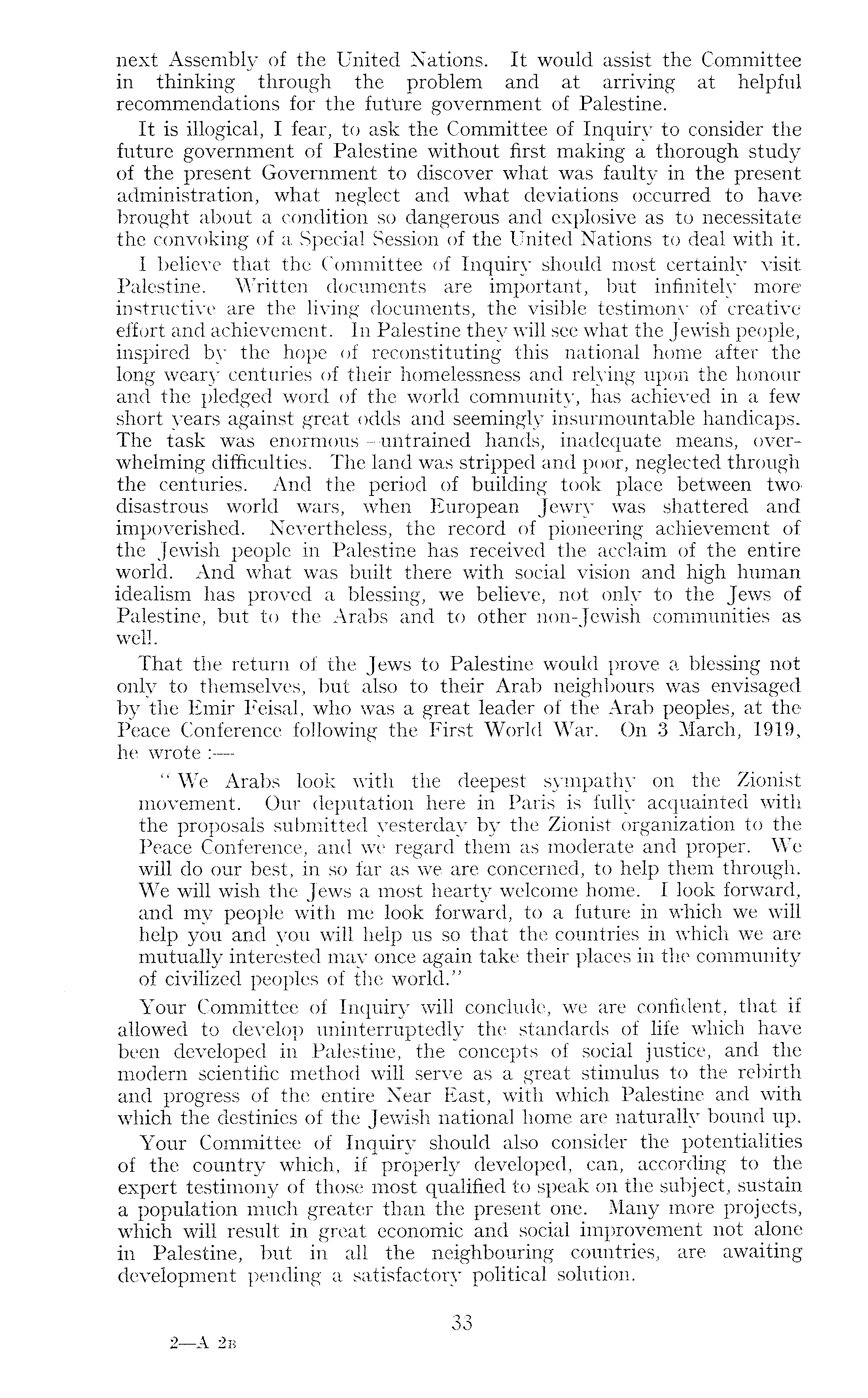 next Assembly of the United Nations. It would assist the Committee in thinking through the problem and at arriving at helpful recommendations for the future government of Palestine. It is illogical, I fear, to ask the Committee of Inquiry to consider the future government of Palestine without first making a thorough study of the present Government to discover what was faulty in the present administration, what neglect and what deviations occurred to have brought about a condition so dangerous and explosive as to necessitate the convoking of a Special Session of the United Nations to deal with it. I believe that the Committee of Inquiry should most certainly visit Palestine. Written documents are important, but infinitely more instructive are the living documents, the visible testimony of creative effort and achievement. In Palestine they will see what the Jewish people, inspired by the hope of reconstituting this national home after the long weary centuries of their homelessness and relying upon the honour and the pledged word of the world community, has achieved in a few short years against great odds and seemingly insurmountable handicaps. The task was enormous —untrained hands, inadequate means, overwhelming difficulties. The land was stripped and poor, neglected through the centuries. And the period of building took place between two> disastrous world wars, when European Jewry was shattered and impoverished. Nevertheless, the record of pioneering achievement of the Jewish people in Palestine has received the acclaim of the entire world. And what was built there with social vision and high human idealism has proved a blessing, we believe, not only to the Jews of Palestine, but to the Arabs and to other non-Jewish communities as well. That the return of the Jews to Palestine would prove a blessing not only to themselves, but also to their Arab neighbours was envisaged by the Emir Feisal, who was a great leader of the Arab peoples, at the Peace Conference following the First World War. On 3 March, 1919, he wrote : "We Arabs look with the deepest sympathy on the Zionist movement. Our deputation here in Paris is fully acquainted with the proposals submitted yesterday by the Zionist organization to the Peace Conference, and we regard them as moderate and proper. We will do our best, in so far as we are concerned, to help them through. We will wish the Jews a most hearty welcome home. I look forward, and my people with me look forward, to a future in which we will help you and you will help us so that the countries in which we are mutually interested may once again take their places in the community of civilized peoples of the world." Your Committee of Inquiry will conclude, we are confident, that if allowed to develop uninterruptedly the standards of life which have been developed in Palestine, the concepts of social justice, and the modern scientific method will serve as a great stimulus to the rebirth and progress of the entire Near East, with which Palestine and with which the destinies of the Jewish national home are naturally bound up. Your Committee of Inquiry should also consider the potentialities of the country which, if properly developed, can, according to the expert testimony of those most qualified to speak on the subject, sustain a population much greater than the present one. Many more projects, which will result in great economic and social improvement not alone in Palestine, but in all the neighbouring countries, are awaiting development pending a satisfactory political solution.