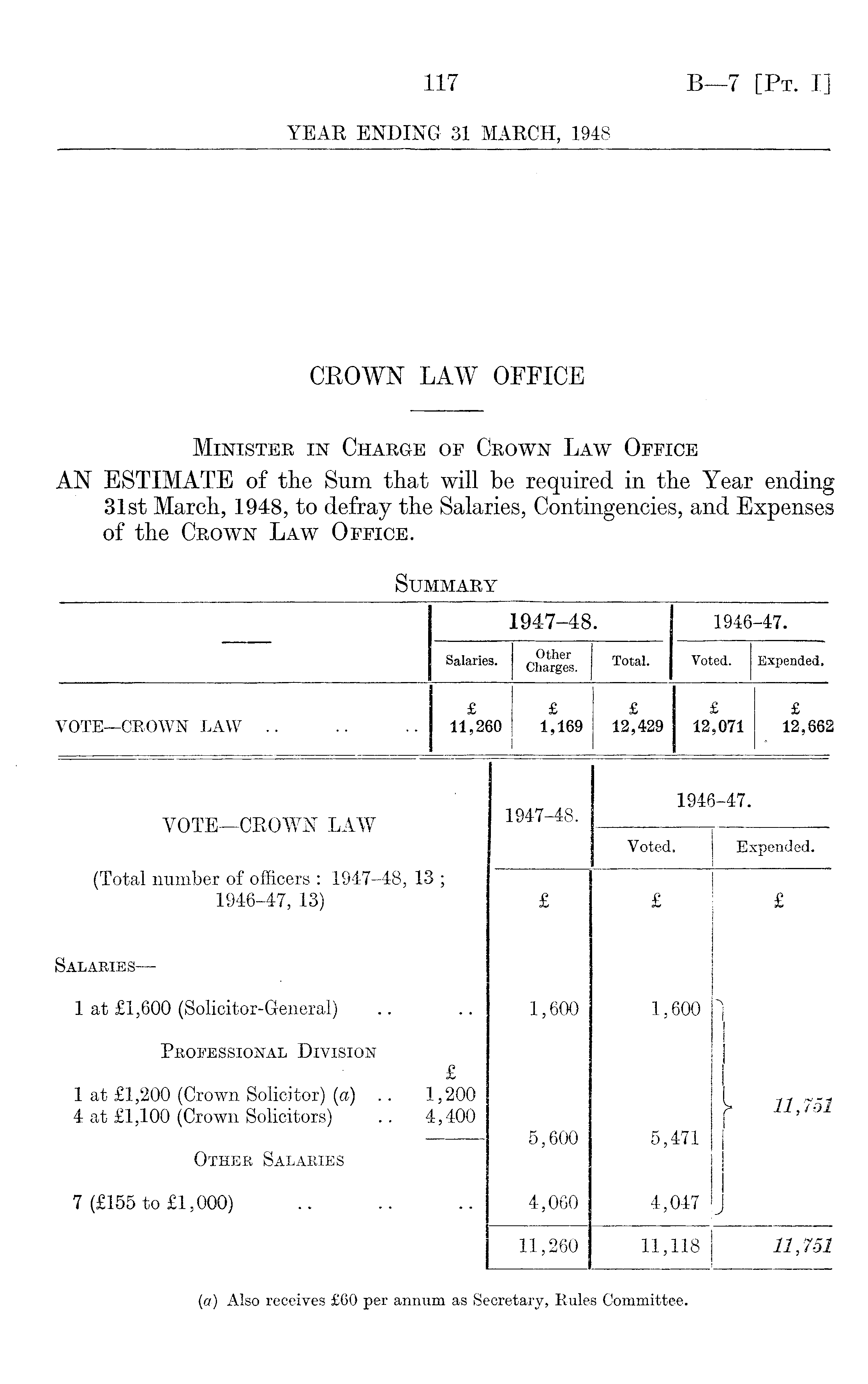 Minister in Charge of Crown Law Office AN ESTIMATE of the Sum that will be required in the Year ending 31st March, 1948, to defray the Salaries, Contingencies, and Expenses of the Crown Law Office. Summary