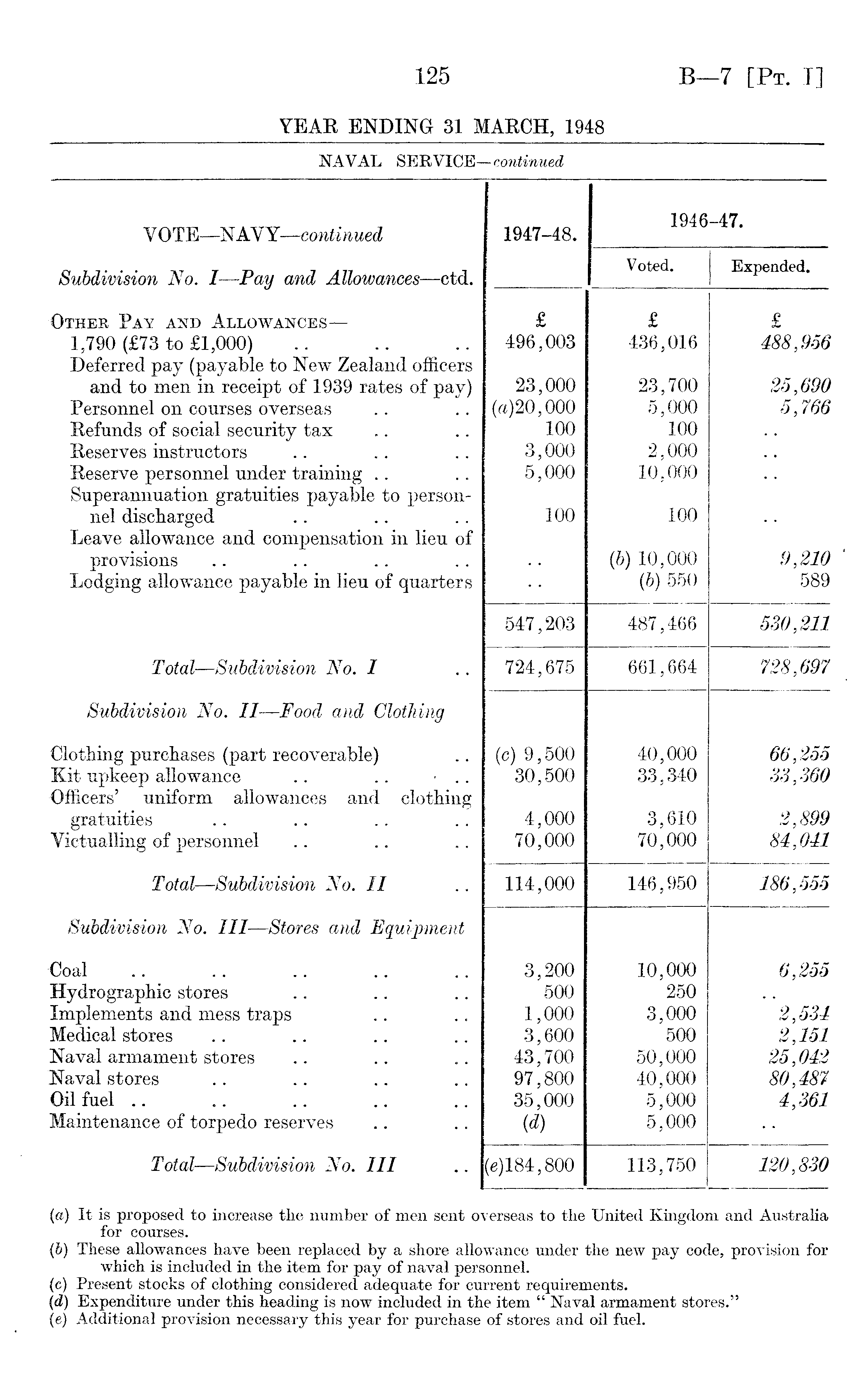 (a) It is proposed to increase the number of men sent overseas to the United Kingdom and Australia for courses. (b) These allowances have been replaced by a shore allowance under the new pay code, provision for which is included in the item for pay of naval personnel. (c) Present stocks of clothing considered adequate for current requirements. (d) Expenditure under this heading is now included in the item " Naval armament stores." (e) Additional provision necessary this year for purchase of stores and oil fuel.
