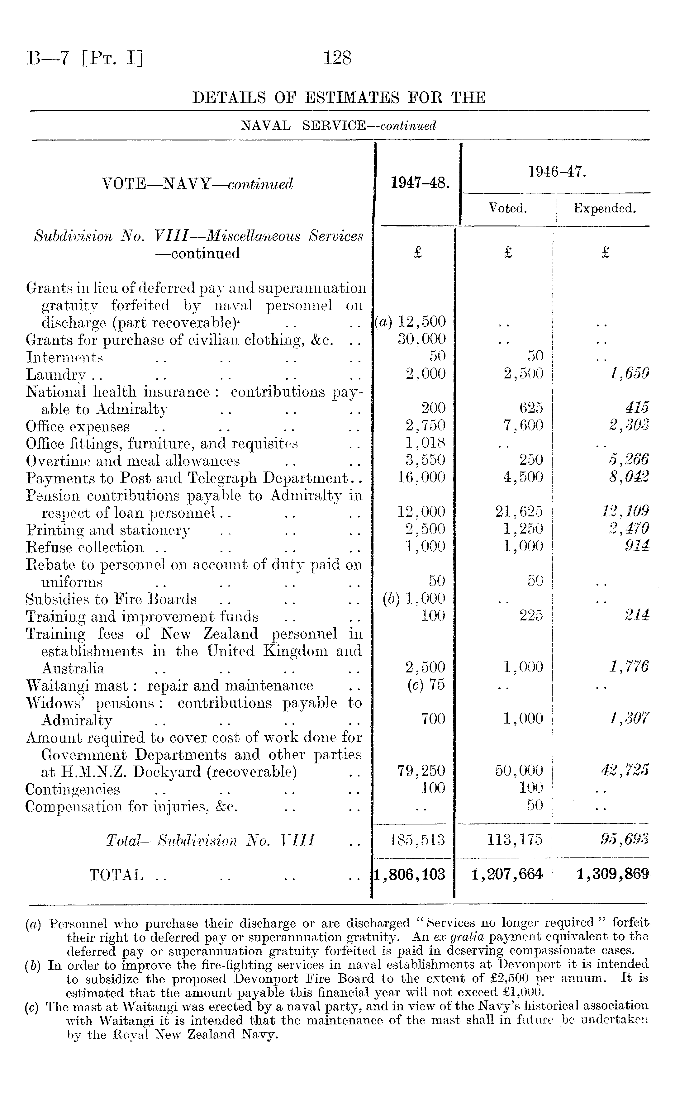 (а) Personnel who purchase their discharge or are discharged " Services no longer required " forfeit their right to deferred pay or superannuation gratuity. An ex gratia payment equivalent to the deferred pay or superannuation gratuity forfeited is paid in deserving compassionate cases. (б) In order to improve the fire-fighting services in naval establishments at Devonport it is intended to subsidize the proposed Devonport Fire Board to the extent of £2,500 per annum. It is estimated that the amount payable this financial year will not exceed £l,OOO. (c) The mast at Waitangi was erected by a naval party, and in view of the Navy's historical association with Waitangi it is intended that the maintenance of the mast shall in future be undertaken by the Royal New Zealand Navy.