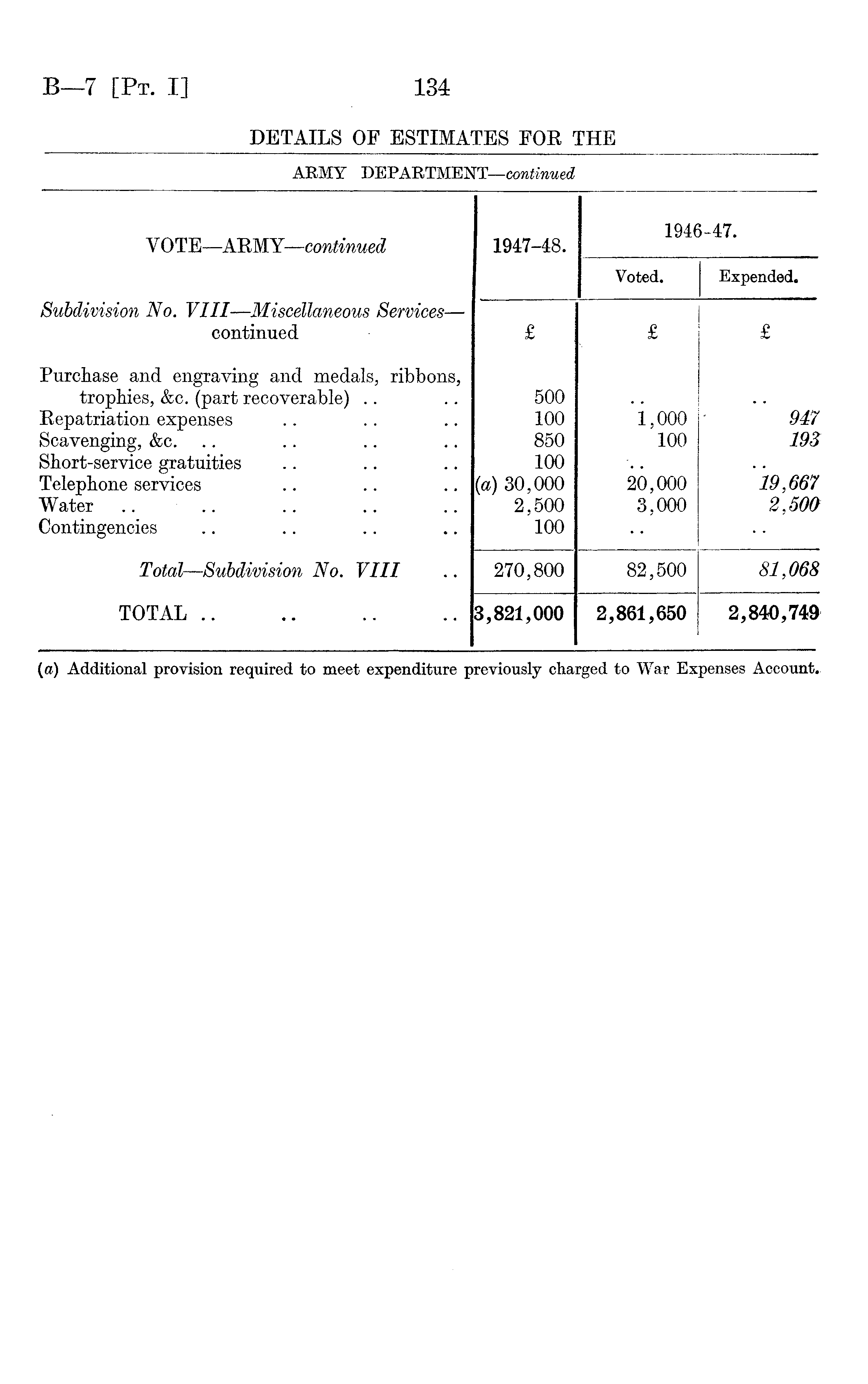 V OTE—ARMY—continued 1947-48. 1946-47. Voted. Expended. Subdivision No. VIII—Miscellaneous Services— continued £ £ £ Purchase and engraving and medals, ribbons, trophies, &c. (part recoverable) Repatriation expenses Scavenging, &c. Short-service gratuities Telephone services Water .. Contingencies 500 100 850 100 (a) 30,000 2,500 100 i,ooo 100 20,000 3,000 947 193 19,667 2,500 Total —Subdivision No. VIII 270,800 82,500 81,068 TOTAL .. 3,821,000 2,861,650 2,840,749 (a) Additional provision required to meet expenditure previously charged to War Expenses Account*