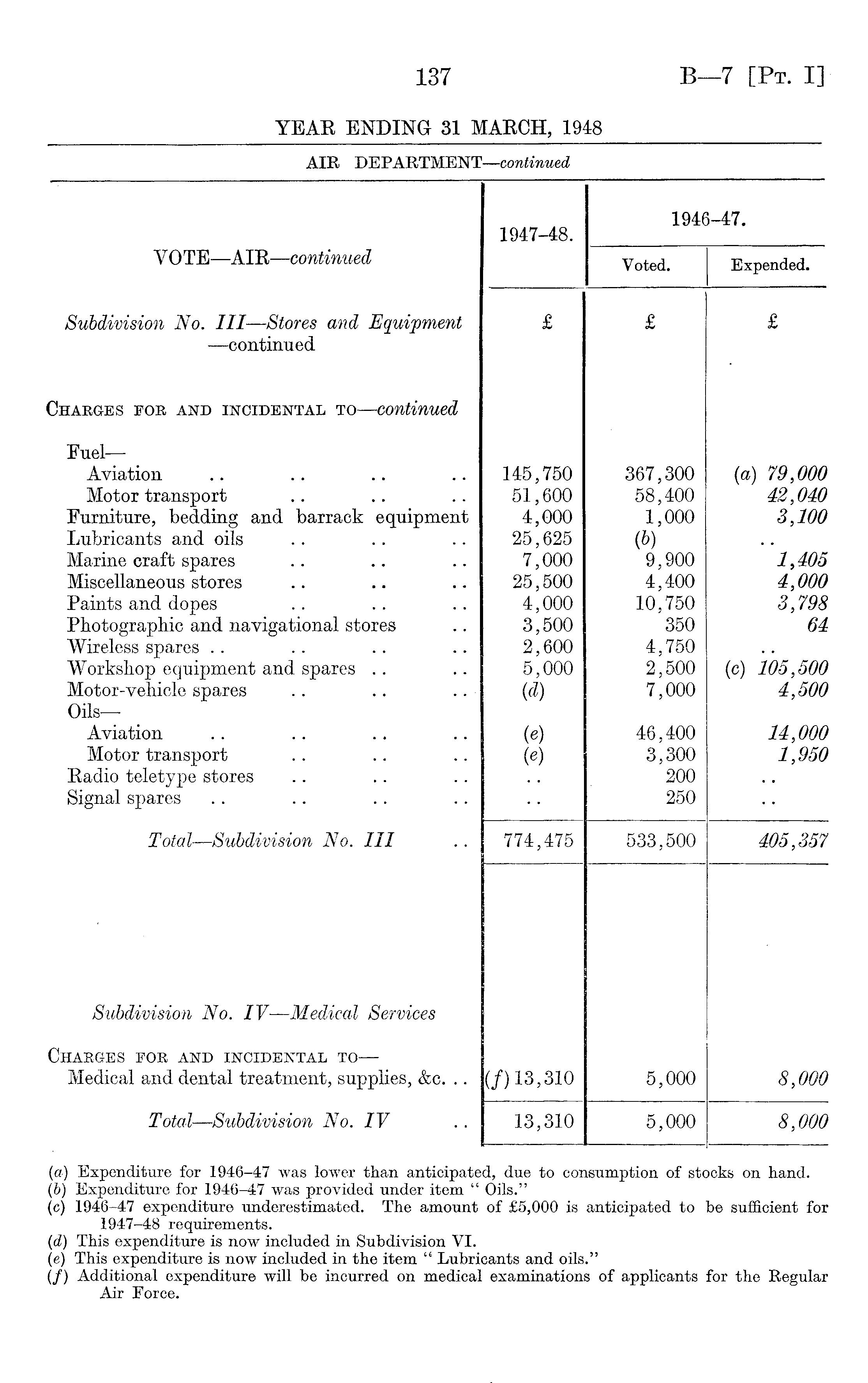 (a) Expenditure for 1946-47 was lower than anticipated, due to consumption of stocks on hand. (b) Expenditure for 1946-47 was provided under item " Oils." (c) 1946-47 expenditure underestimated. The amount of £5,000 is anticipated to be sufficient for 1947-48 requirements. (d) This expenditure is now included in Subdivision VI. (e) This expenditure is now included in the item " Lubricants and oils." (/) Additional expenditure will be incurred on medical examinations of applicants for the Regular Air Force.